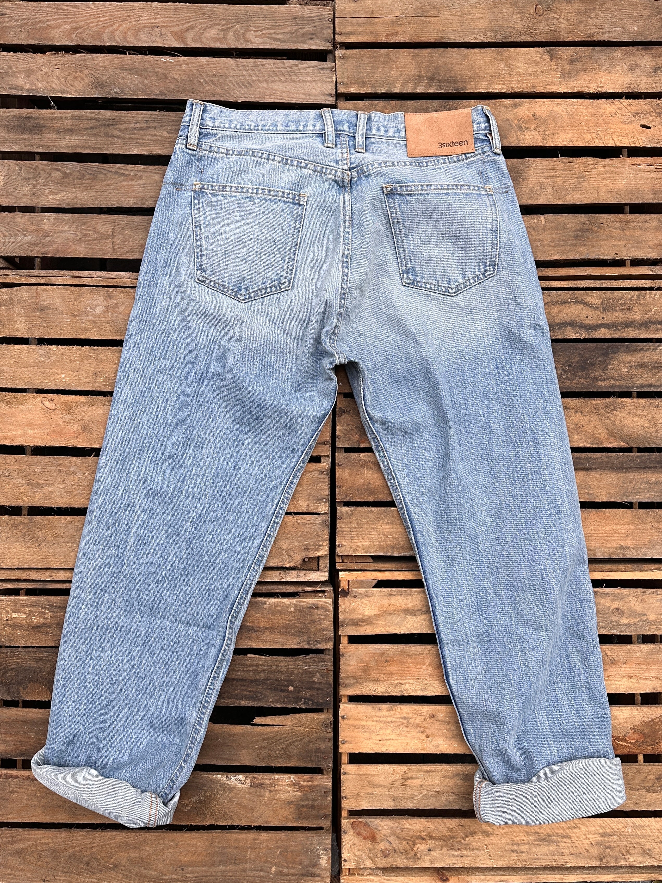 The CS-100x utilizes the 3sixteen flagship 100x indigo selvedge denim that they have featured for over 15 years, which is custom woven exclusively for them by Kuroki Mills. New comes this Jeans in a stonewashed version, 3sixteen calls it vintage wash. Their CS cut is based off a vintage 1947 501 fit and features a straight back yoke that results in a higher rise. The Jean has a full thigh and has a slight taper to the leg opening.