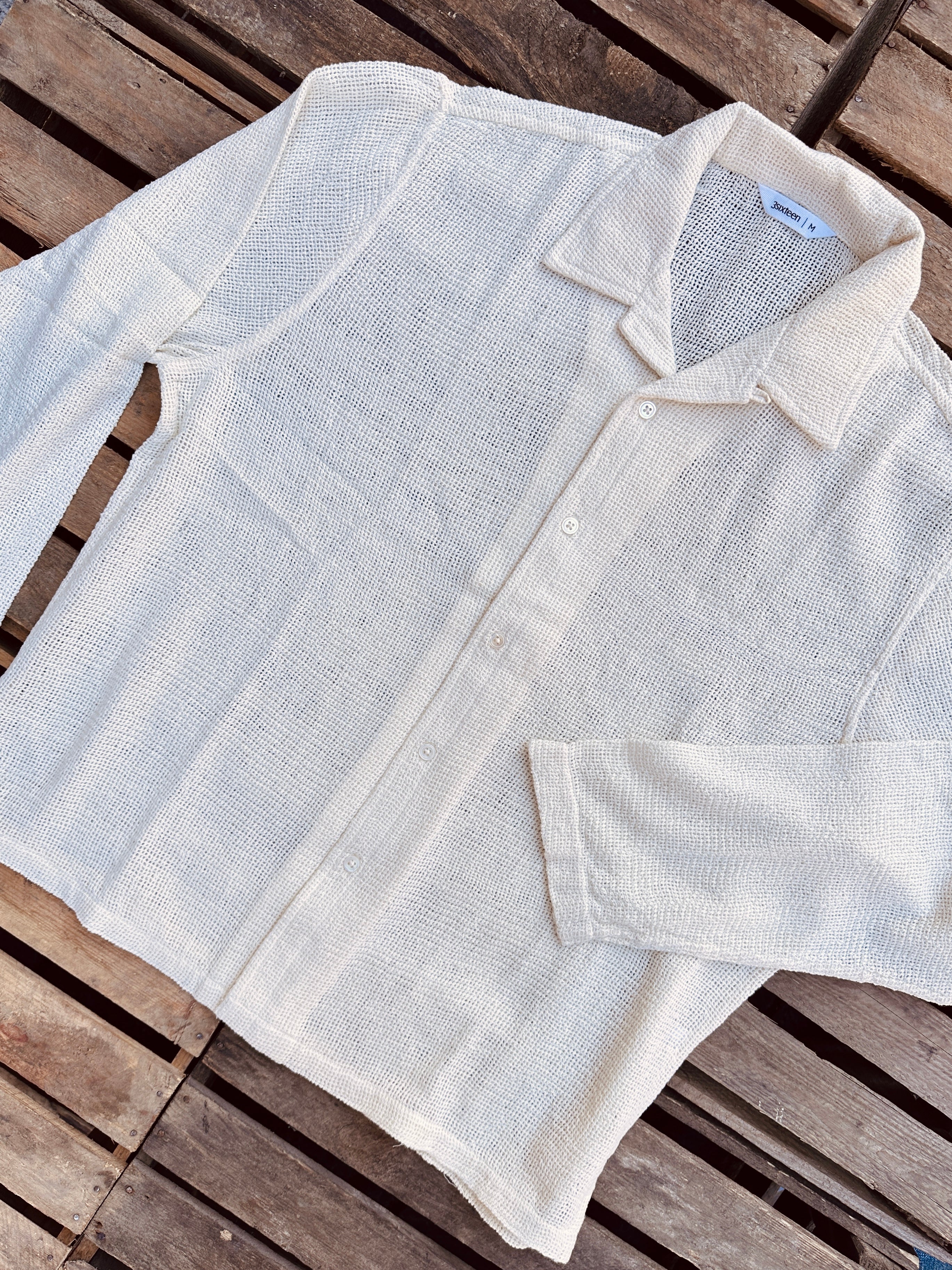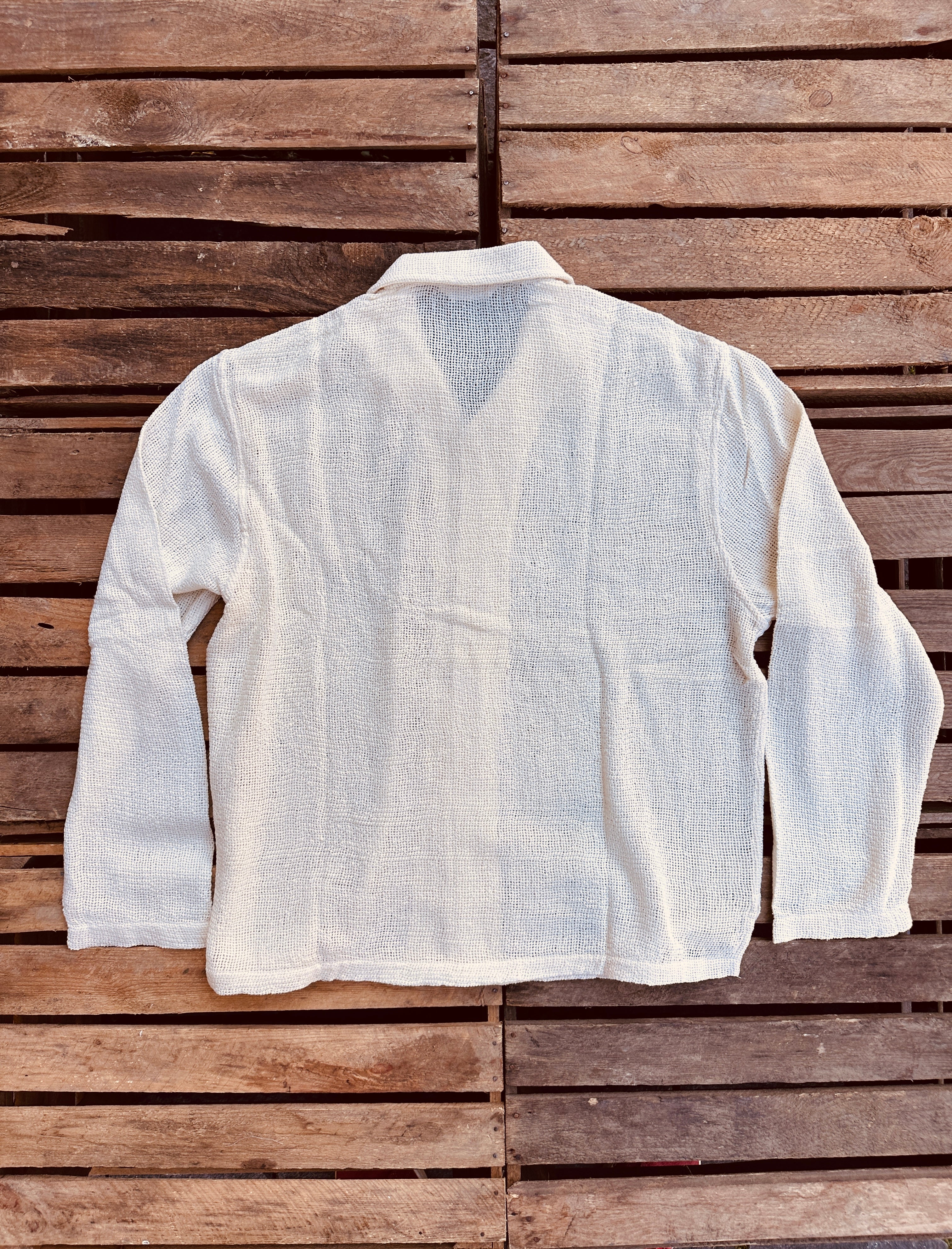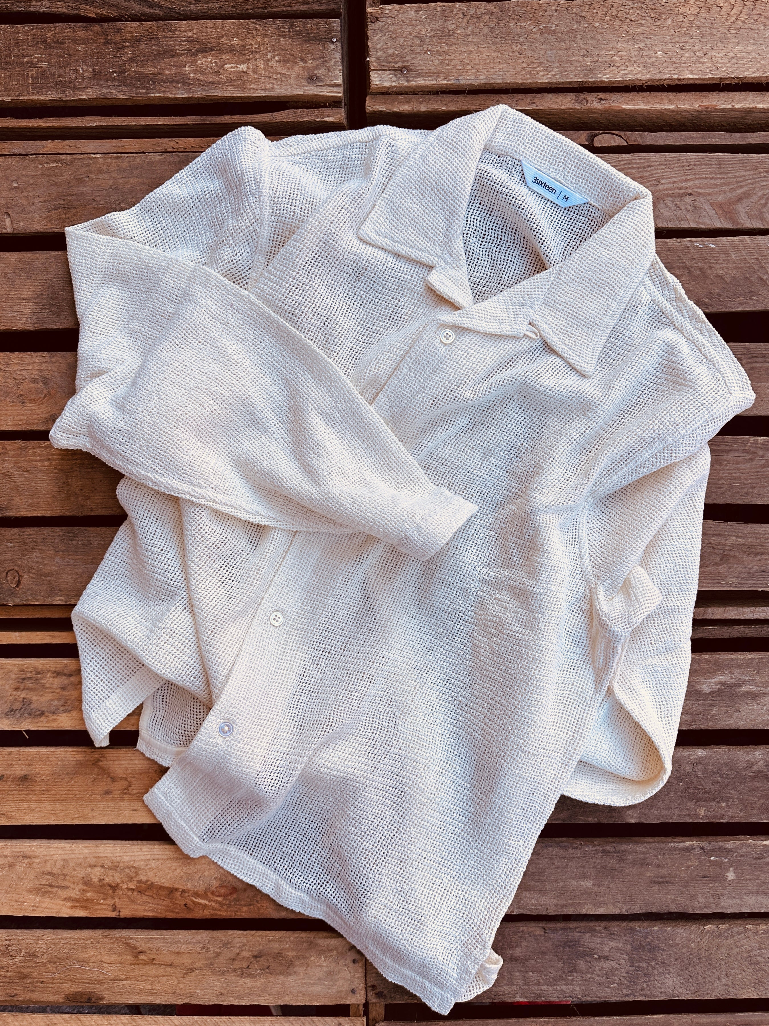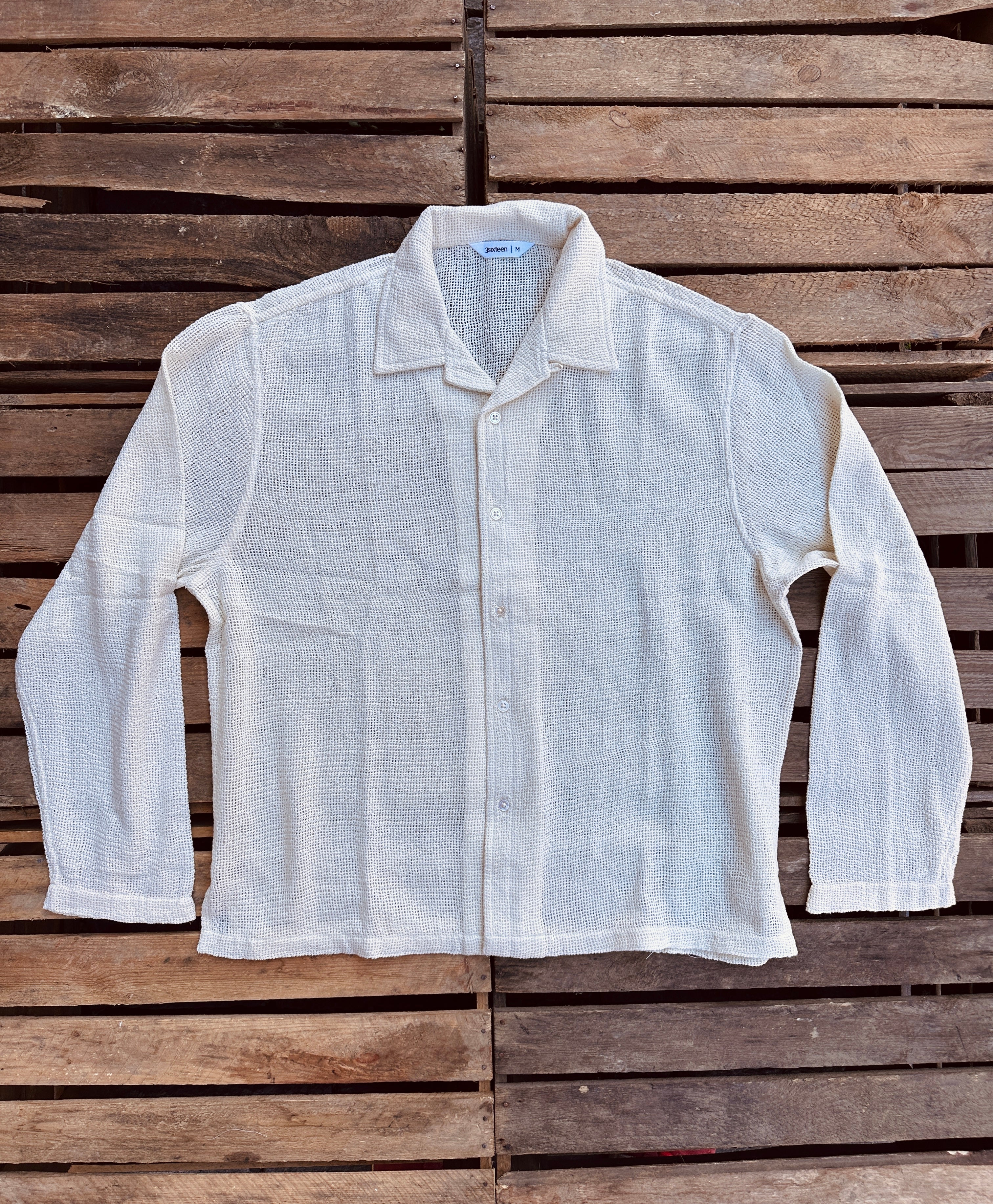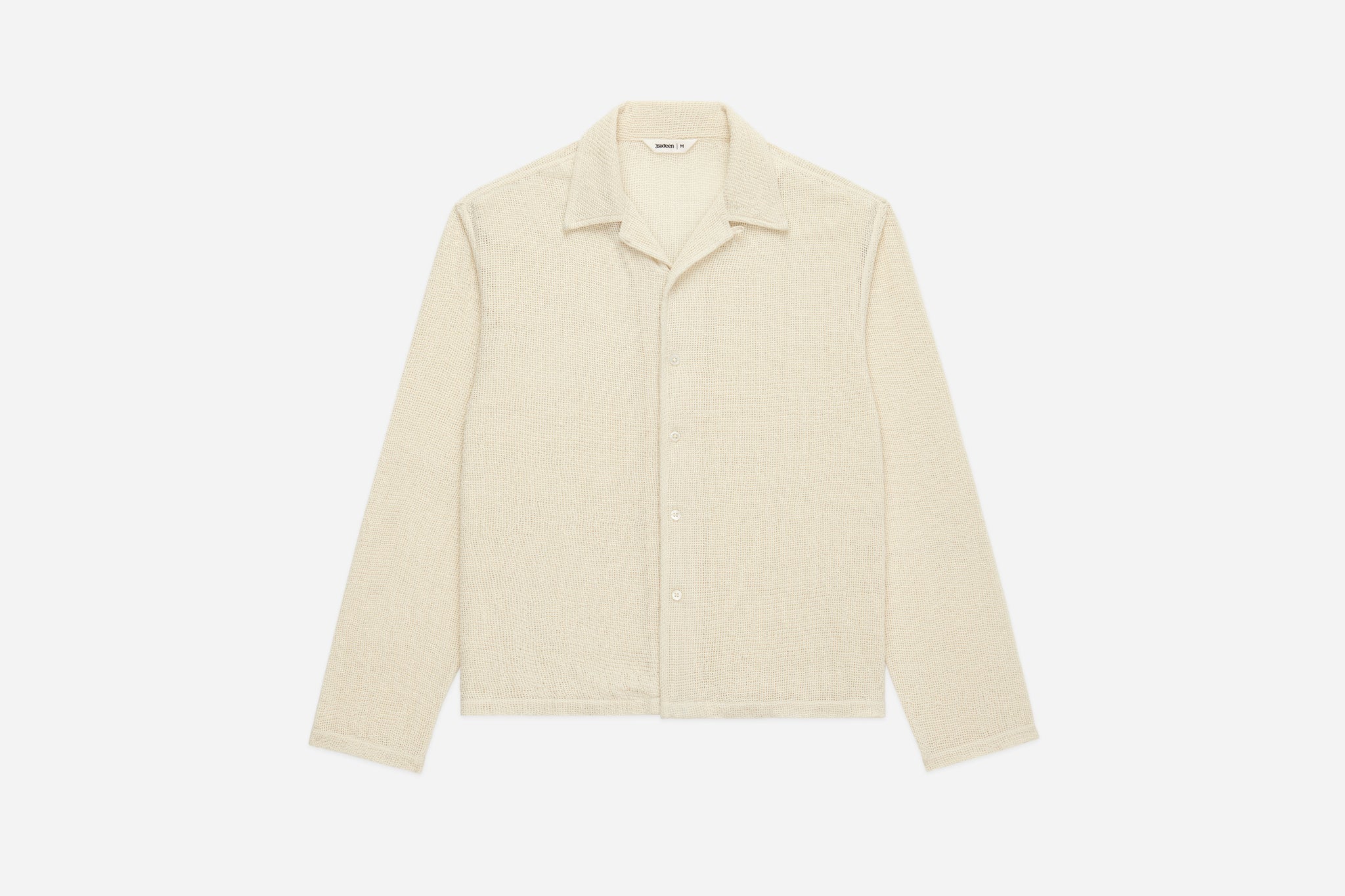 "Our Loop Collar Shirt is modeled after vintage midcentury open collar shirts and features a slightly boxier cut than some of our other shirts. This season, we had an open weave cotton mesh fabric custom woven for us. The fabric is airy, breathable, and very comfortable."