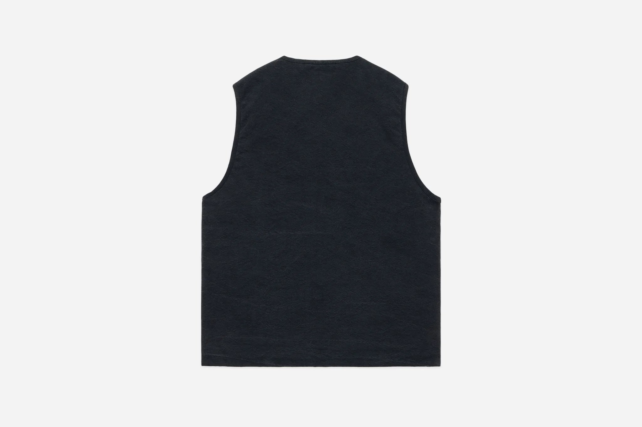 It utilizes a hefty duck canvas base fabric thats been piece dyed black and then given a stonewash treatment for a perfect worn-in look. 3sixteen paired it with a high-pile wool sherpa lining that gives the vest a plush hand and superior warmth, and a YKK gunmetal flip top zipper closure. The face of the vest has two large hand pockets while the reverse side features two patch pockets.