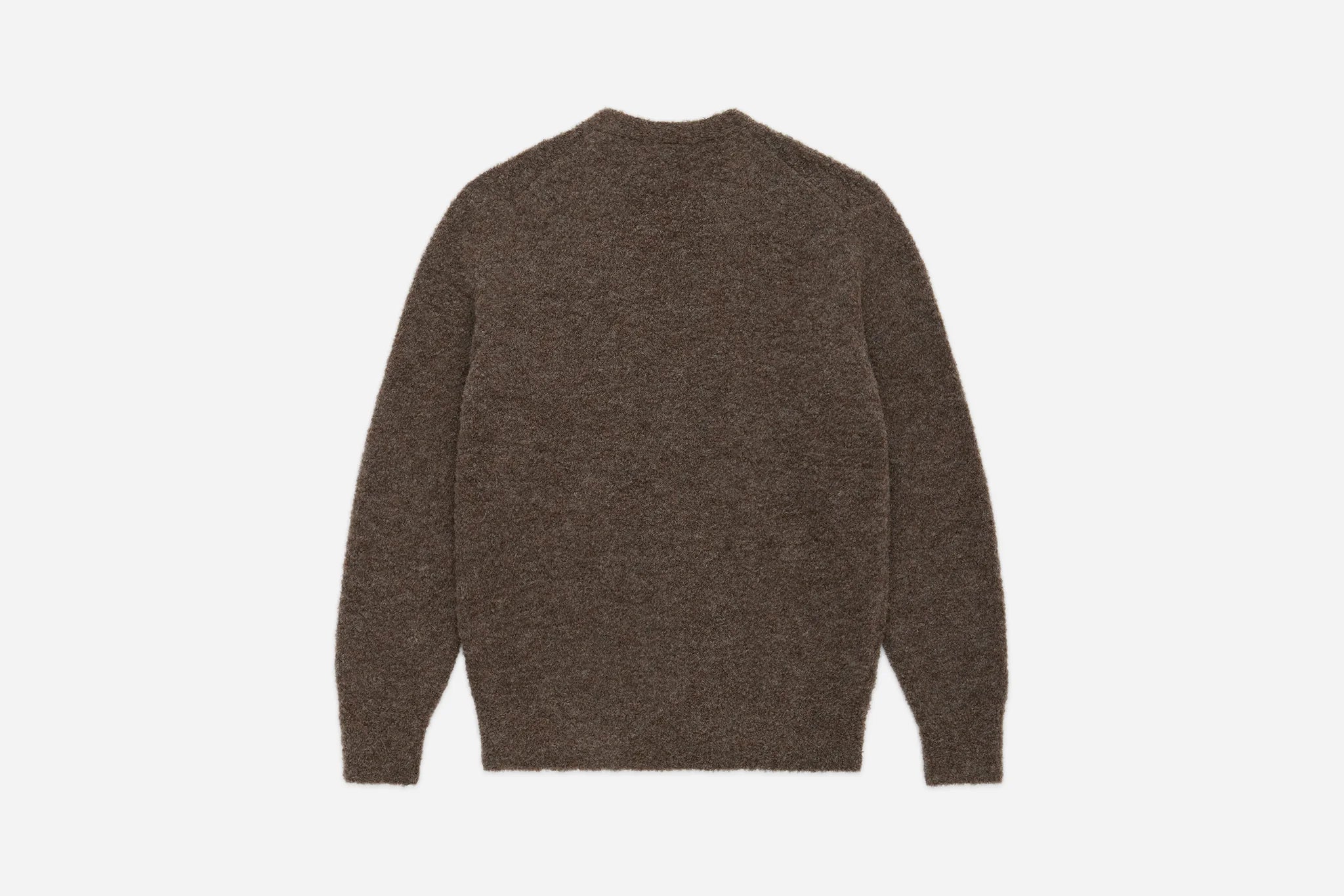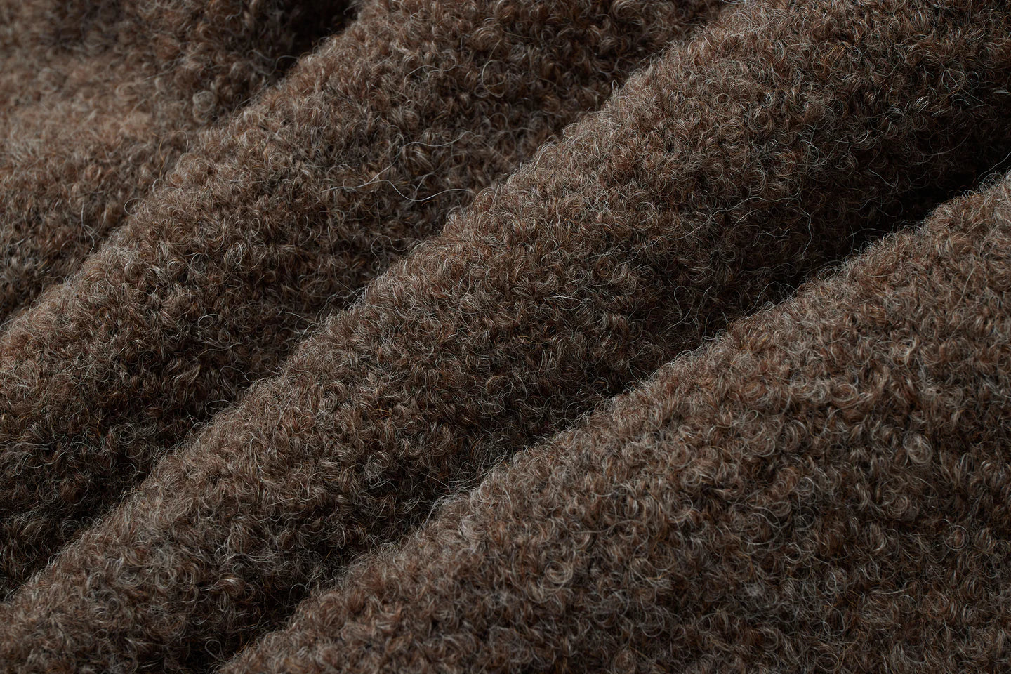It utilizes an alpaca boucle knit that gives the seemingly simple piece a dynamic texture and incredible plushness. The knit is airy and spongey with a soft hand.