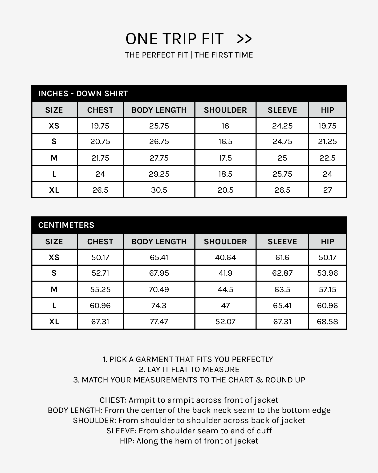 - Updated 2022 Down Shirt sizing (fits true to size)