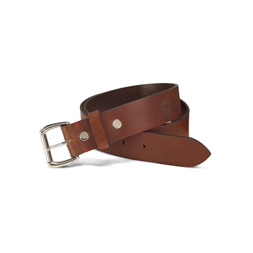 A classic men’s trouser belt with a solid roller buckle, available in polished brass or silver nickel finish. Made in 4mm thick leather and 1½” wide. Large range of waist sizes and with five holes for adjustment.