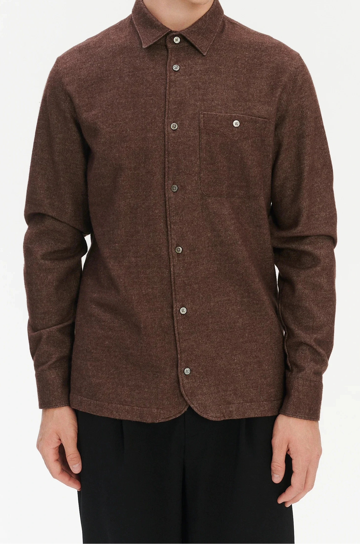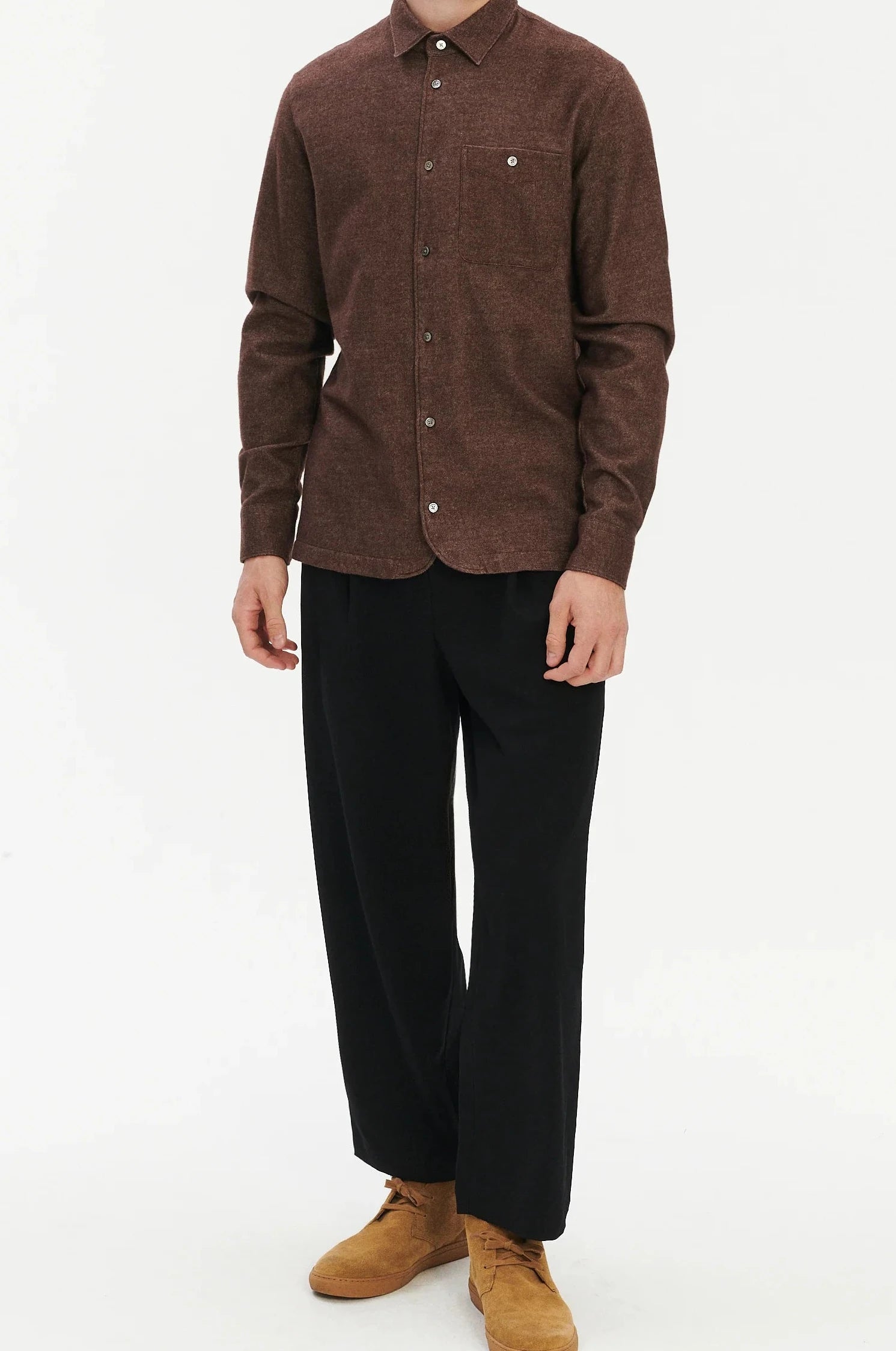 "We found this fabric in Osaka, and the first thing that struck us was the feel — soft, warm, and unusually substantial for a flannel. It’s a rare blend of organic cotton with 10% yak wool, and that small amount of yak makes all the difference: a unique, cashmere-like touch and a gentle weight you notice immediately. It comes perfectly in our Strong Shirt, inspired by the Japanese farmer shirt with its characteristic round hem."