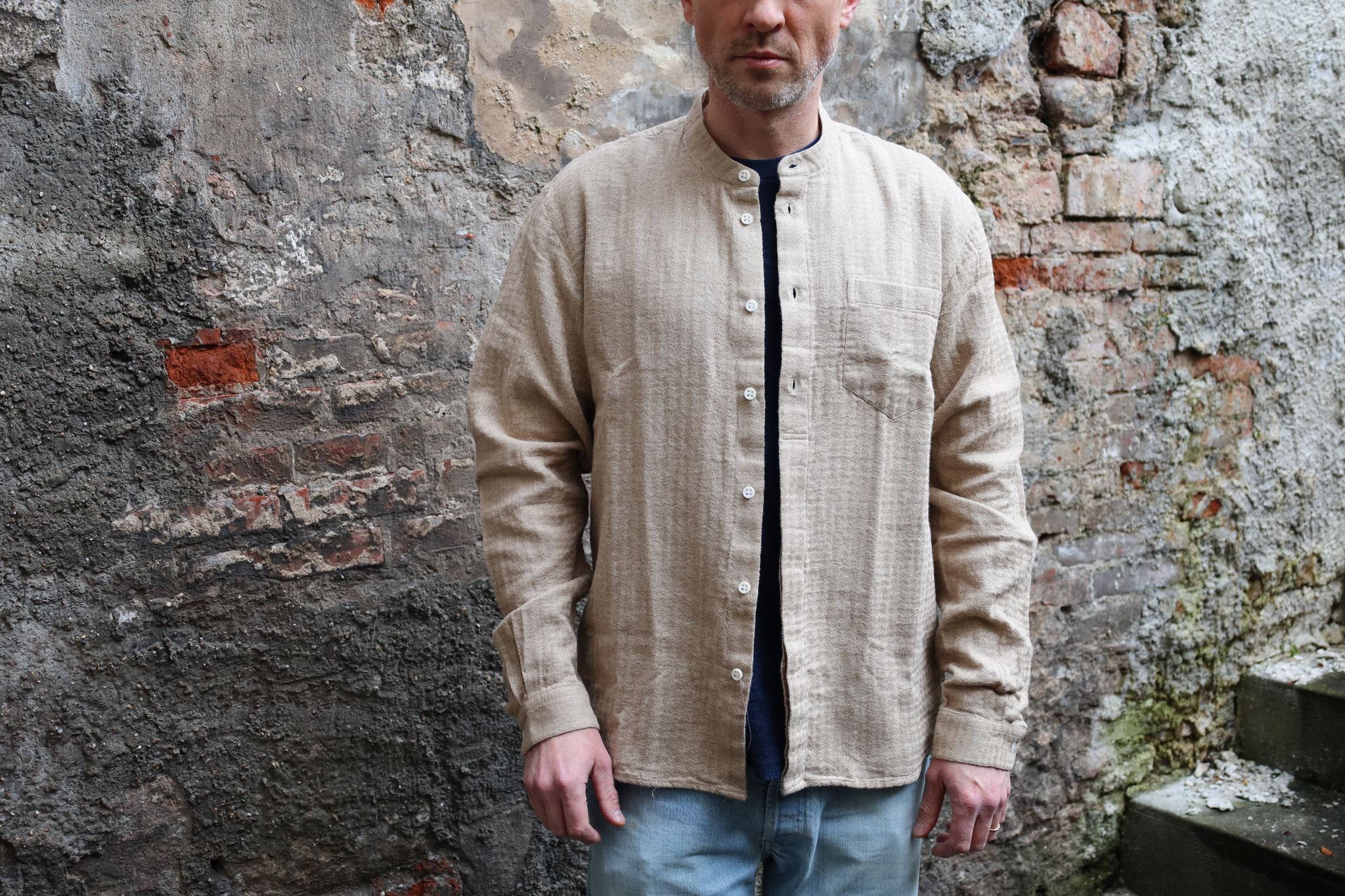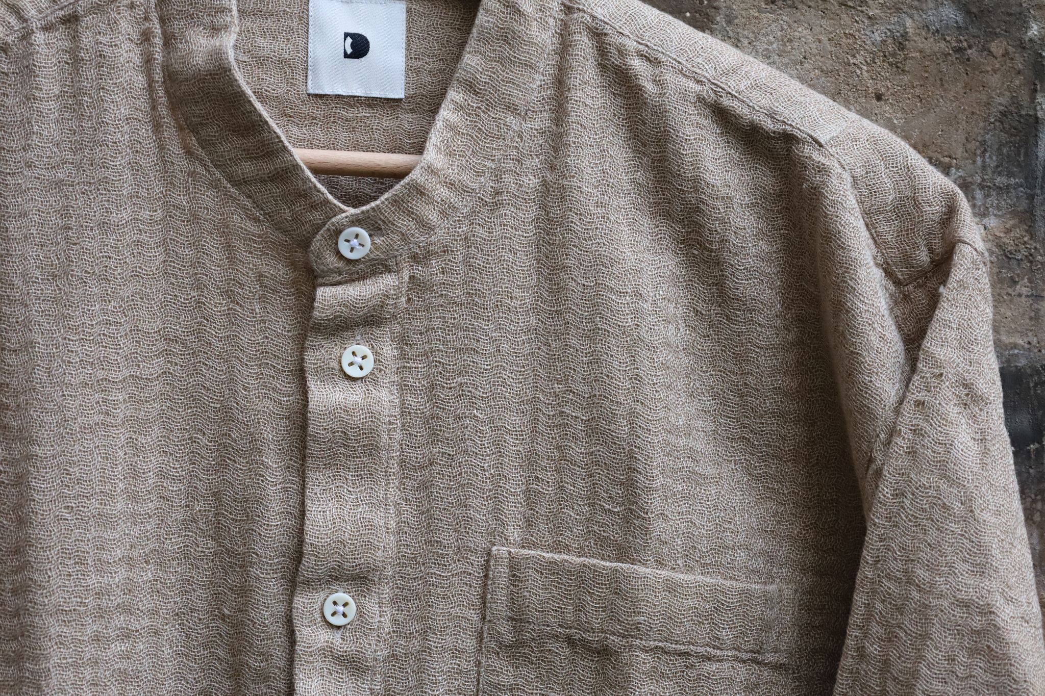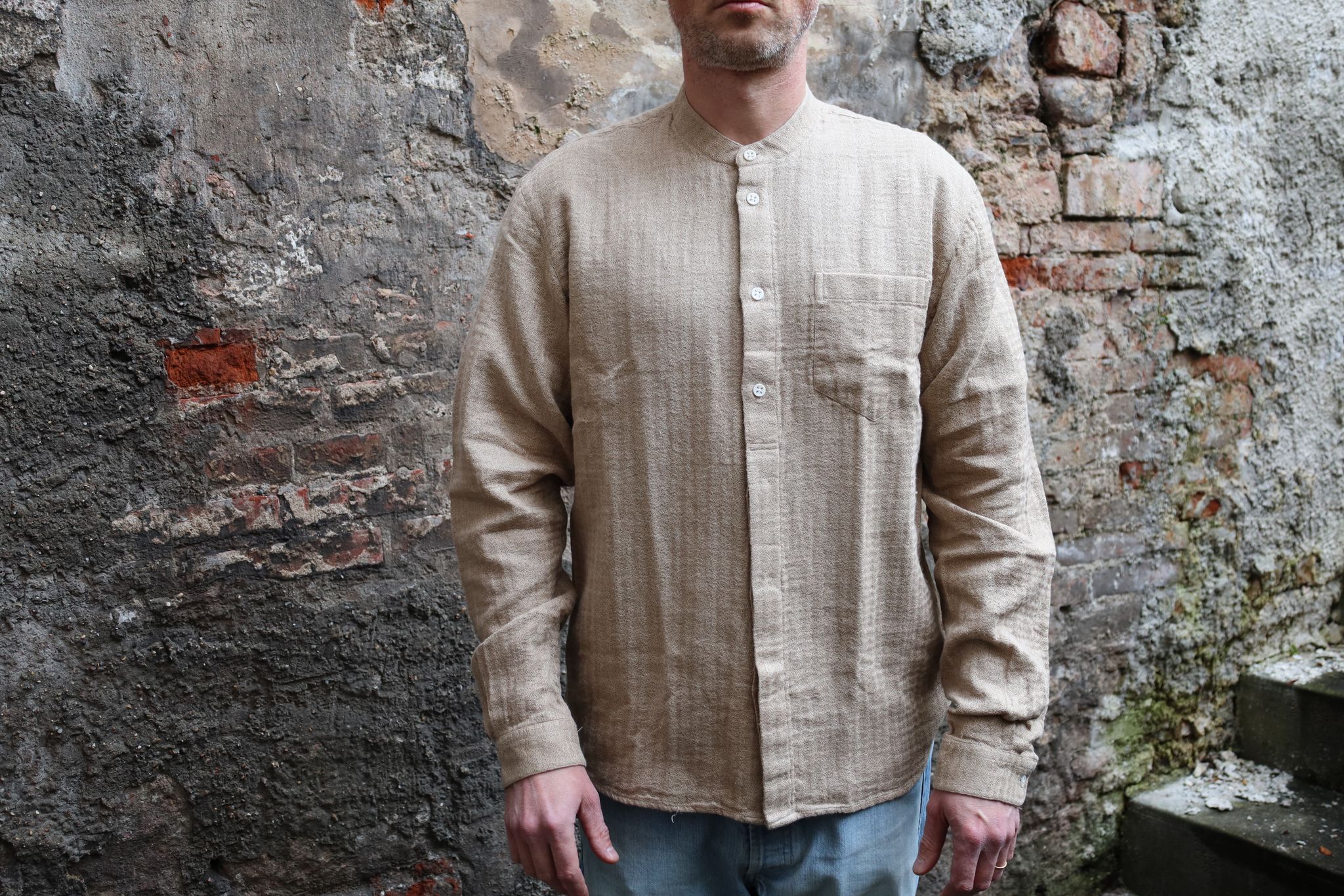 Delikatessen signature Zen Shirt features a stand up collar, half concealed buttons and a small chest pocket. The shirt is hand made using traditional French seams.