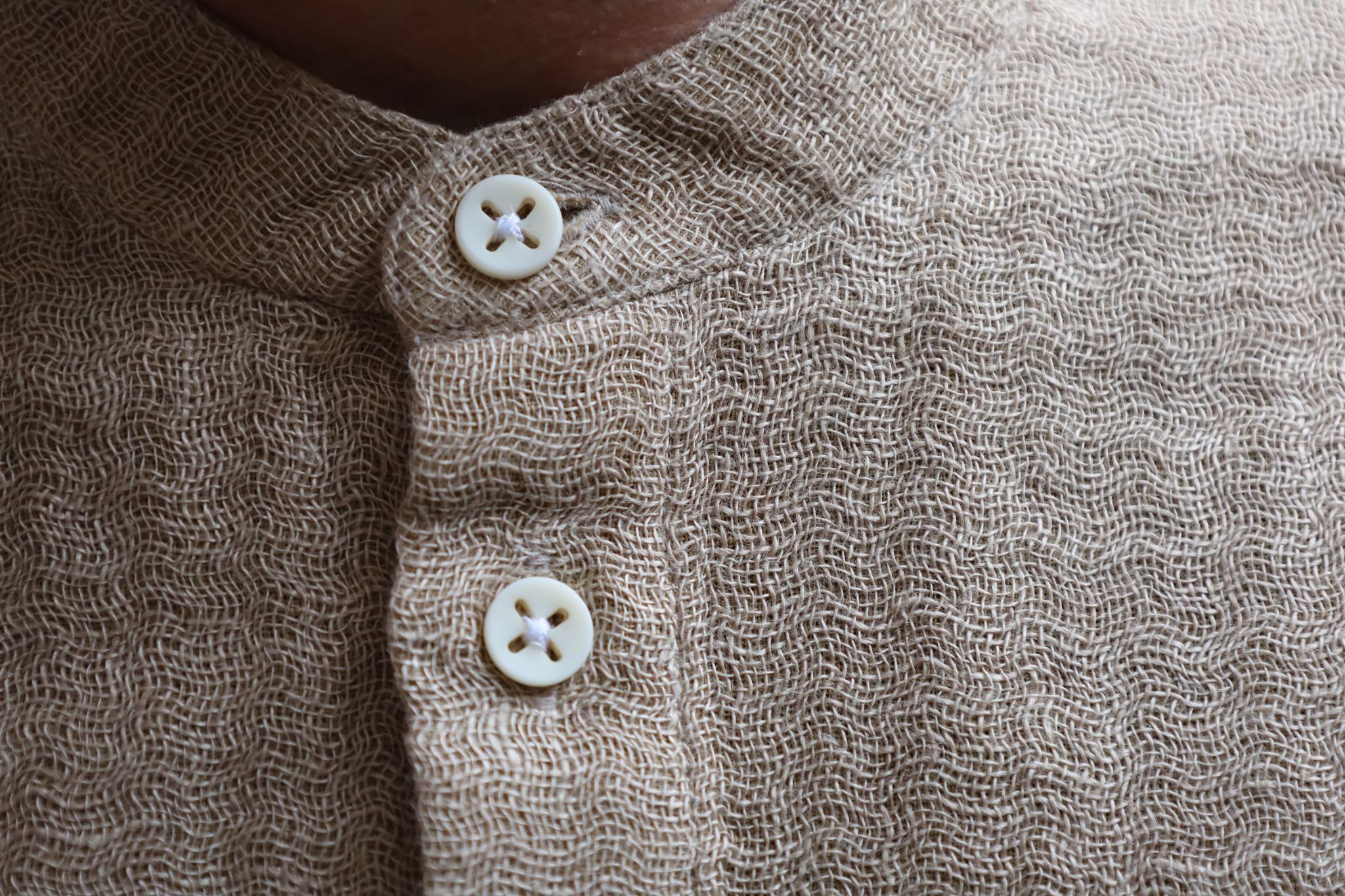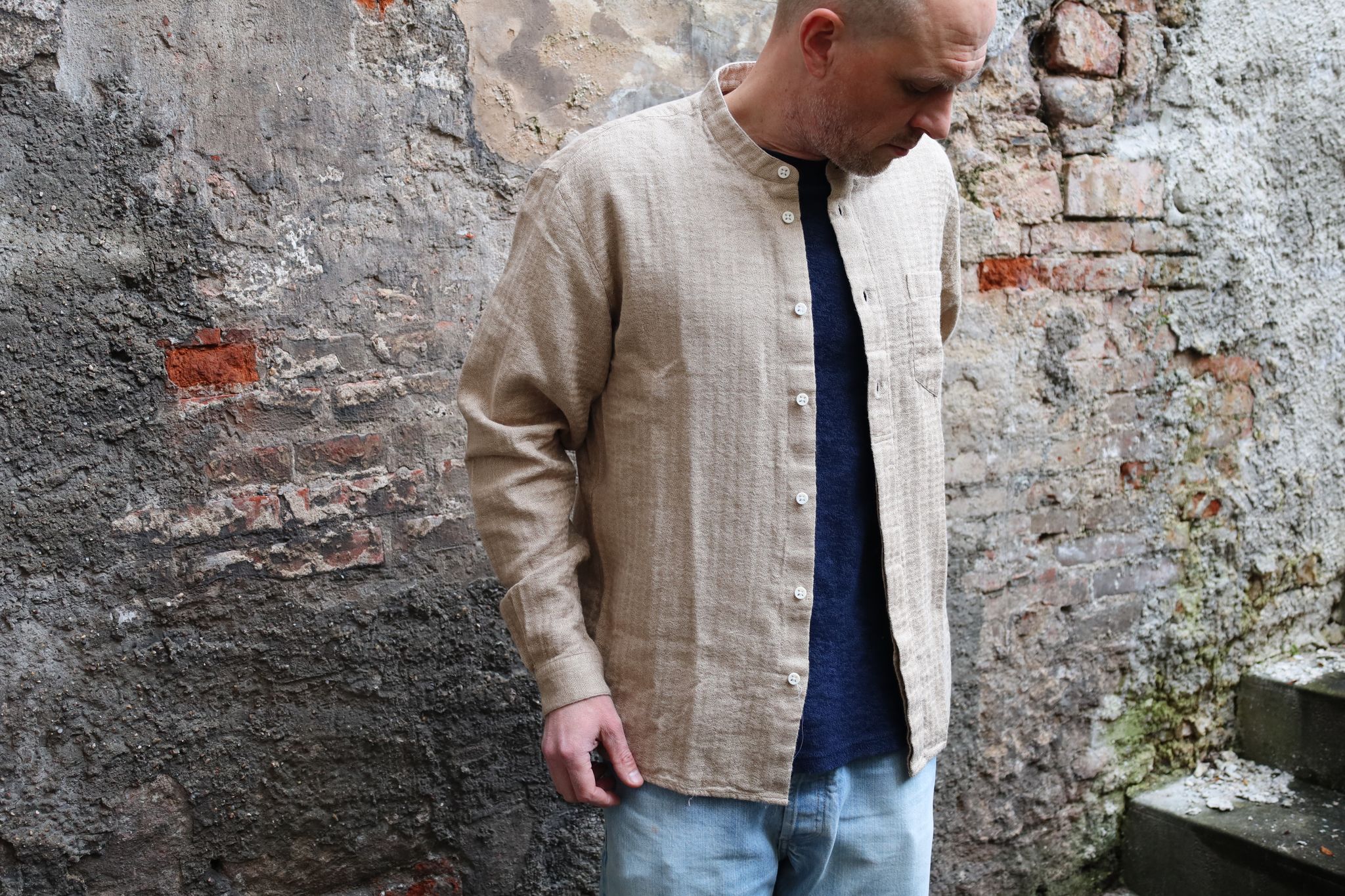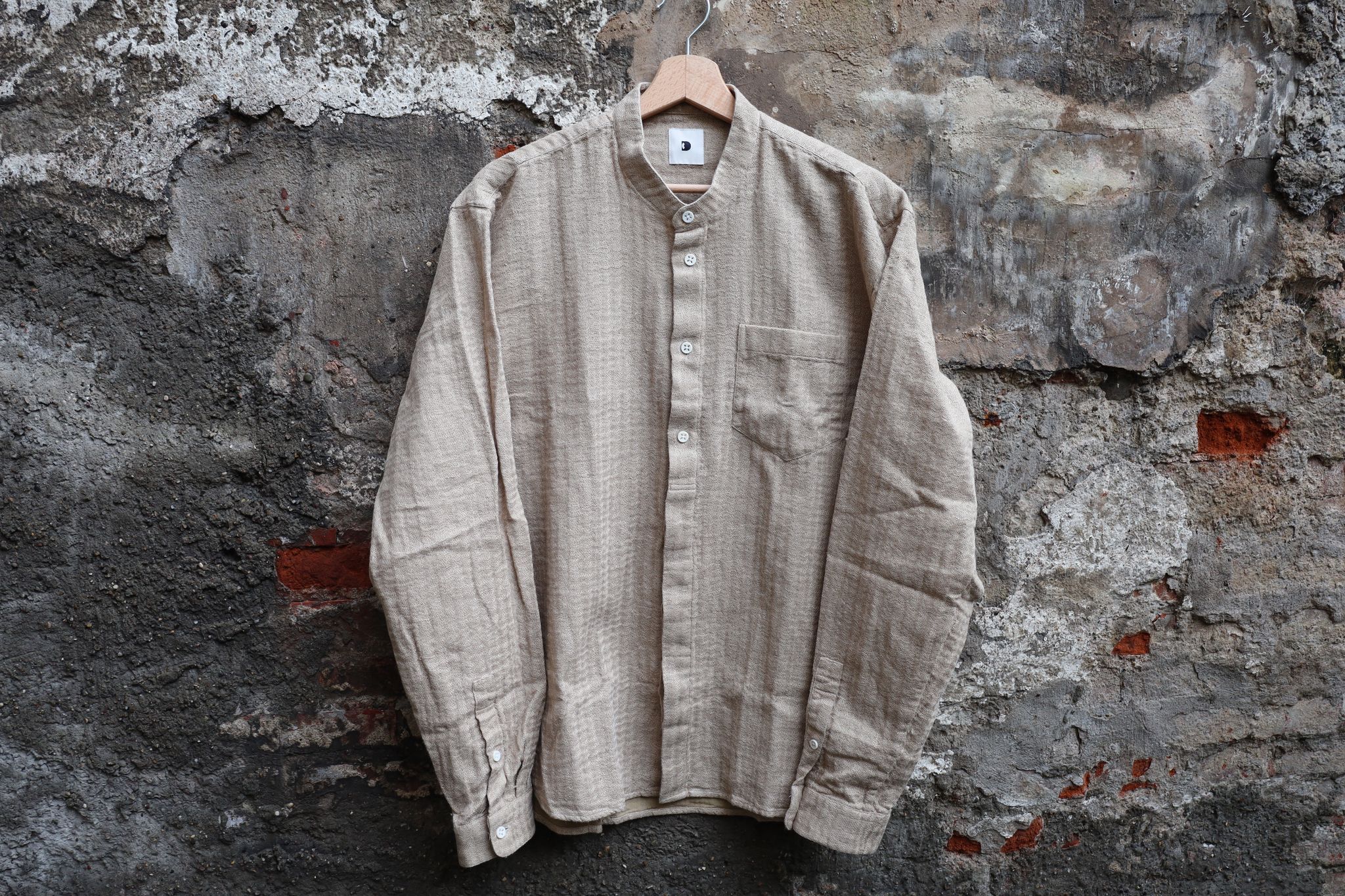 Delikatessen signature Zen Shirt features a stand up collar, half concealed buttons and a small chest pocket. The shirt is hand made using traditional French seams.