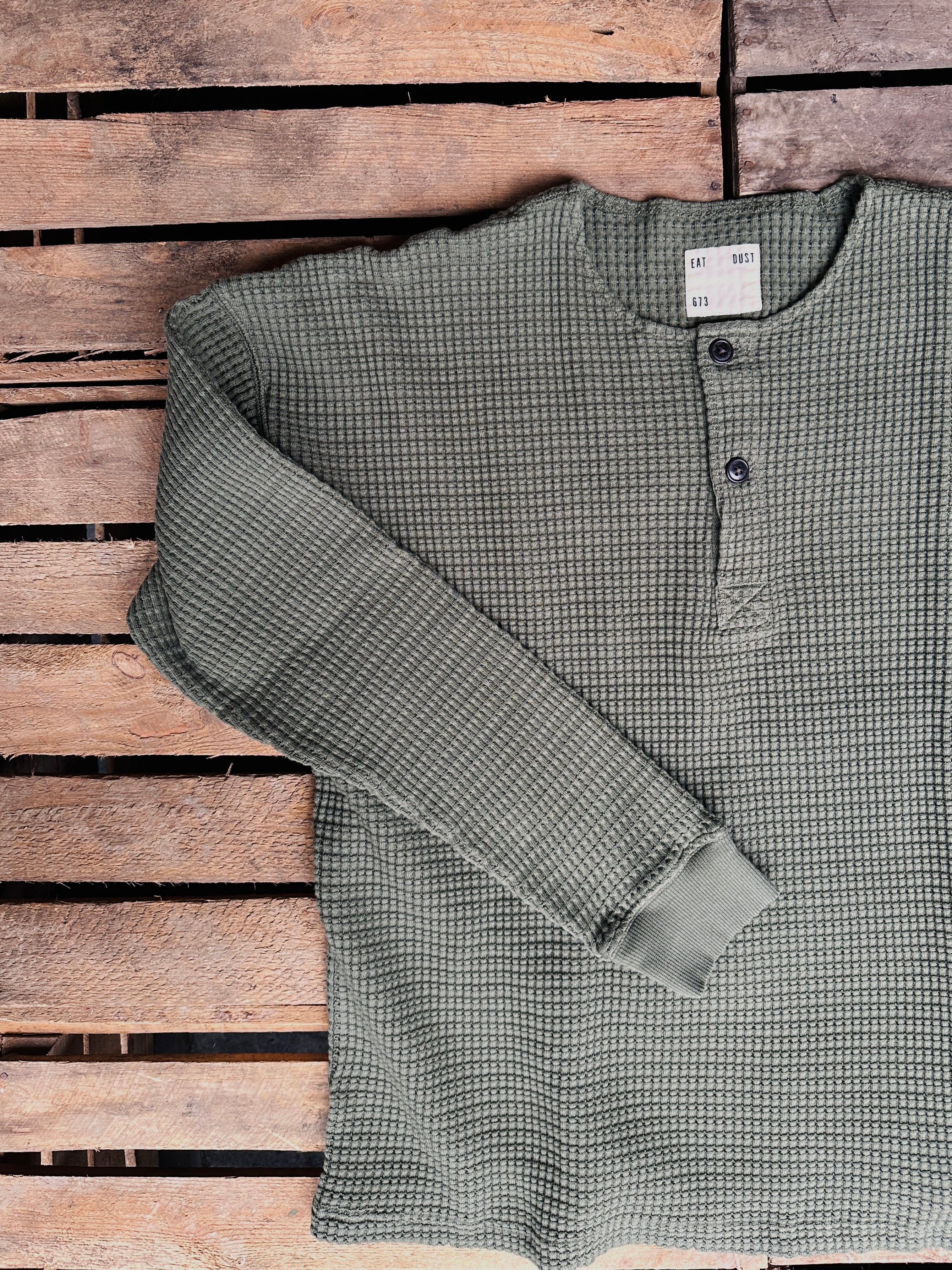 Our Venice sweatshirt with henley style buttons has quickly grown into a favorite. It's a looser, boxy fit sweatshirt in heavy waffle cotton this Summer season, finished with corozo buttons, all in a 100% cotton. Super comfy and perfect to layer with.