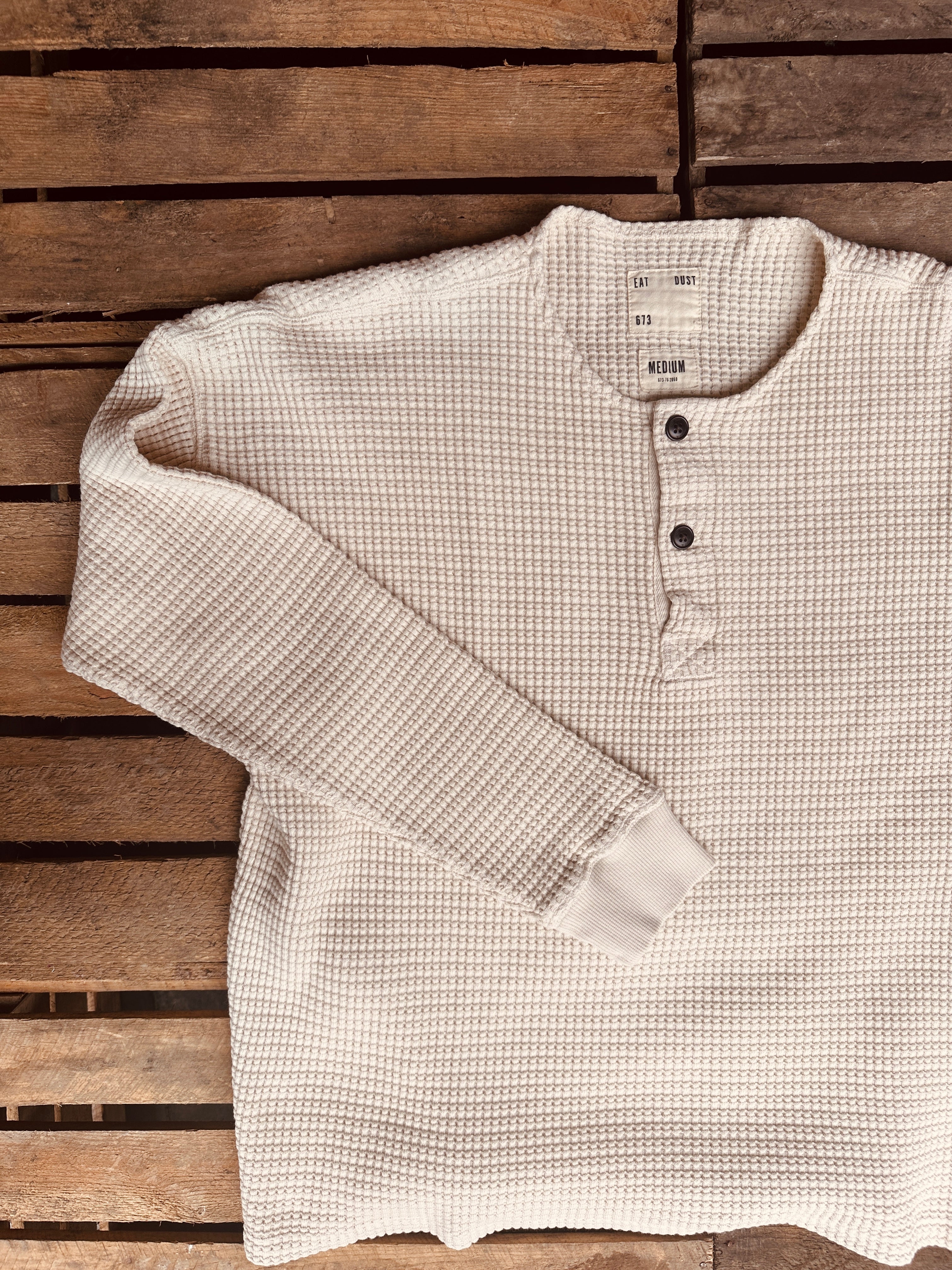 Our Venice sweatshirt with henley style buttons has quickly grown into a favorite. It's a looser, boxy fit sweatshirt in heavy waffle cotton this Summer season, finished with corozo buttons, all in a 100% cotton. Super comfy and perfect to layer with.
