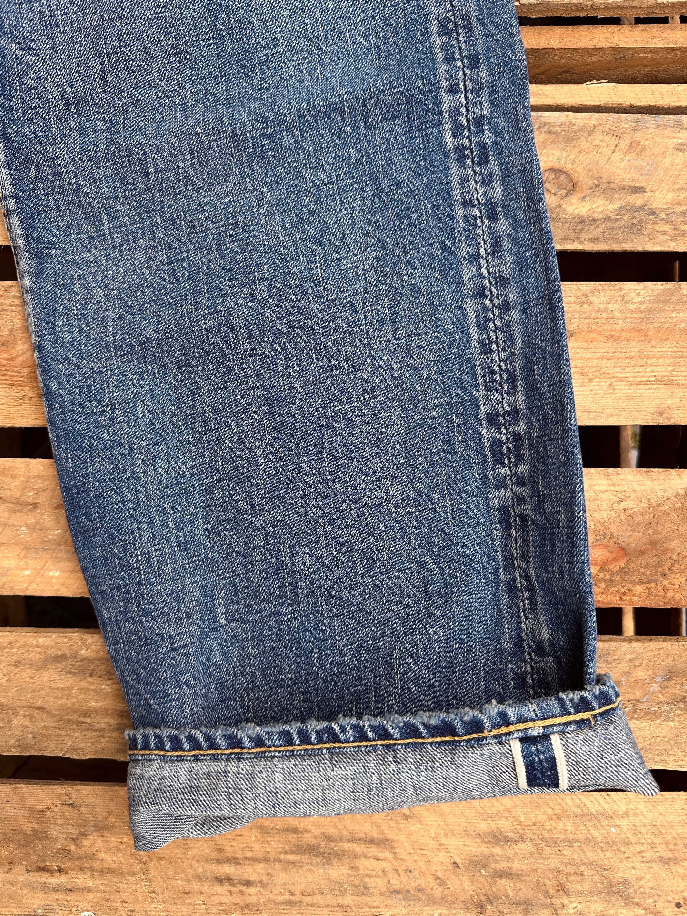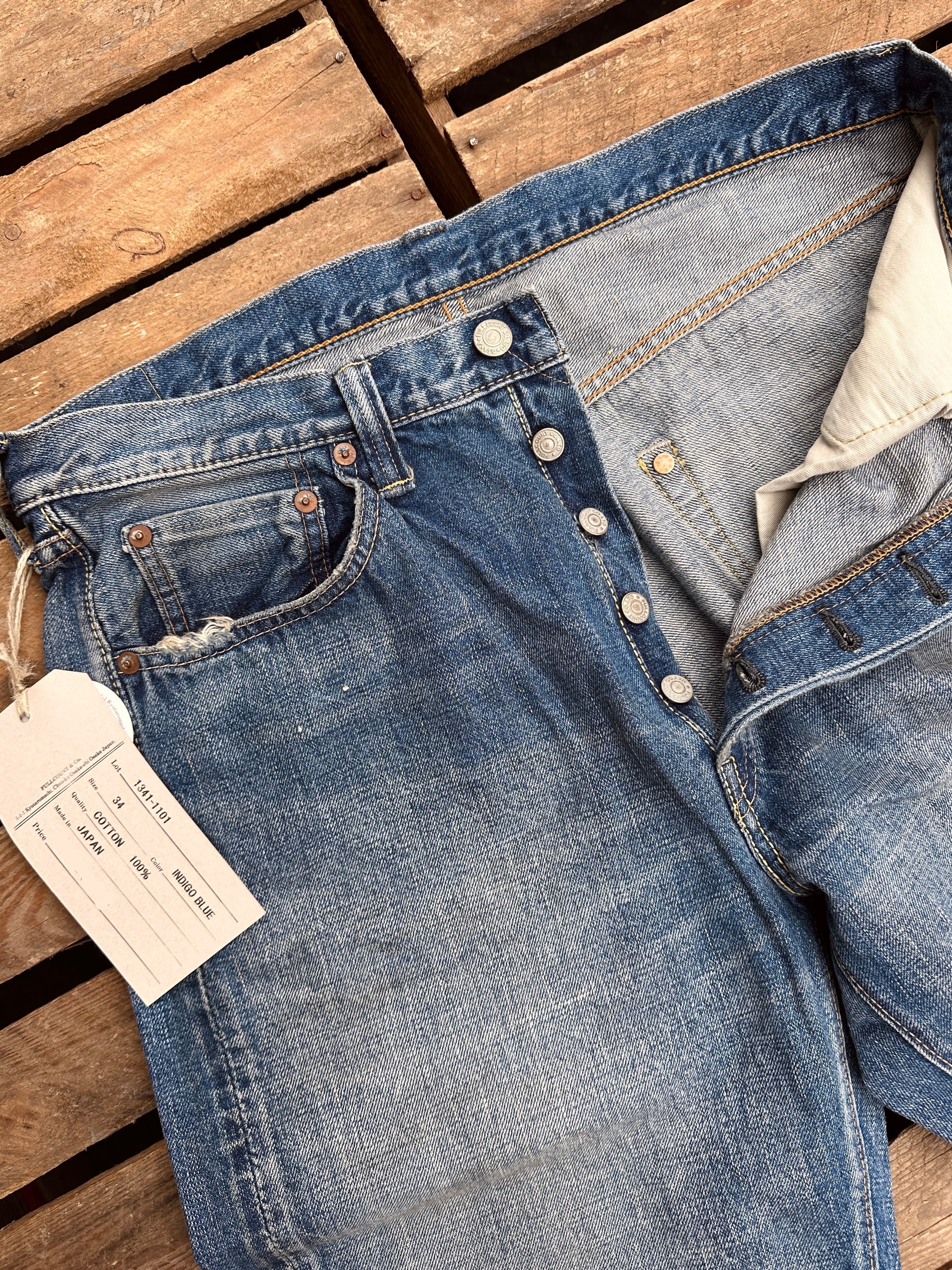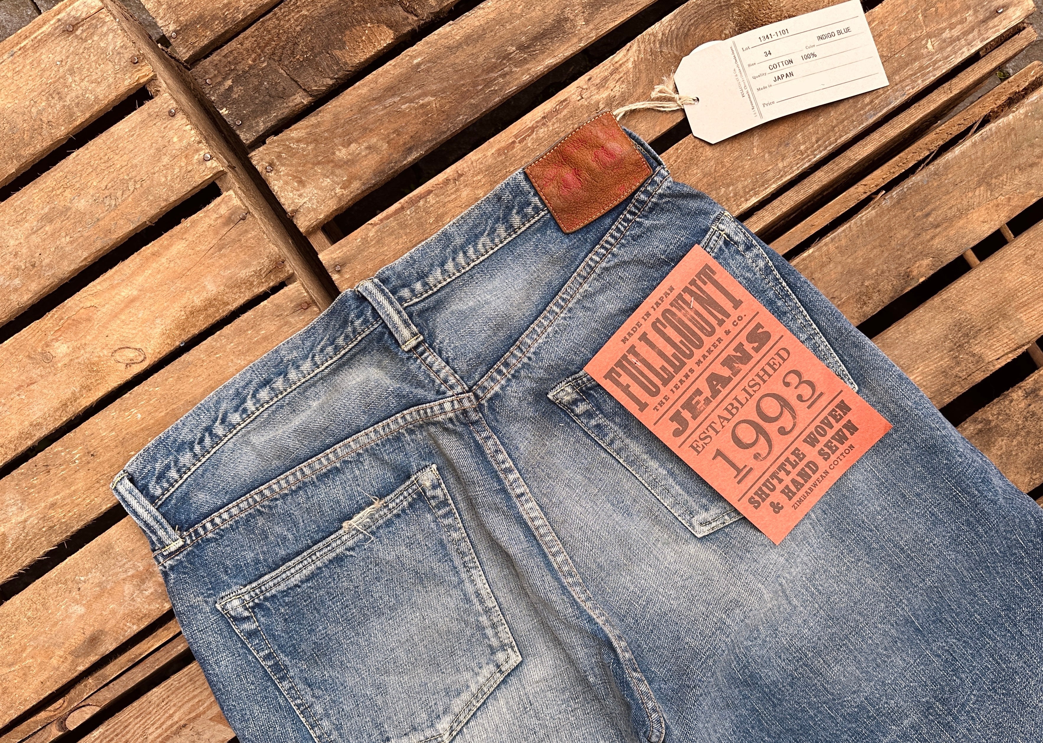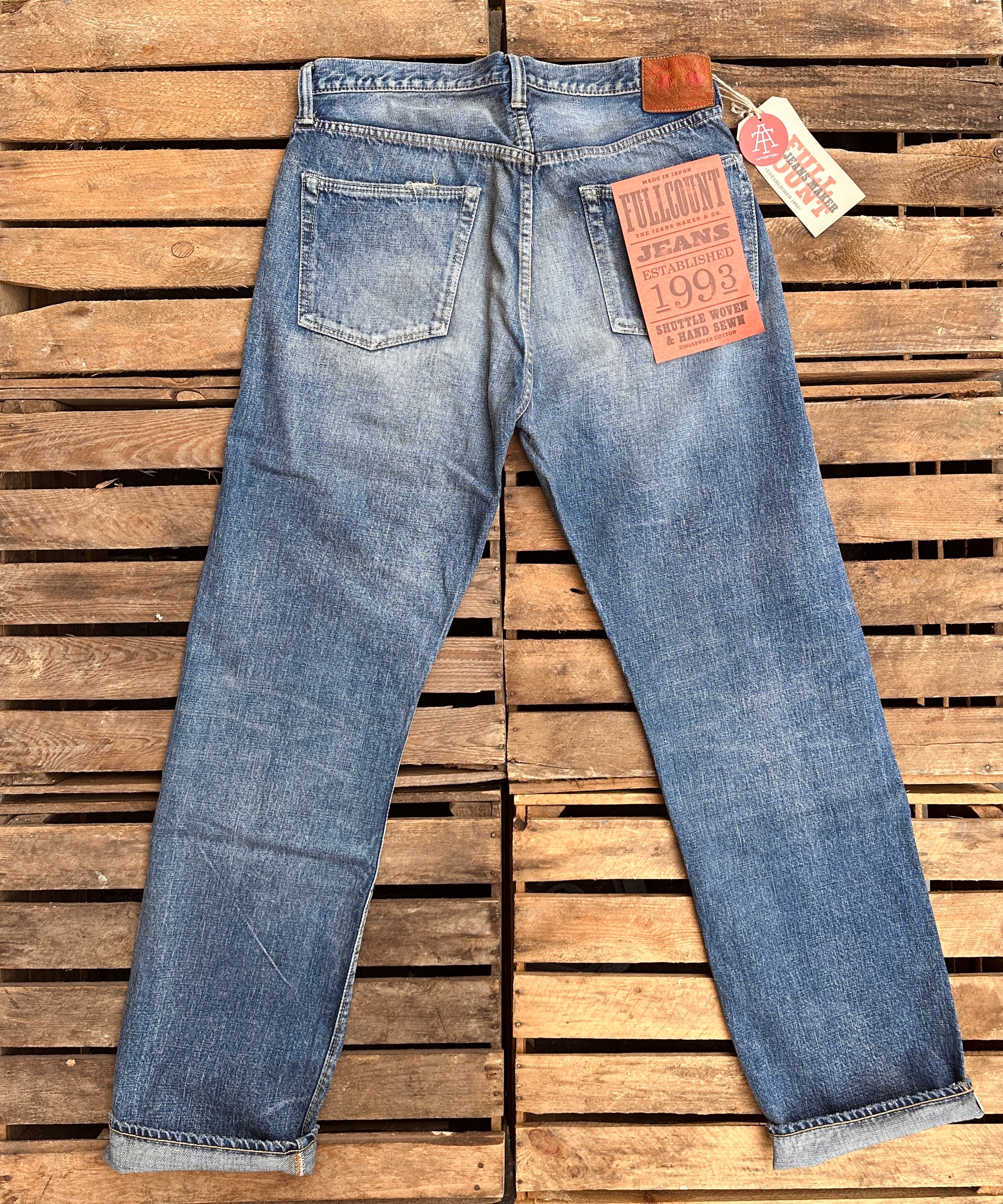 "A plain straight cut, part of the original lineup since the brand’s founding. Released in 1993 when FULLCOUNT was founded, the 1101 is a plain straight cut. It’s the second widest in the lineup, with a gentle taper toward the hem. The fit is relaxed around the waist and thighs, making it easy to pair with tailored jackets. Located about 25km southeast of London, Dartford was integral in the formation of the legendary Rolling Stones when Mick Jagger and Keith Richards met on Platform 2 at the local station in 1961. These Jeans are inspired by the color of the denim jacket that Mick Jagger wore in his young and crazy days. The slightly yellowed tint, the heavy creases and fades, and the wear-and-tear are unparalleled. Done in our classic and comfortable 100% Zimbabwe cotton, this is comfortable to wear in all seasons. A very versatile item indeed."