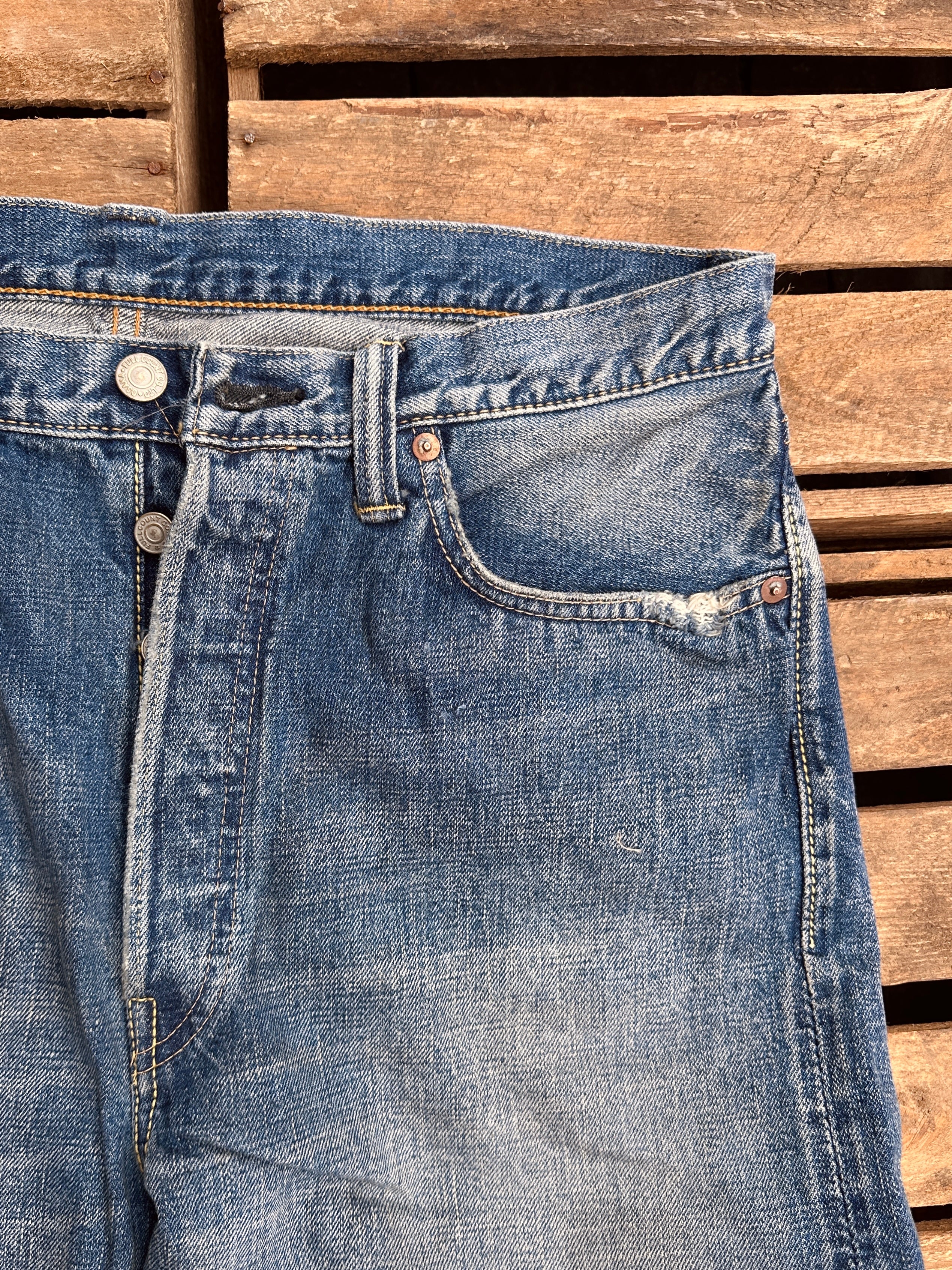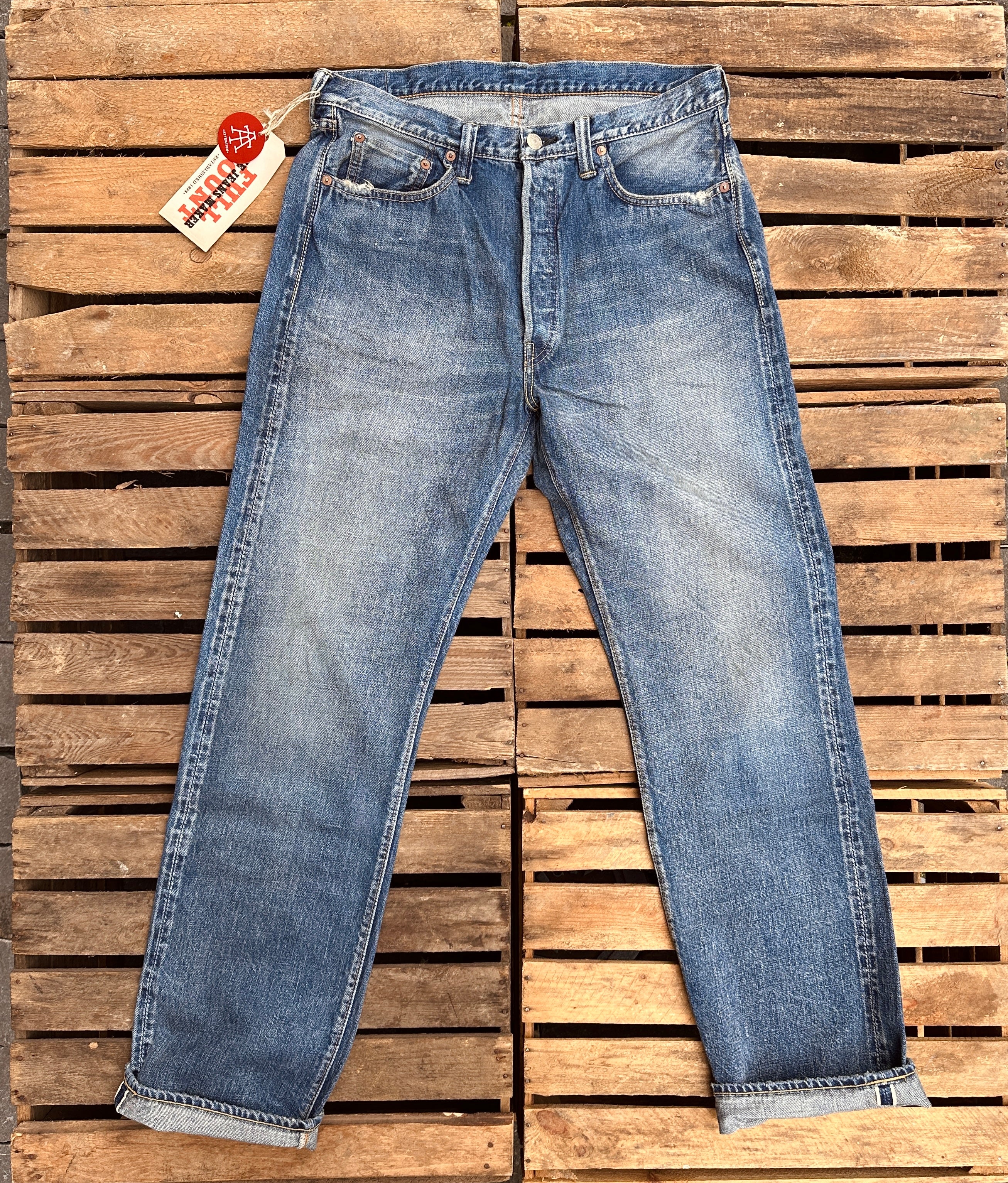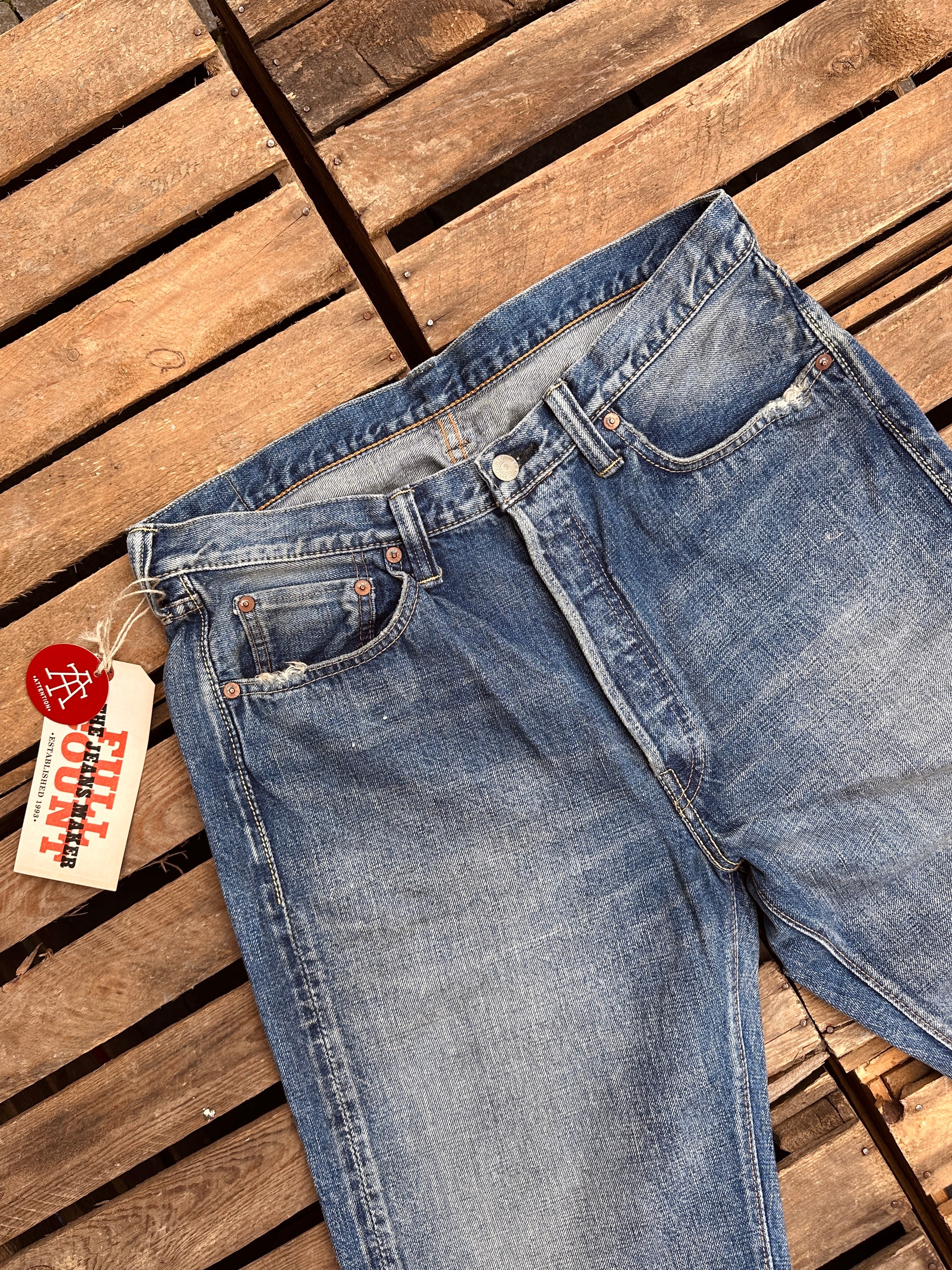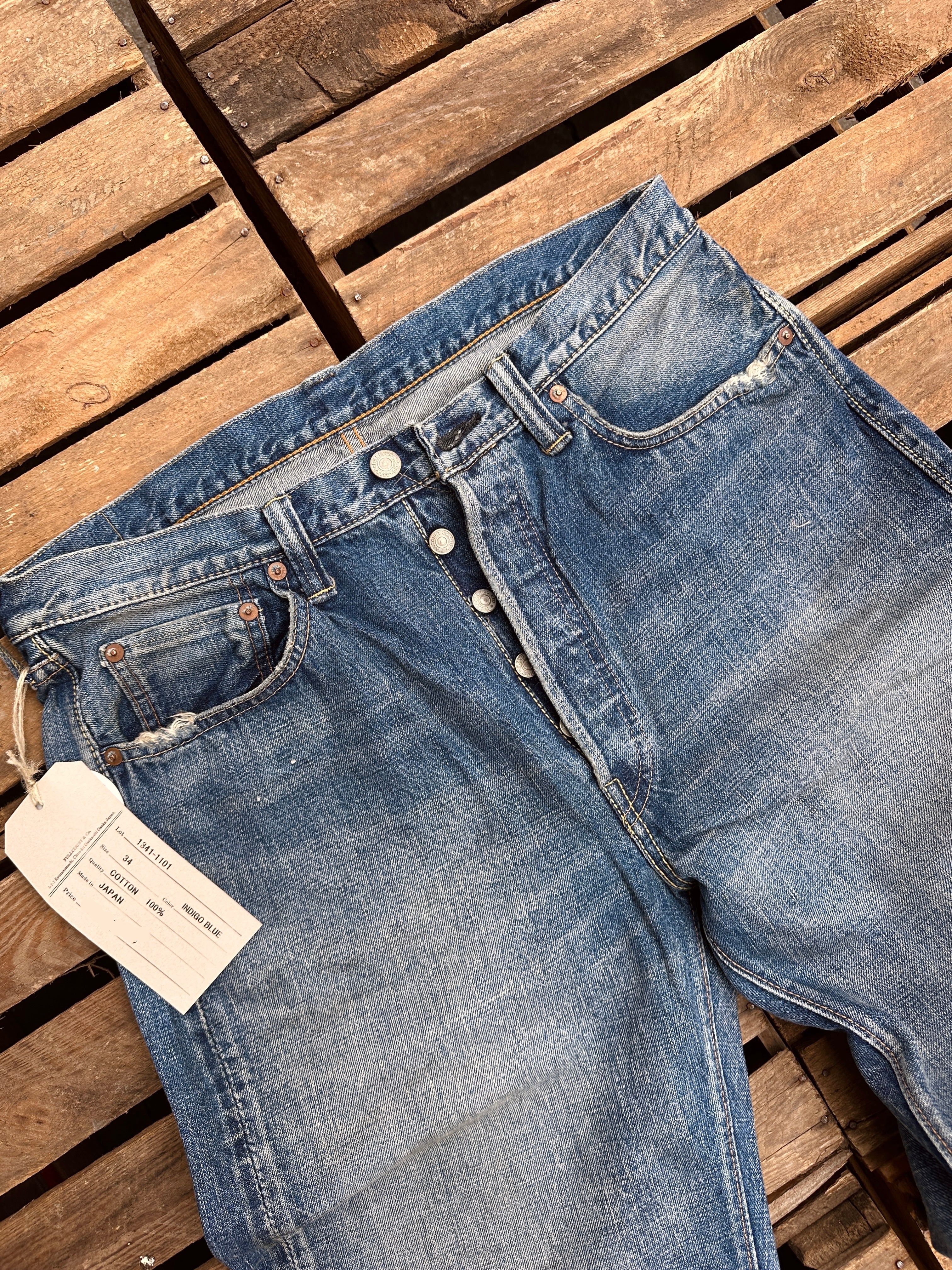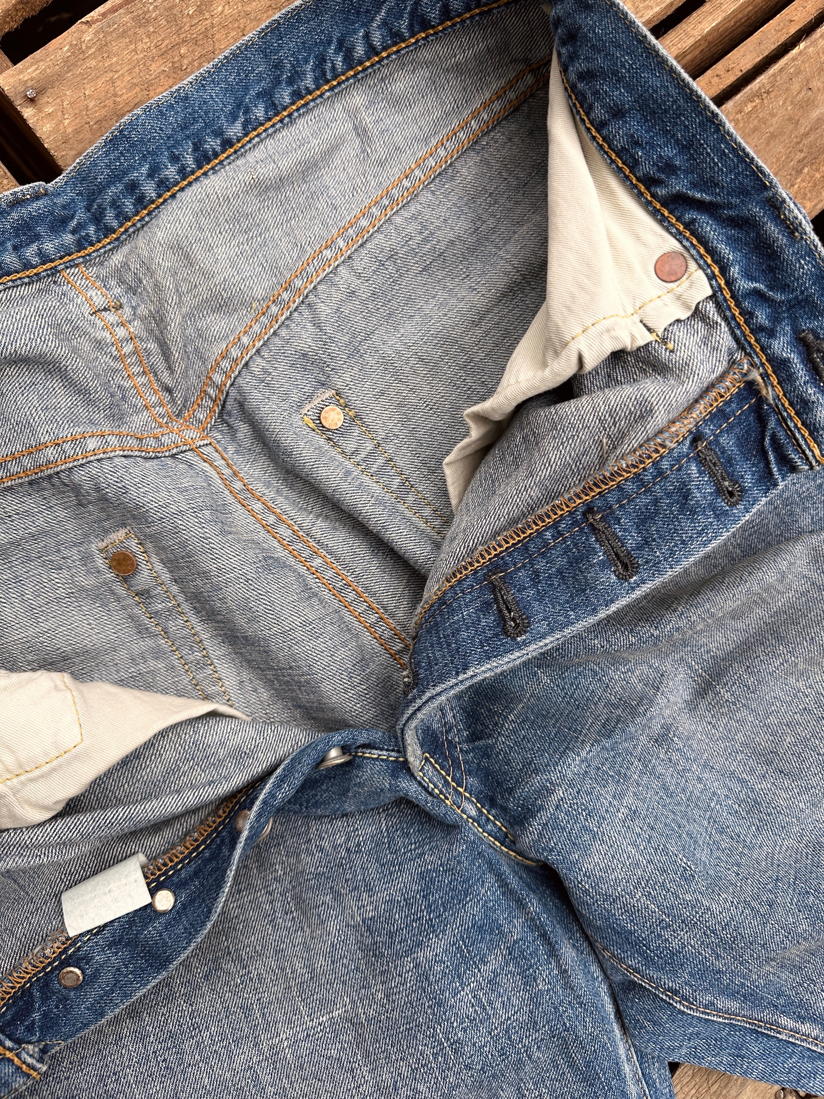 "A plain straight cut, part of the original lineup since the brand’s founding. Released in 1993 when FULLCOUNT was founded, the 1101 is a plain straight cut. It’s the second widest in the lineup, with a gentle taper toward the hem. The fit is relaxed around the waist and thighs, making it easy to pair with tailored jackets. Located about 25km southeast of London, Dartford was integral in the formation of the legendary Rolling Stones when Mick Jagger and Keith Richards met on Platform 2 at the local station in 1961. These Jeans are inspired by the color of the denim jacket that Mick Jagger wore in his young and crazy days. The slightly yellowed tint, the heavy creases and fades, and the wear-and-tear are unparalleled. Done in our classic and comfortable 100% Zimbabwe cotton, this is comfortable to wear in all seasons. A very versatile item indeed."