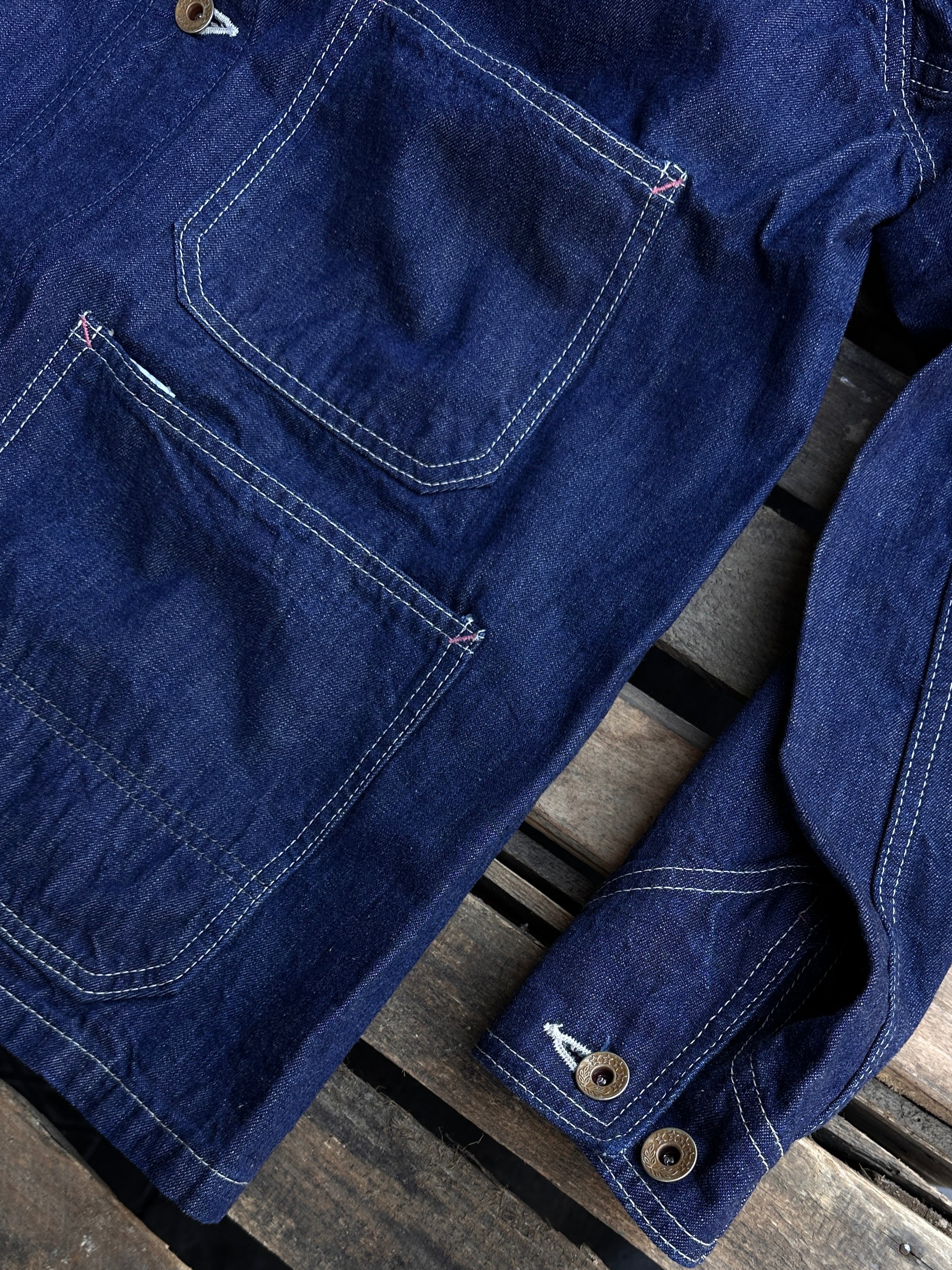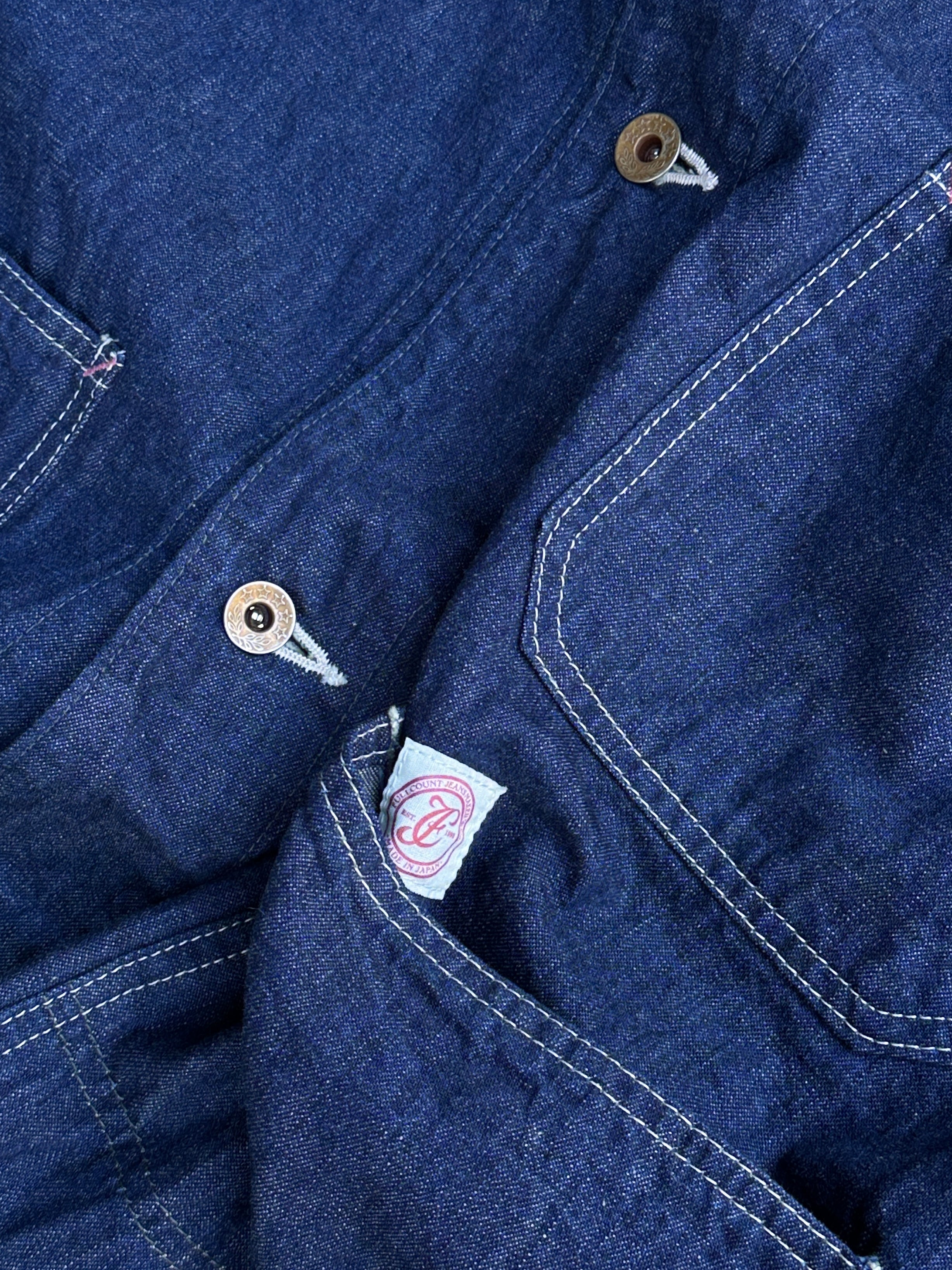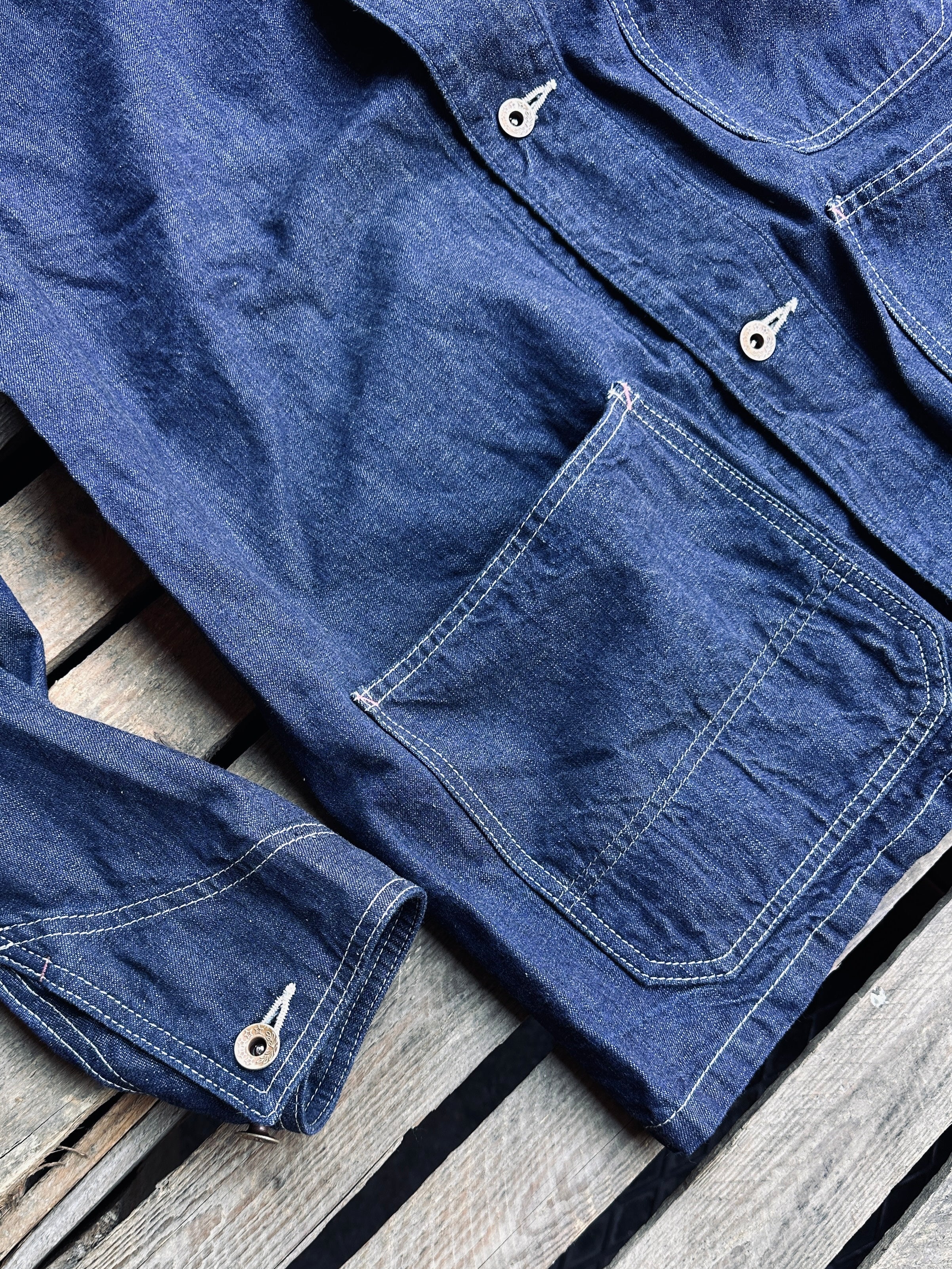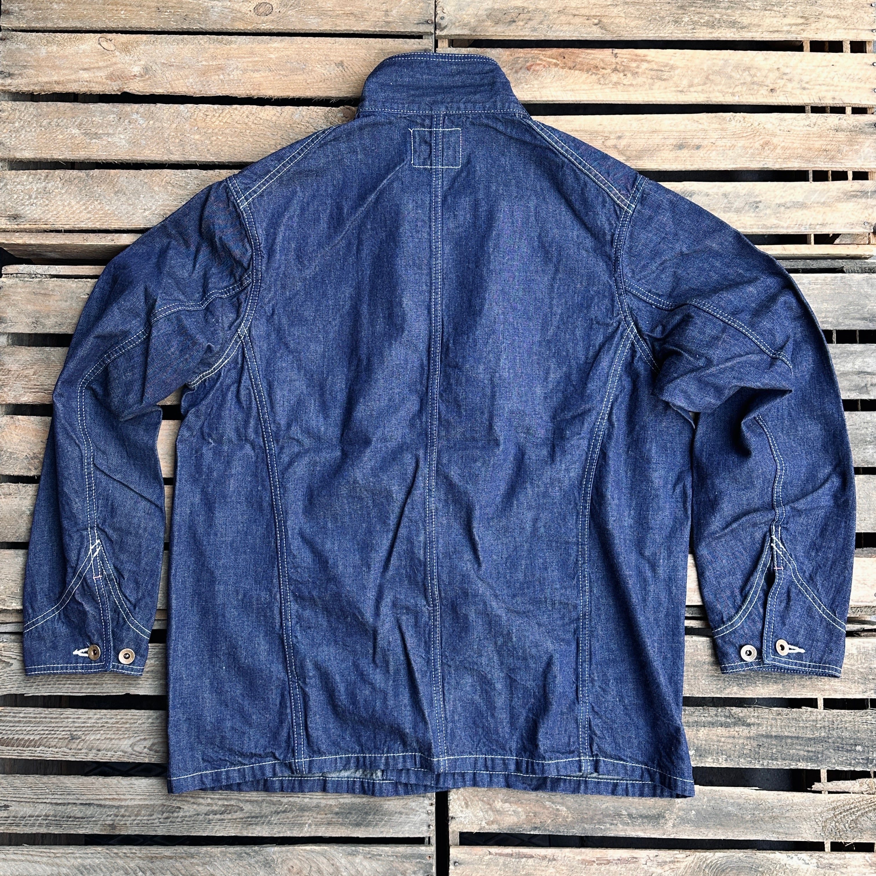 "A chore jacket (coveralls) with the simplified details found during the WWII period. 10oz Zimbabwe cotton military denim is used to give the look and feel of dead stock denim by doing up the weft in khaki beige. The hem is wide and the length is short, the 5 star donut buttons are aged with very simple details, and the stitch work has a distinct flavor. Packed full of attention to detail, we’re dropping this item with complete confidence and an eye to how great it will look after being worn for 5 years. This is meant to be set up with our Farmers Trousers made of the same material."