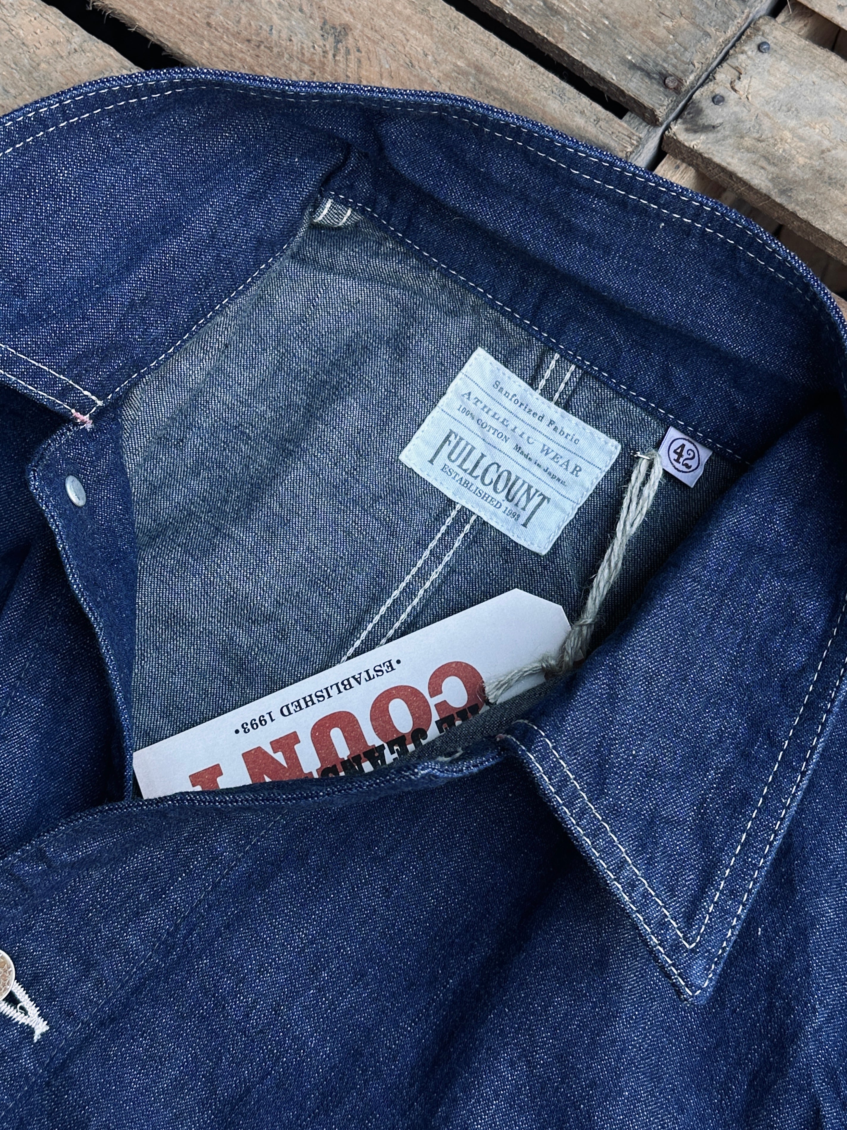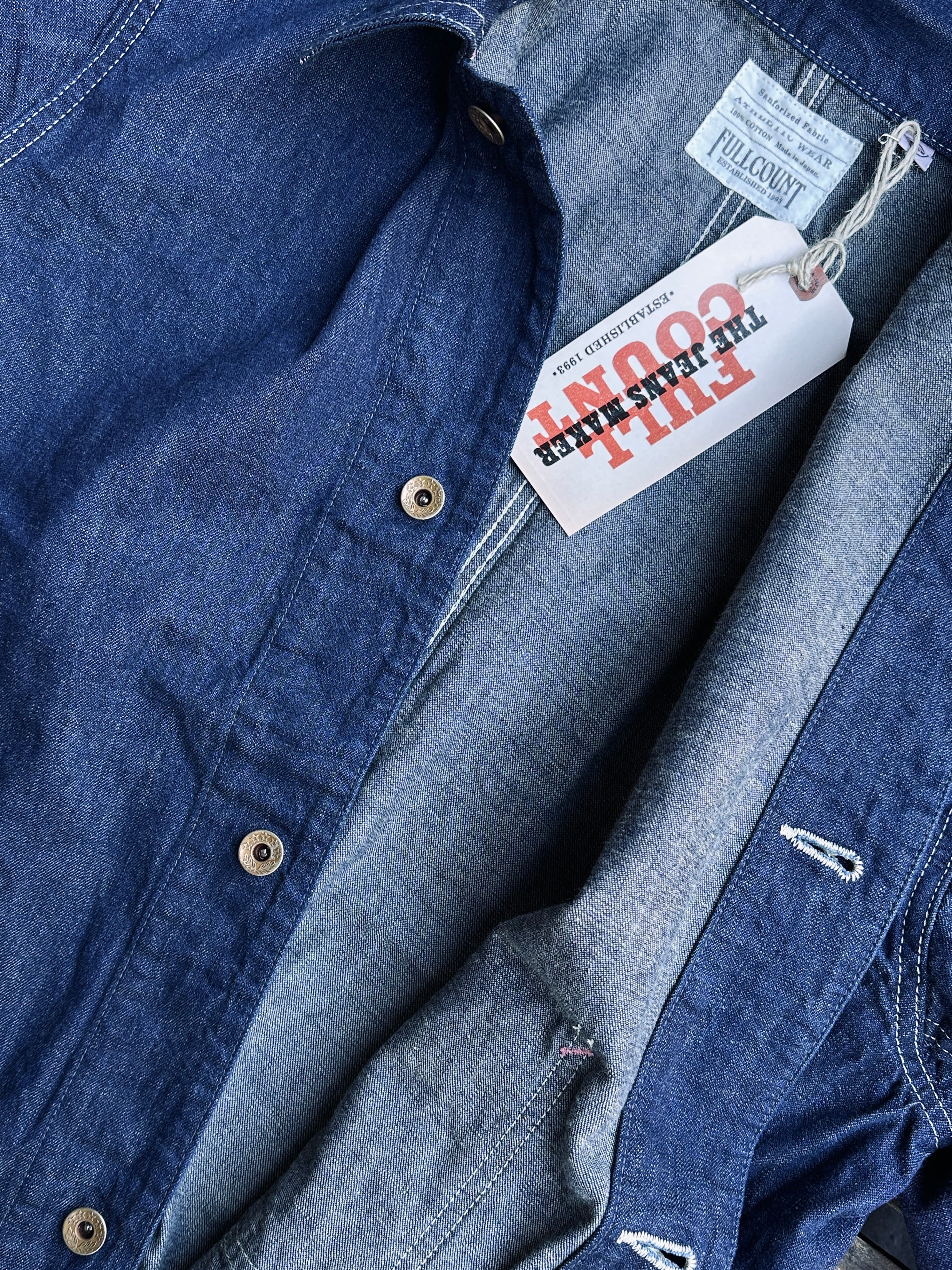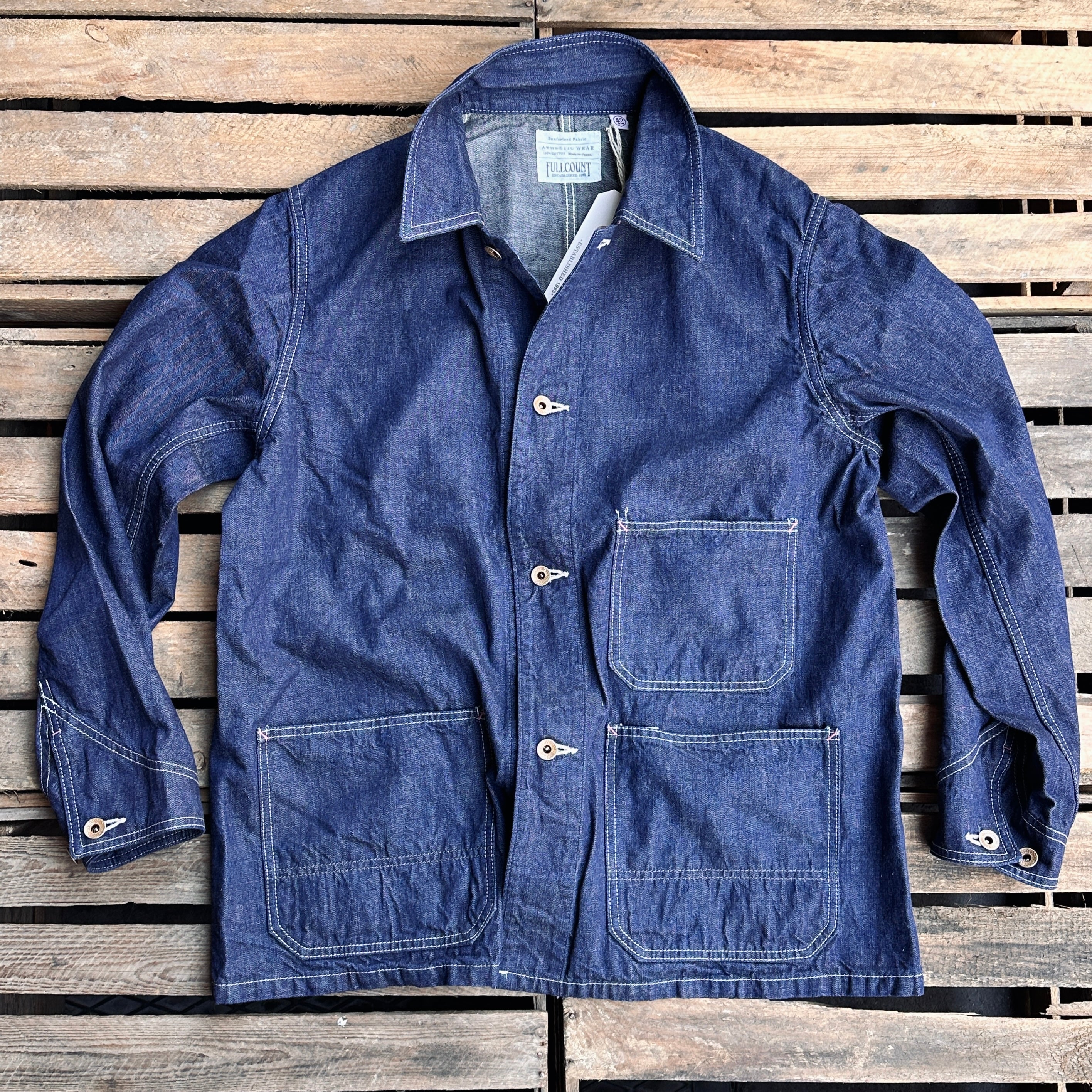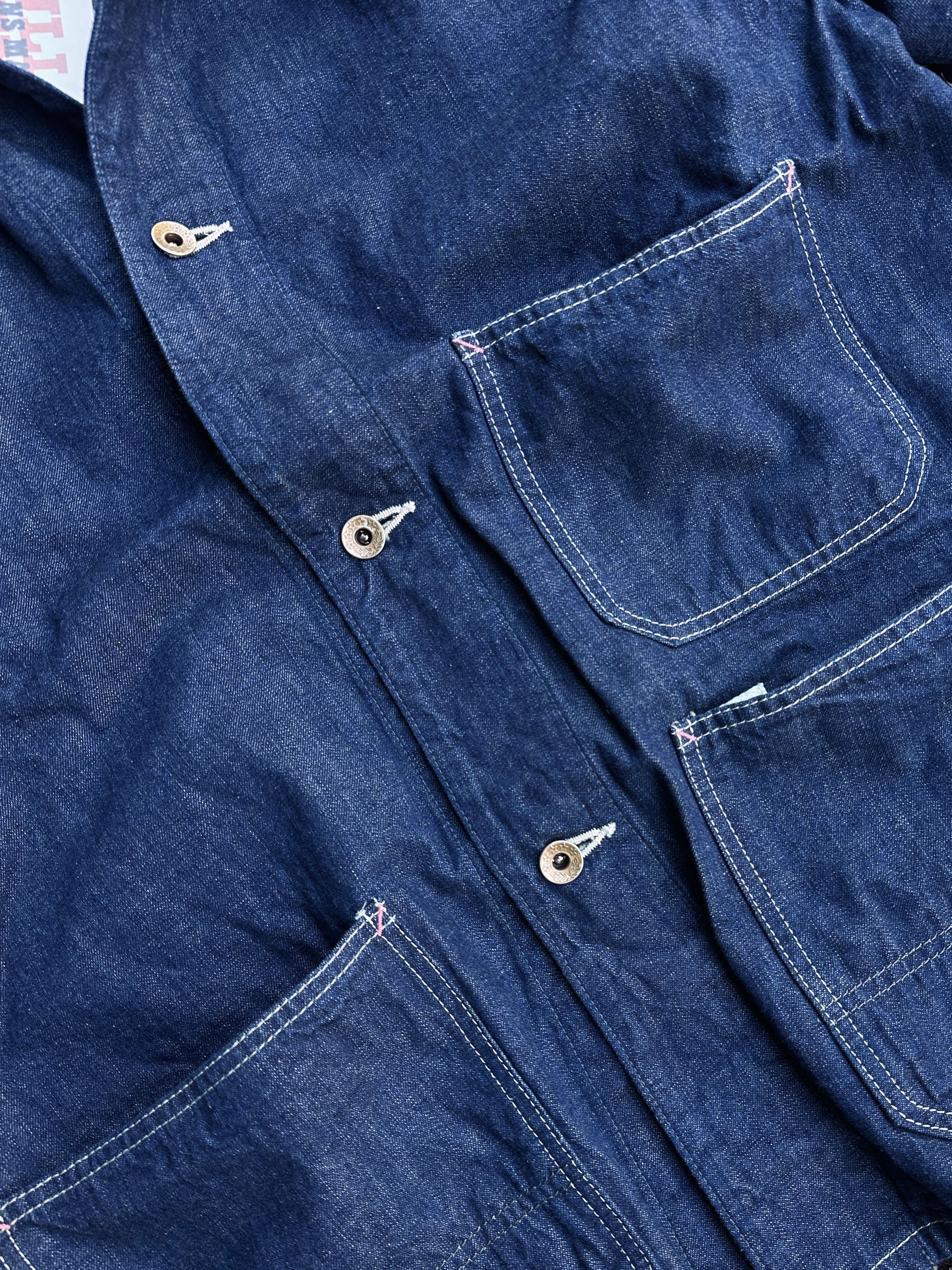 "A chore jacket (coveralls) with the simplified details found during the WWII period. 10oz Zimbabwe cotton military denim is used to give the look and feel of dead stock denim by doing up the weft in khaki beige. The hem is wide and the length is short, the 5 star donut buttons are aged with very simple details, and the stitch work has a distinct flavor. Packed full of attention to detail, we’re dropping this item with complete confidence and an eye to how great it will look after being worn for 5 years. This is meant to be set up with our Farmers Trousers made of the same material."