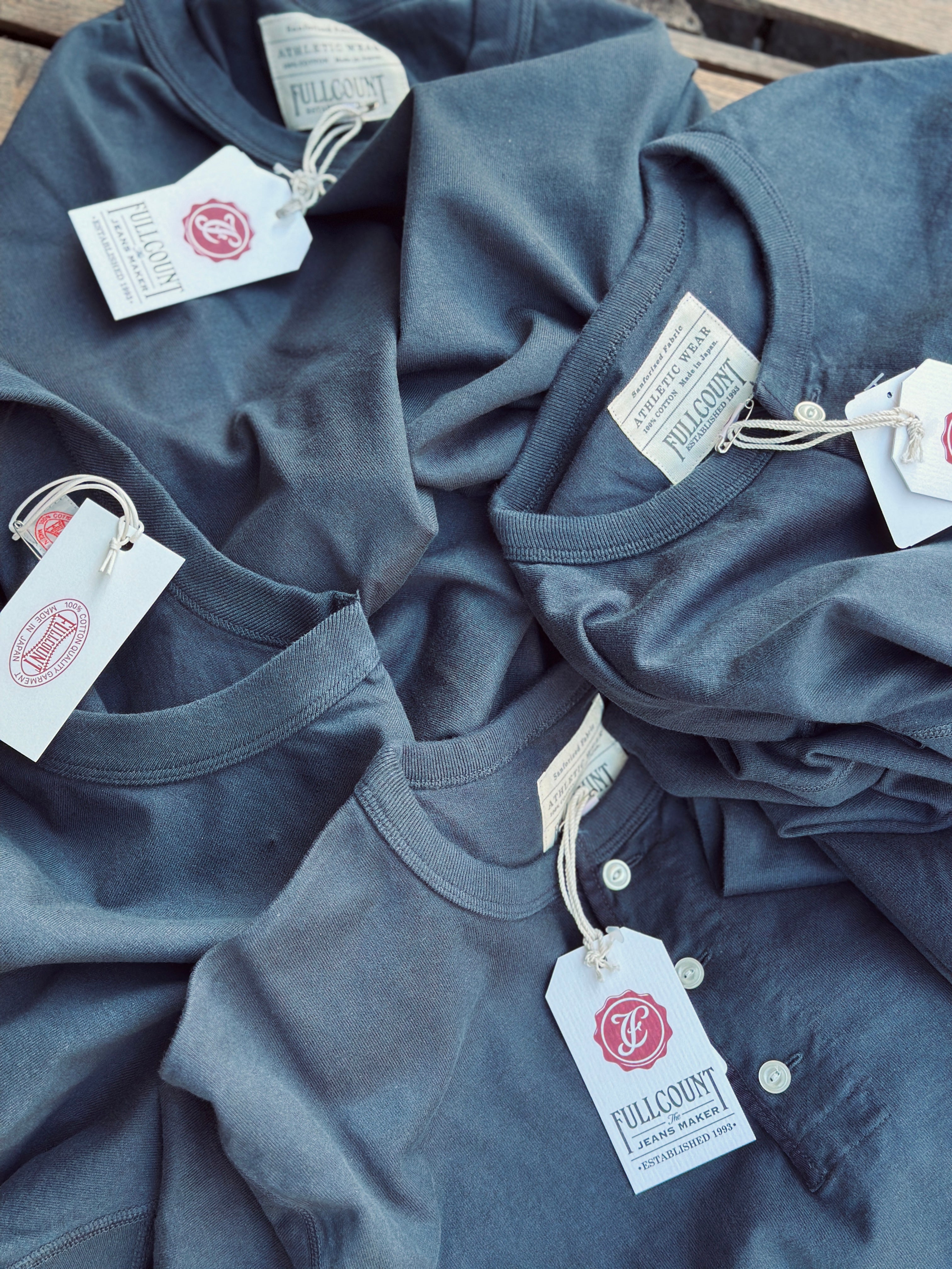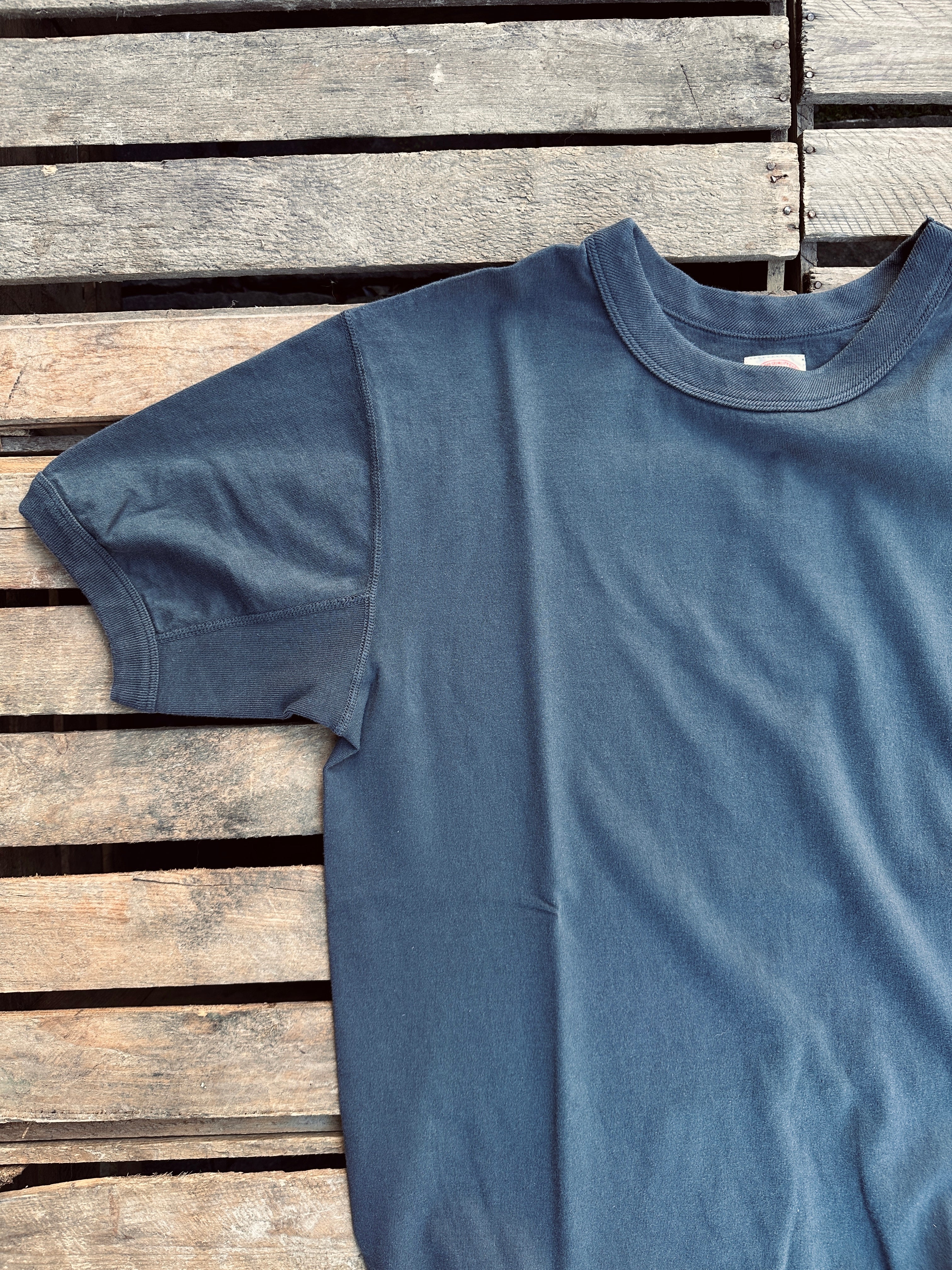 "This one is another heavyweight, but you wouldn’ t know it by the level of comfort it affords. We’ ve used a special spinning technique that causes the thread itself of contain air, and then we circular knit each shirt according to size, resulting in an unparalleled fit. This one will age perfectly without much effort, resulting in that classic American T-shirt look and feel. The collar, cuffs, and hem are all finished off with a binder and milling cutter which acts to prevent twisting, meaning you’ ll get years of use out of this shirt. On top of that, we use a 4-needle flat seam to attach the sleeves, making it all the more comfortable and easy on the body when worn. This one contains the distilled essence and experience of Full Count and is a piece that really sums up what we are trying to achieve."