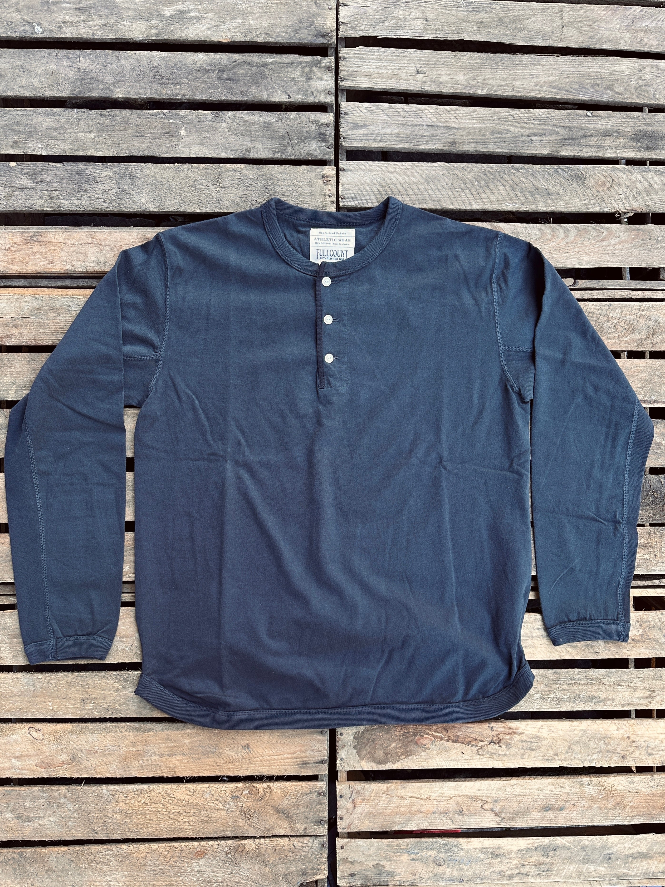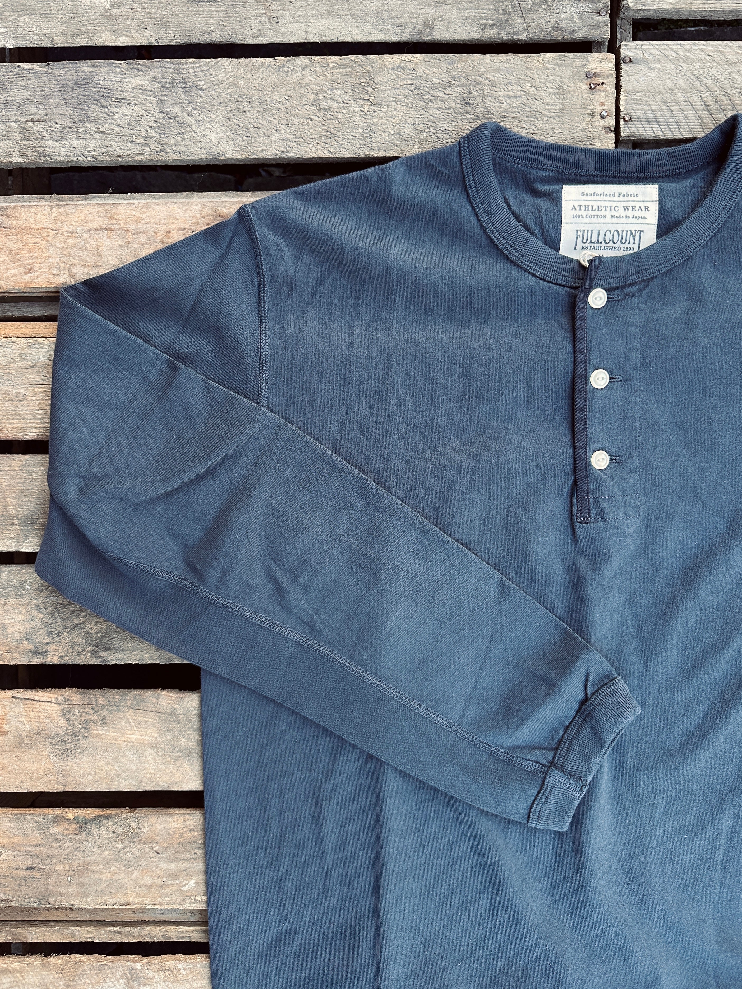 "Introducing the Henley neck version of Lot. 5222L Flat Seam Heavyweight Longsleeve T Shirt. The Henley neck adds a distinctive accent to the neckline, creating a casually stylish look when worn on its own. Unbuttoning the collar offers a rugged appearance, and the neck binding is narrower compared to our standard T-shirt, enhancing this effect. Despite being heavyweight, this shirt provides an stress-free and comfortable feel, which further improves as you wear it, thanks to the air-trapping quality of the yarn. We've used a 19-gauge thread to recreate the texture akin to American T-shirts. The sleeve attachment features a 4-needle flat seam, eliminating discomfort when worn. The collar is finished with a half-bias binder that resembles vintage styles, ensuring it remains in great shape even after 5 years of use. Additionally, we've added highly elastic ribbing under the arms and other details to ensure this shirt becomes even more comfortable with every wear, reflecting the craftsmanship and attention to detail that Fullcount is known for."