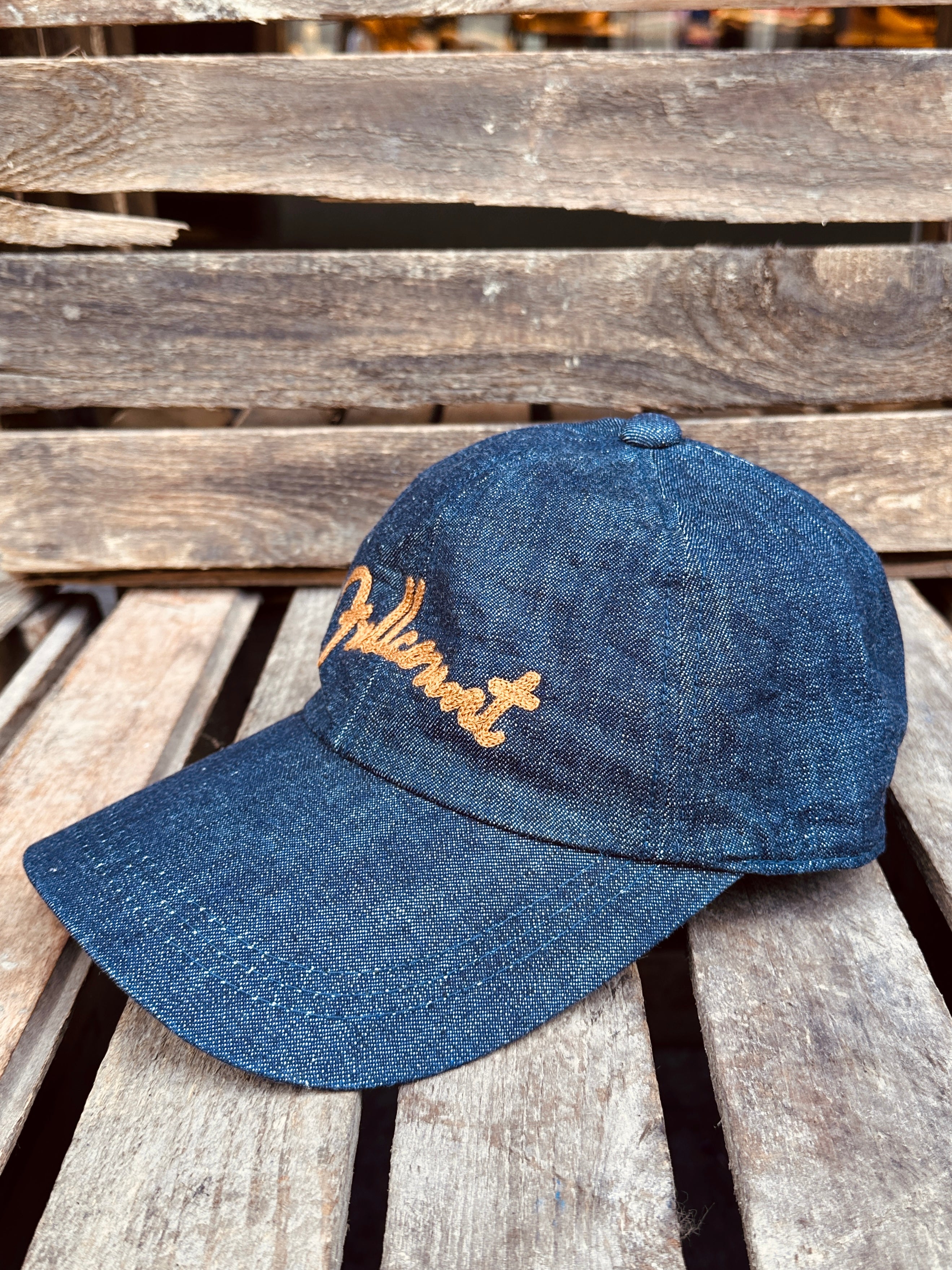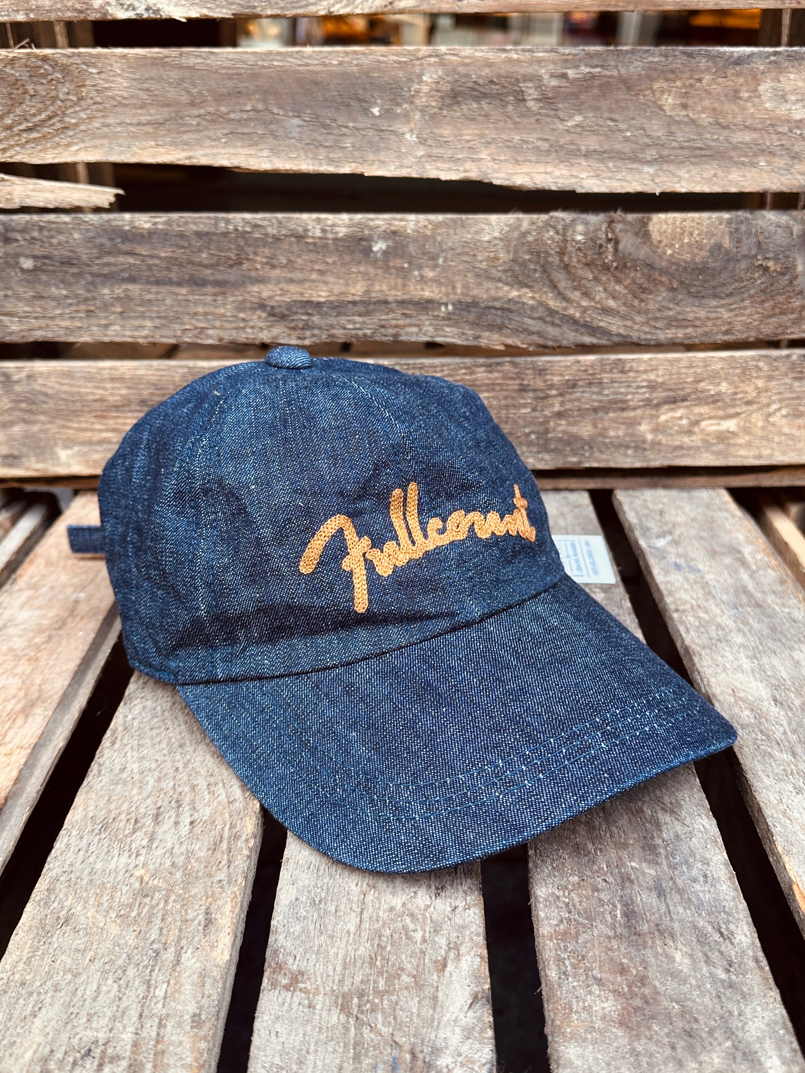 "A denim cap with a chain embroidery on the classic denim baseball cap with the full count logo in honor of the 50s logo of a famous musical instrument manufacturer.