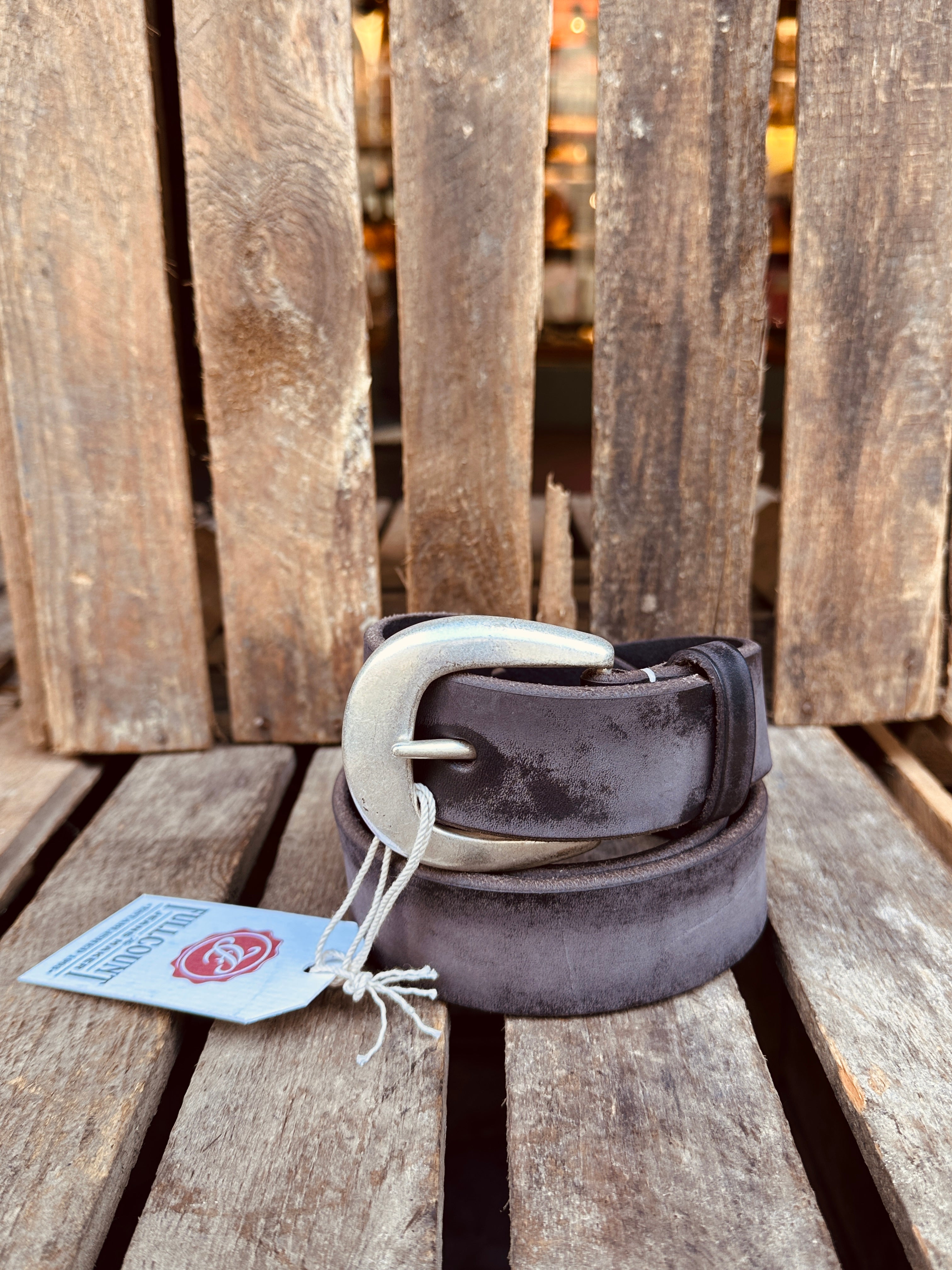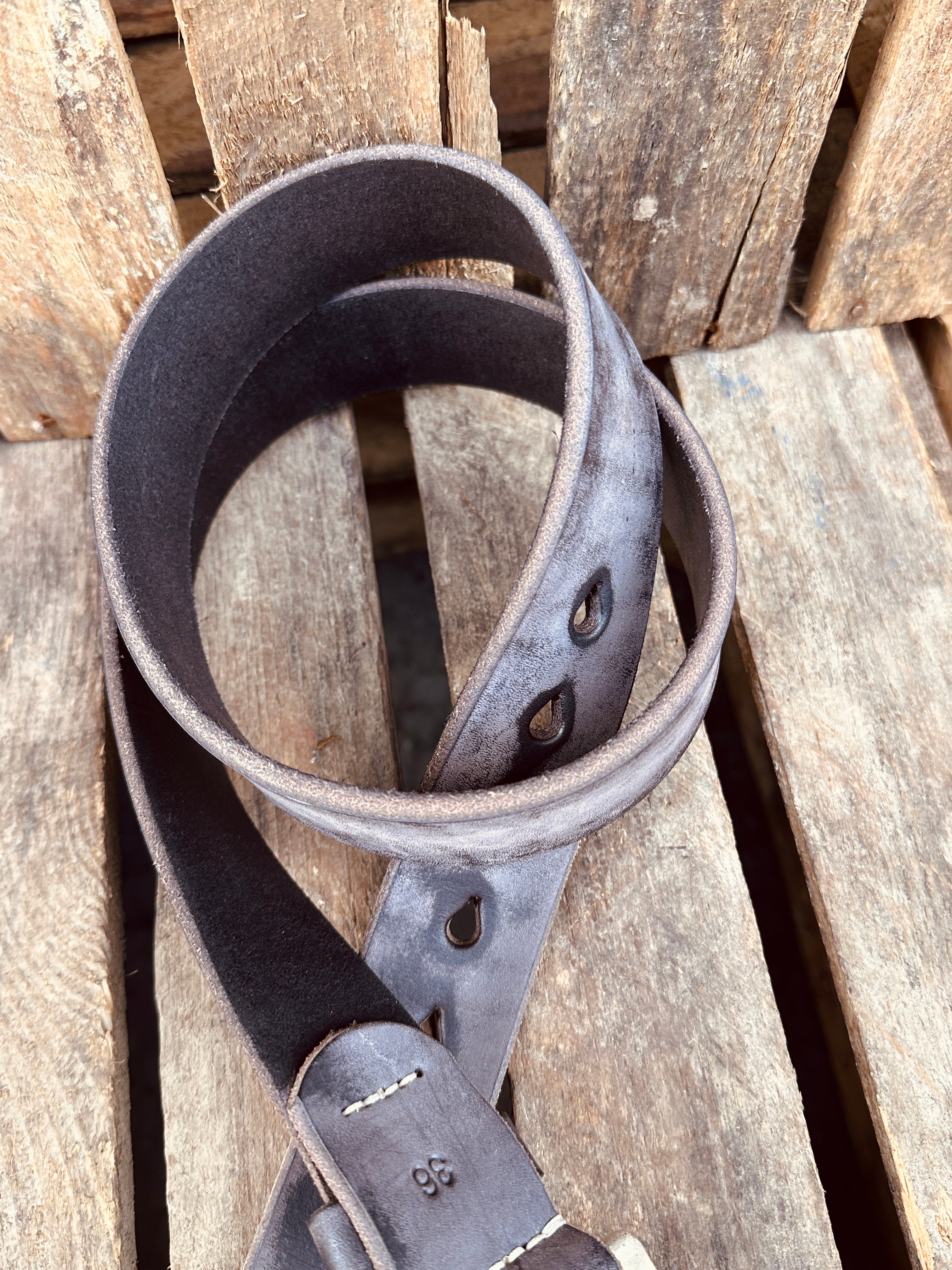 "The extra-thick leather is known for maintaining a smooth surface even after extended use. This results in various nuances and character evolving as it ages. The leather is tanned with 100% vegetable tannins in the shibu layer for about a month. The carefully tanned leather retains its strength over the years, without losing suppleness. While it may appear rugged, like wild leather, this belt combines robustness with a delicate and smooth feel. It's a leather accessory that's meant to be used and appreciated for its evolving character over time."