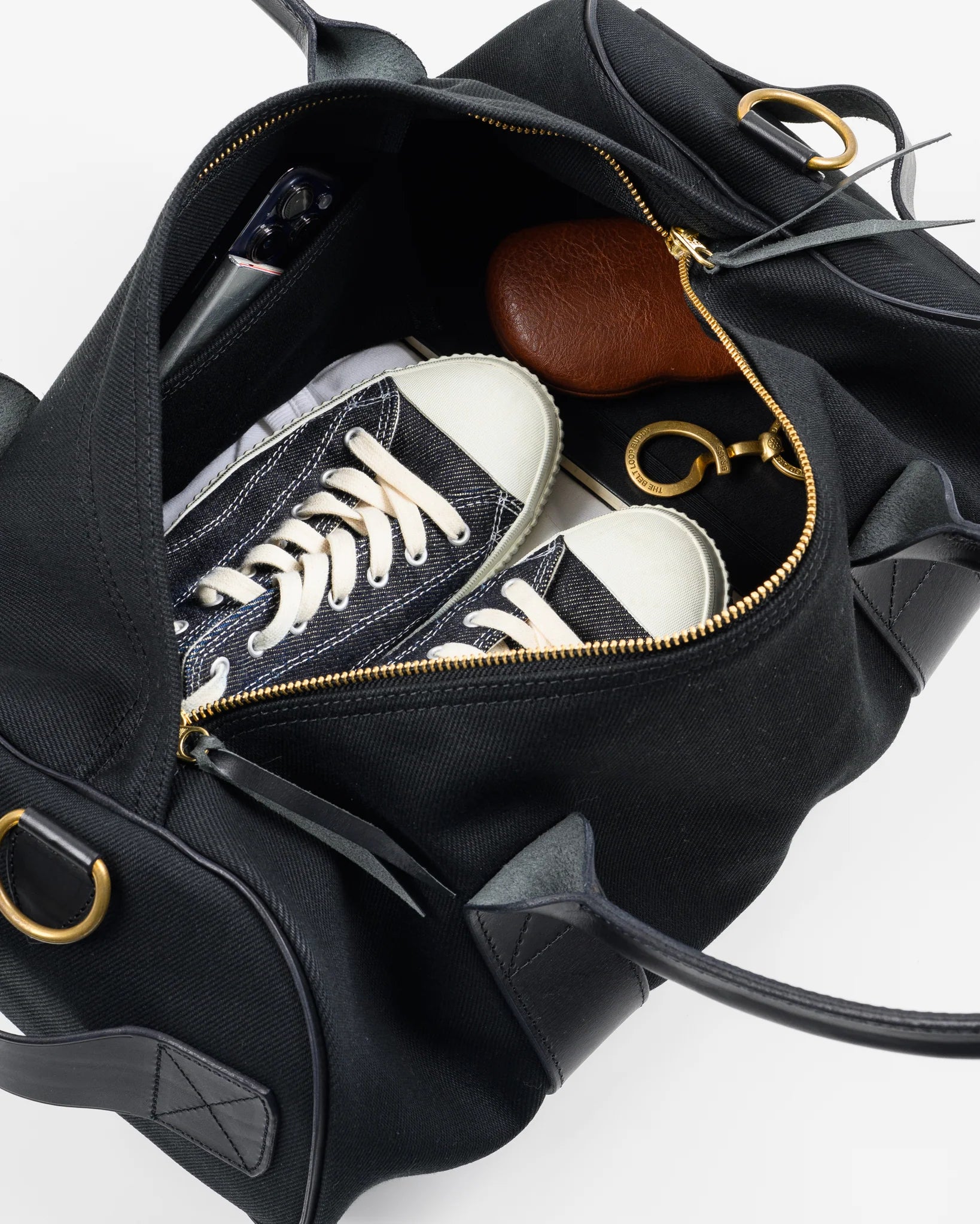 This 3-way duffle bag is constructed from the IH "Superblack" reactive dyed 21oz denim and features 4mm veg tanned Buttero cowhide handles and accents that are sourced from the iconic Walpier Tannery in Tuscany, Italy. Its compact size and an array of carrying options that include an adjustable webbed cotton shoulder strap and leather top of size handles make for a functional and versatile overnight or day bag.