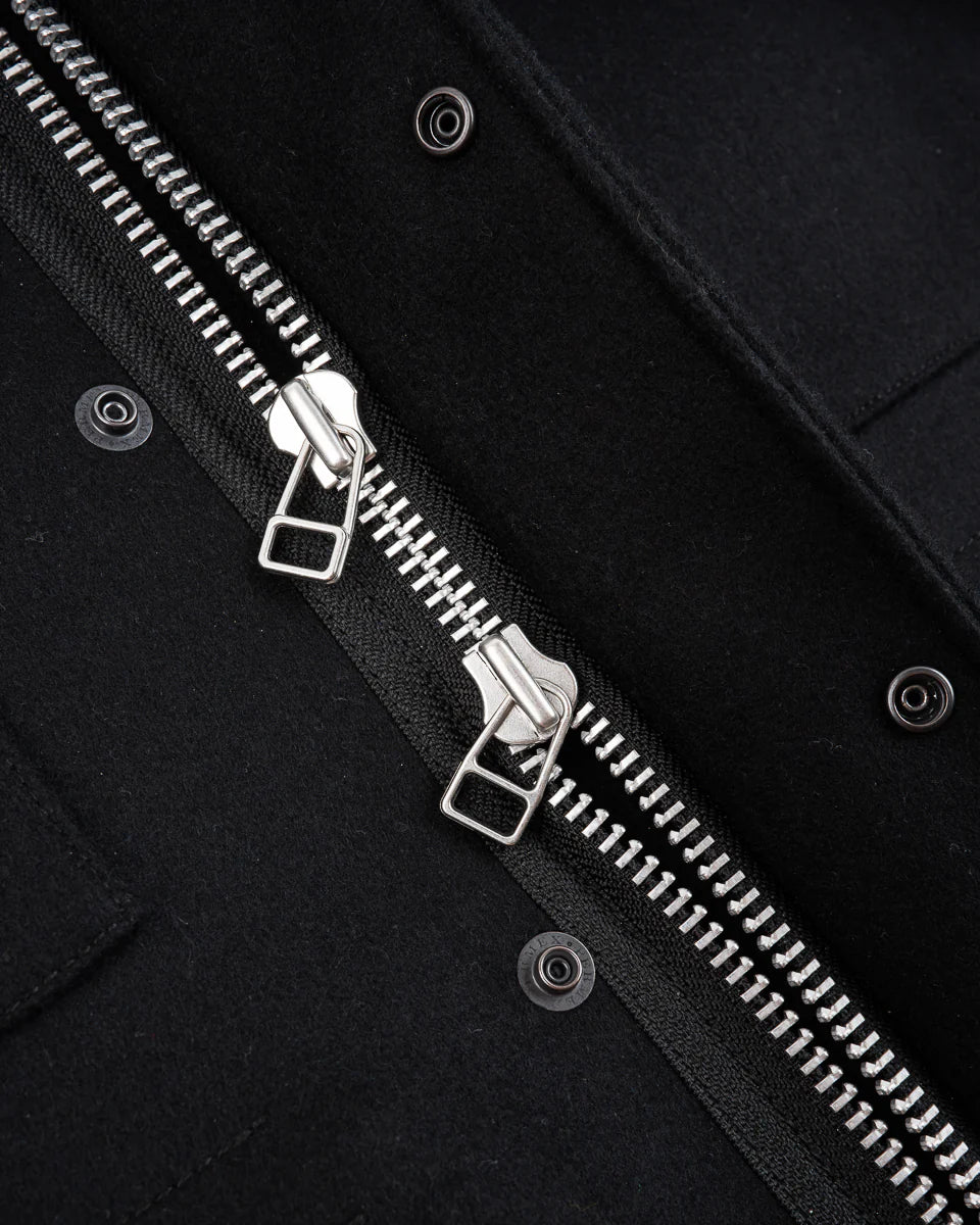 - Two-way over spec’d YKK main zipper under snap fastening placket