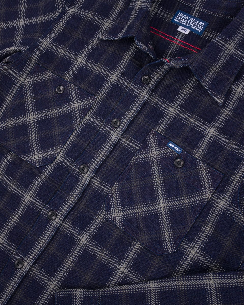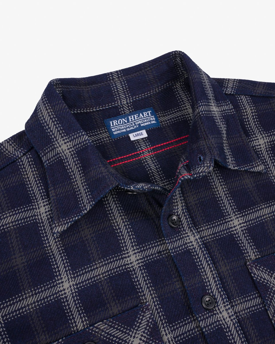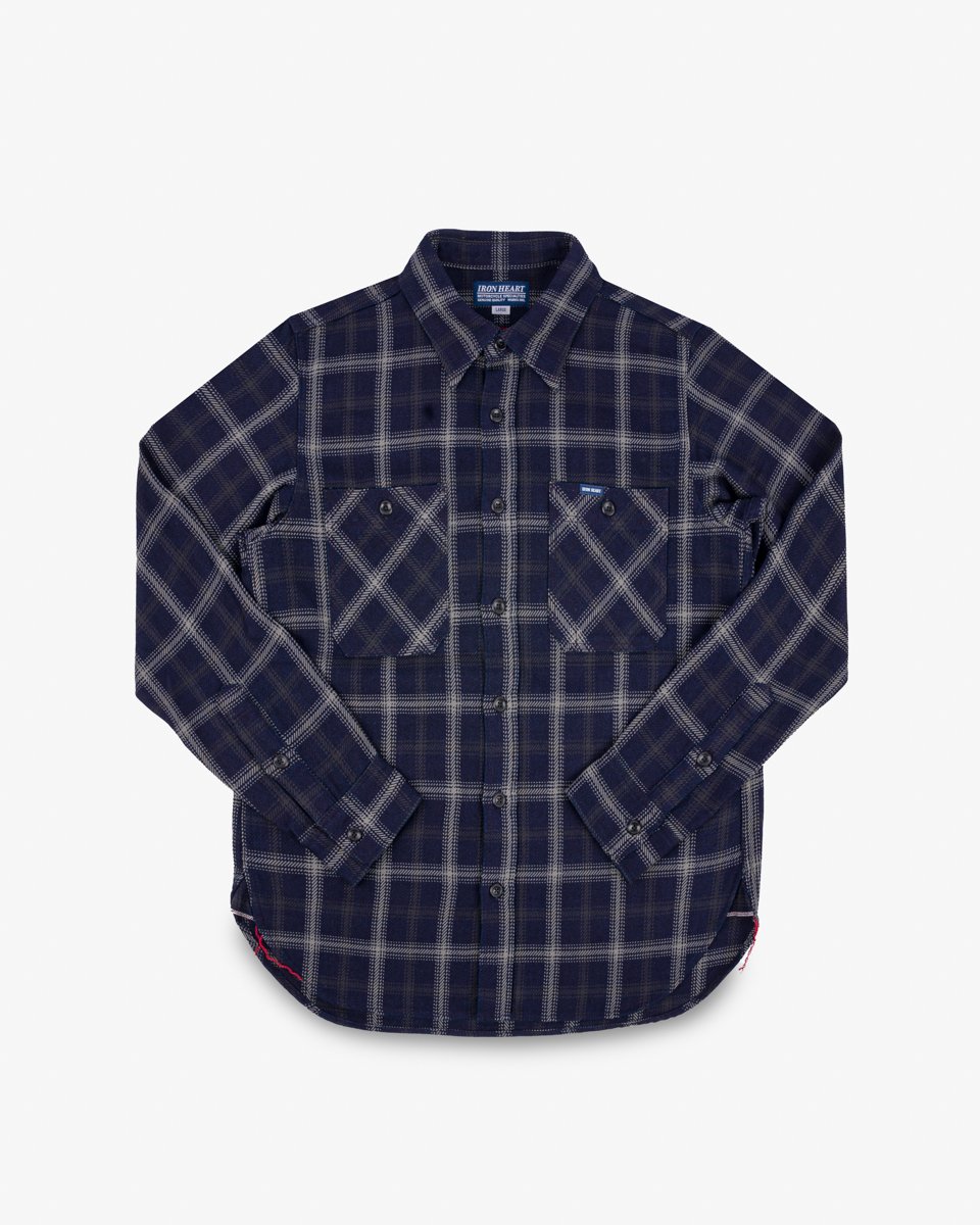 Please note, to differentiate this colourway from the pure indigo shirts, Iron Heart refers to this plaid as a “black”. However, in person, the dominant colour appears more of a deep indigo hue, which will gradually lighten with wear and washing.