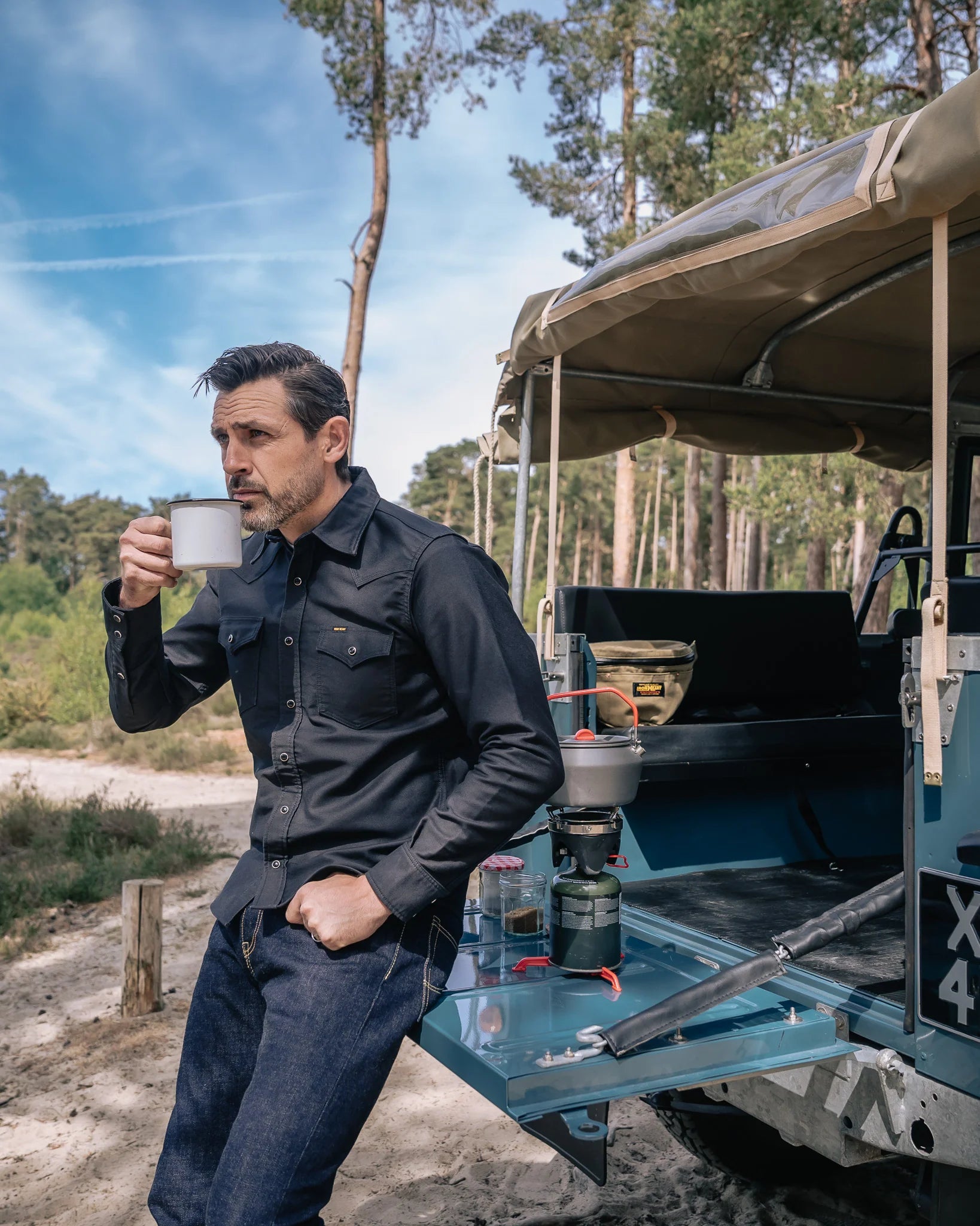 This is the classic IH western shirt, cut from 12oz military-style moleskin fabric. “Moleskin” is characterised by its brushed surface (which mimics the velvety feel of a mole’s fur), creating a fabric that is both substantial and soft, offering comfort and warmth in the colder seasons.