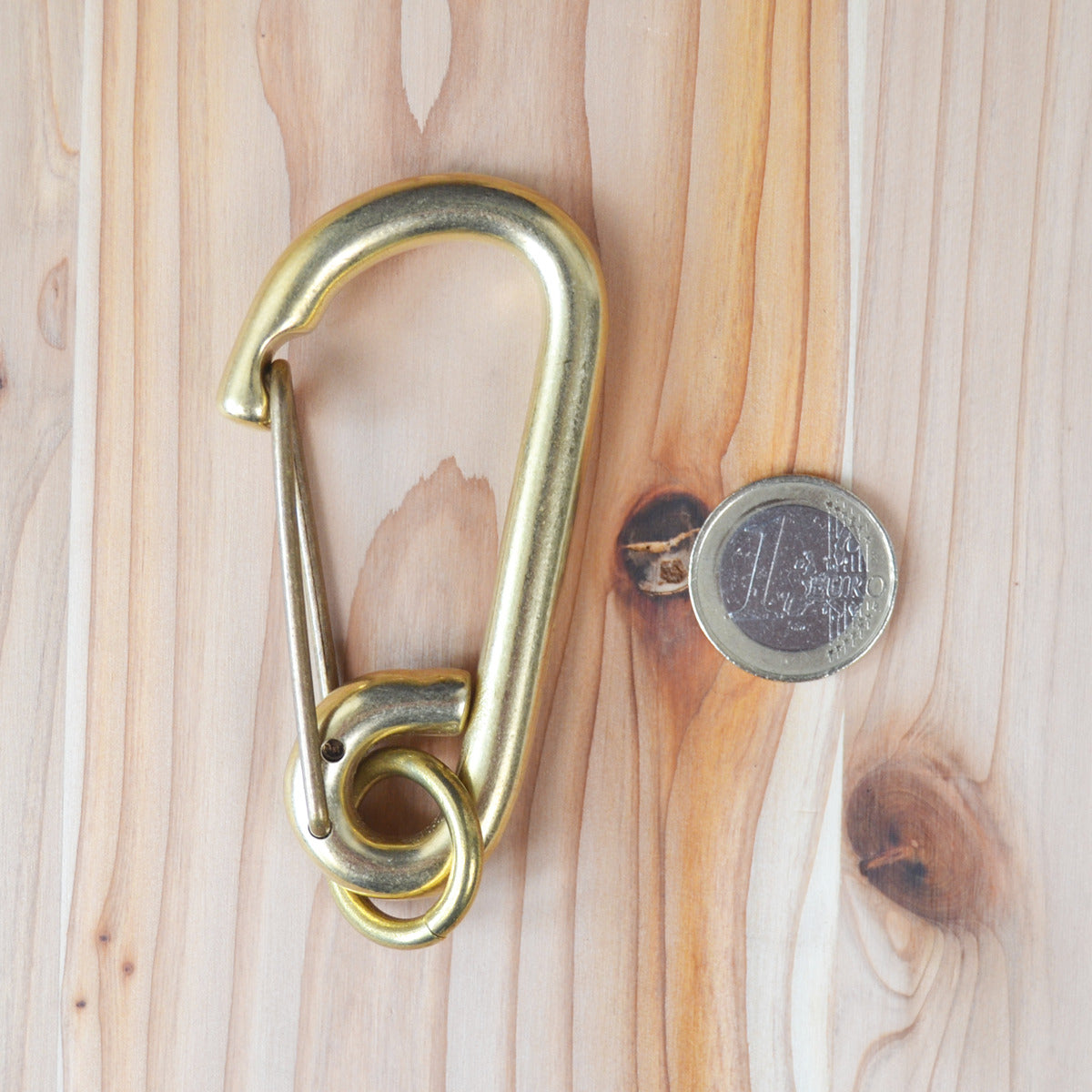 Large and heavy sand casted carabiner with circle ring. Manufactured by a hardware company since 1953. Only the spring lever is made of steel and plated in solid brass color. Comes with wax paper envelope.