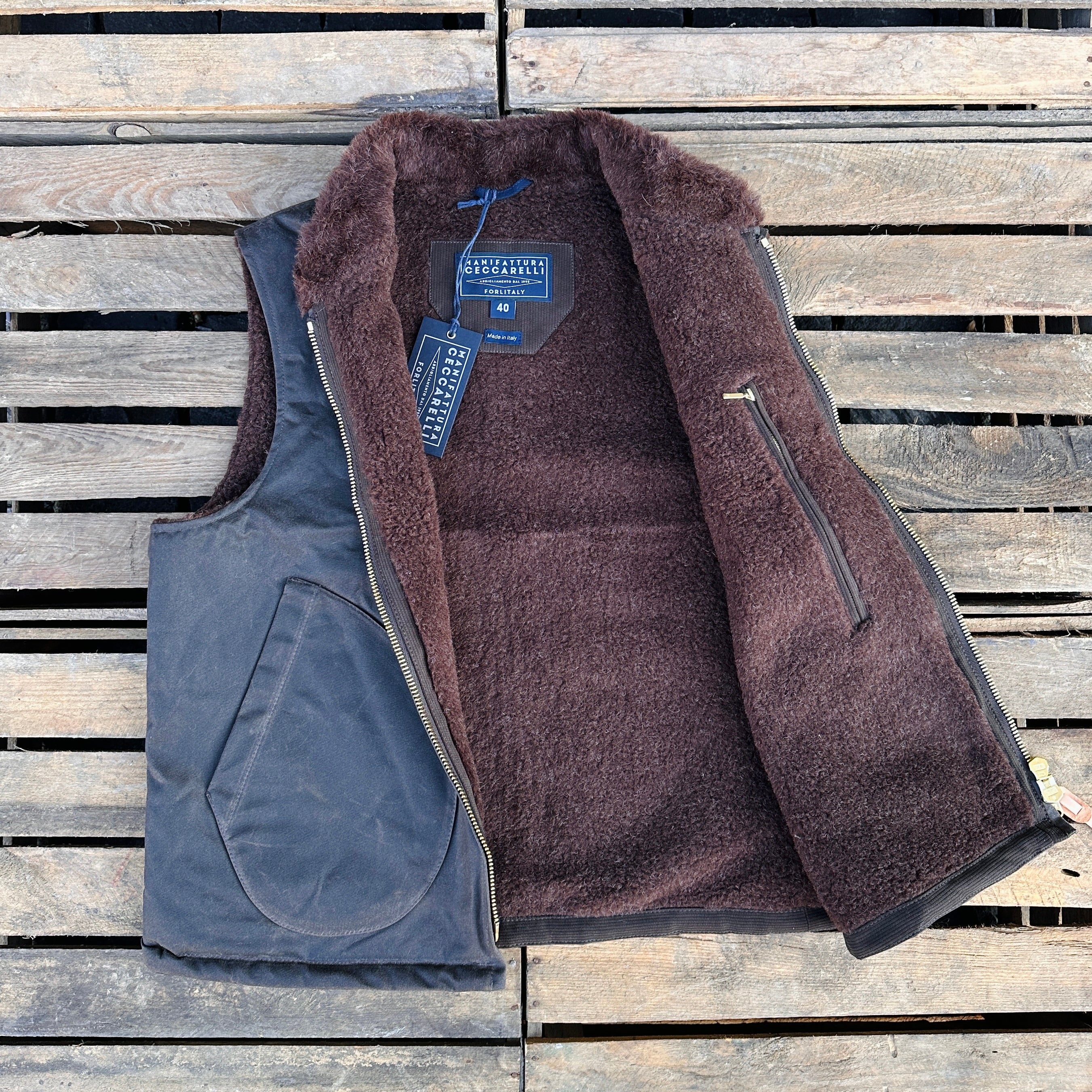 Vest made of water-repellent waxed fabric and padded with wool wadding, coming from sheep raised in Italy.