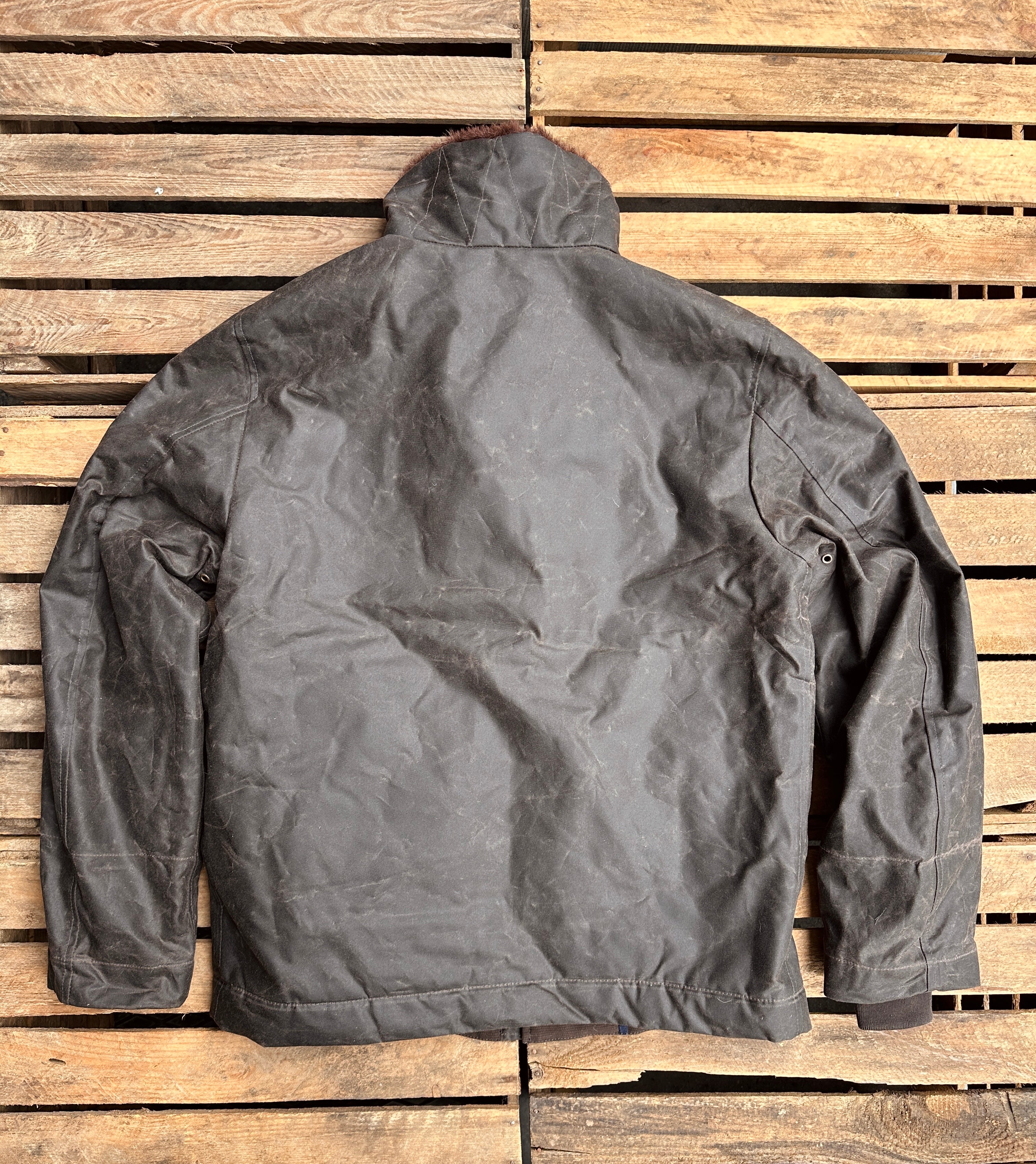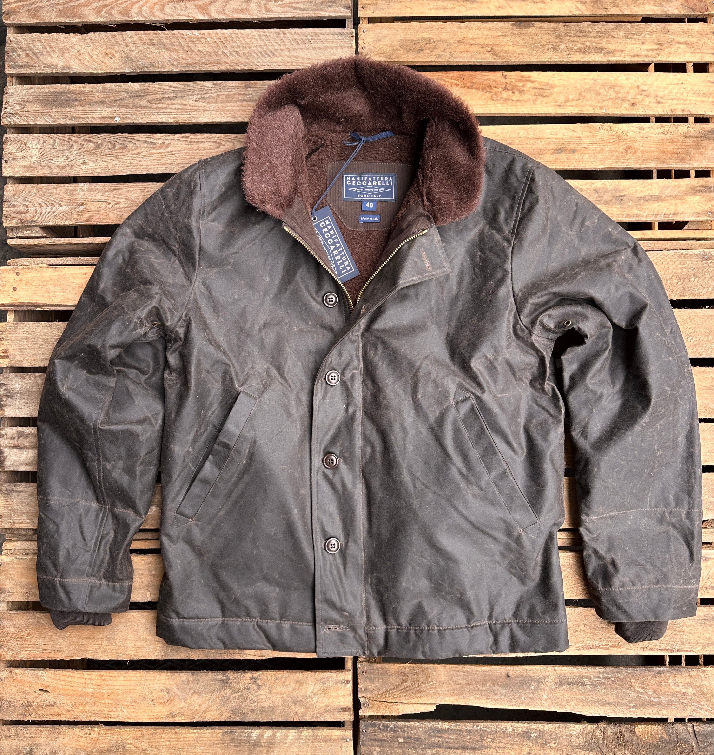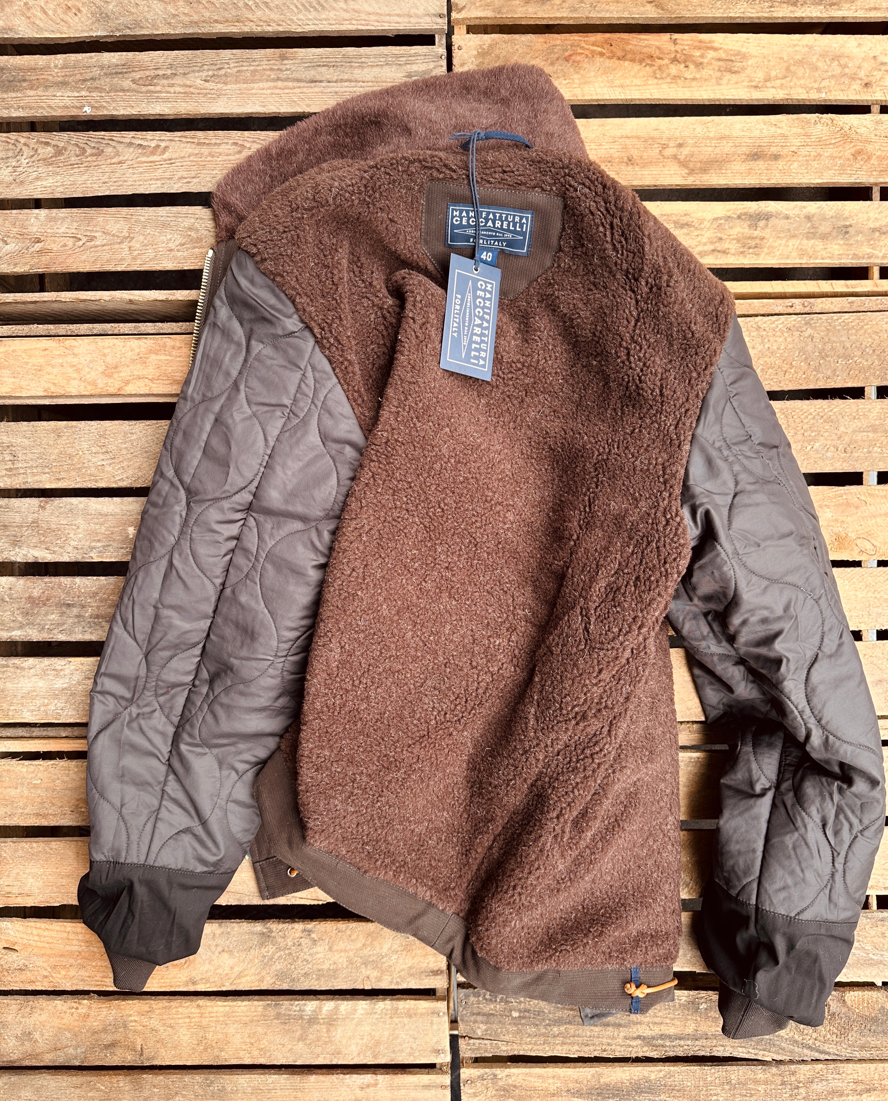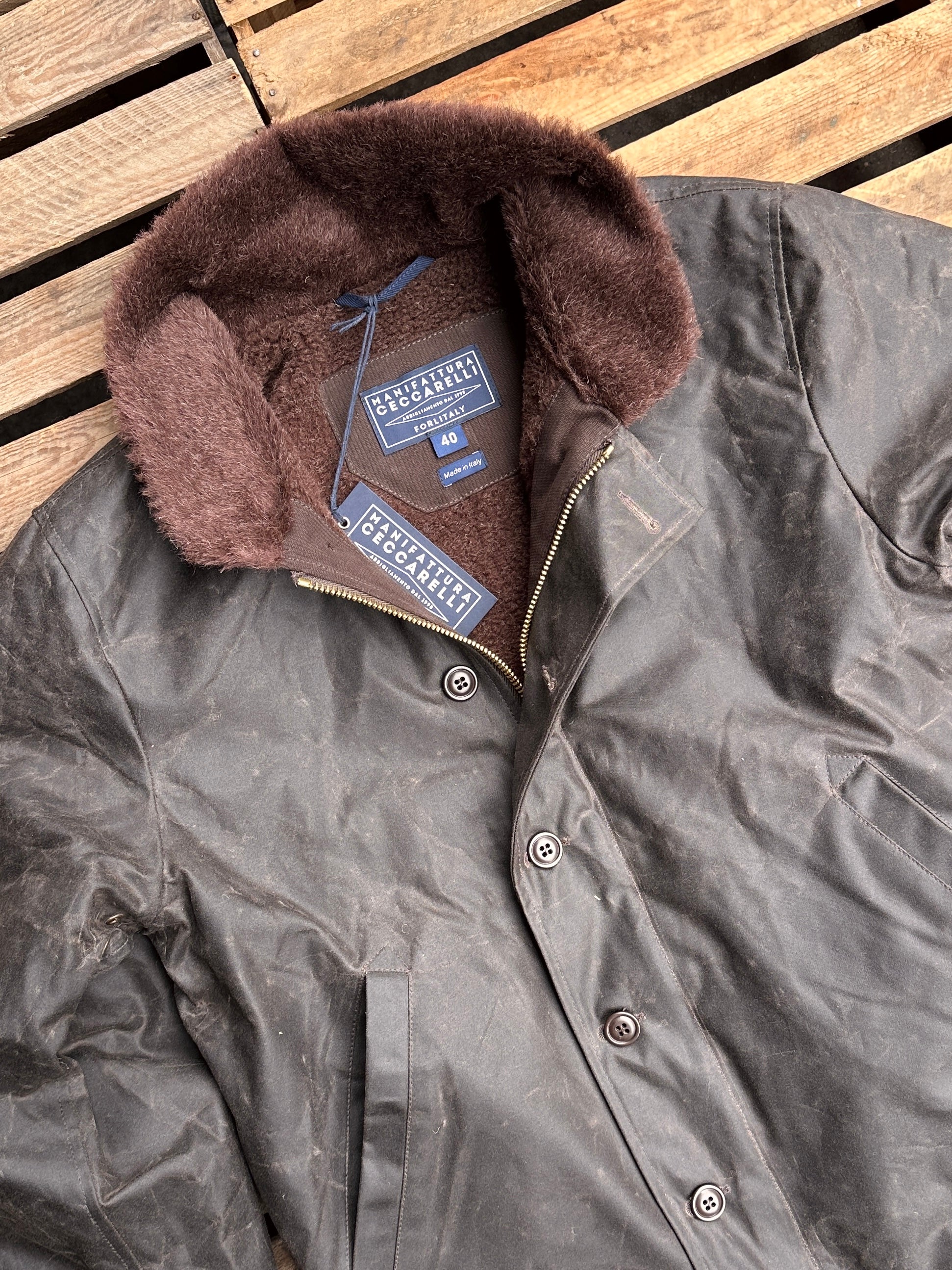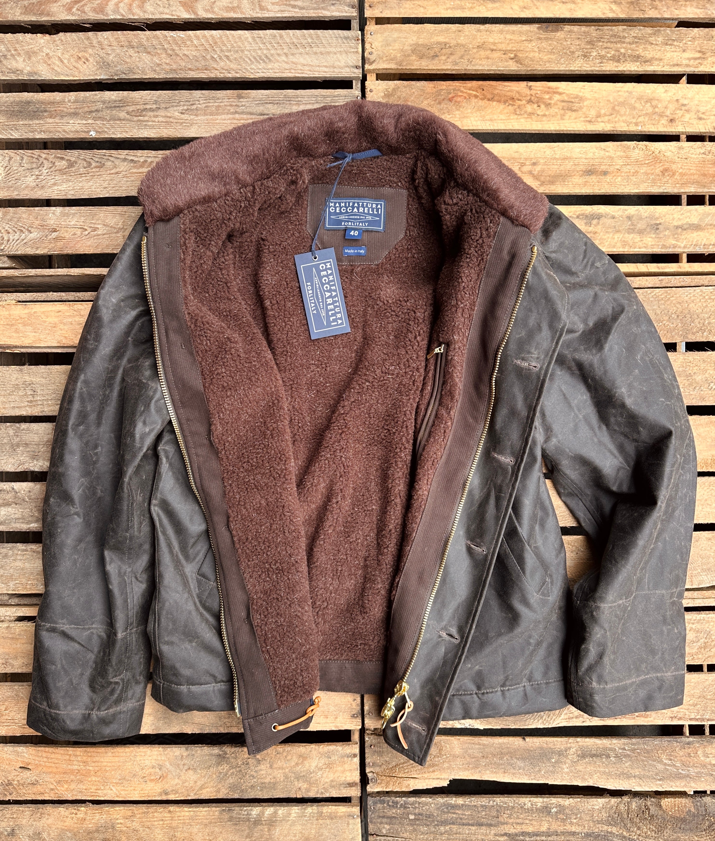 It is the classic jacket worn by sailors on the deck of the ship, made of water-repellent wax-coated fabric and padded in the body and sleeves with wool wadding from sheep raised in Italy.