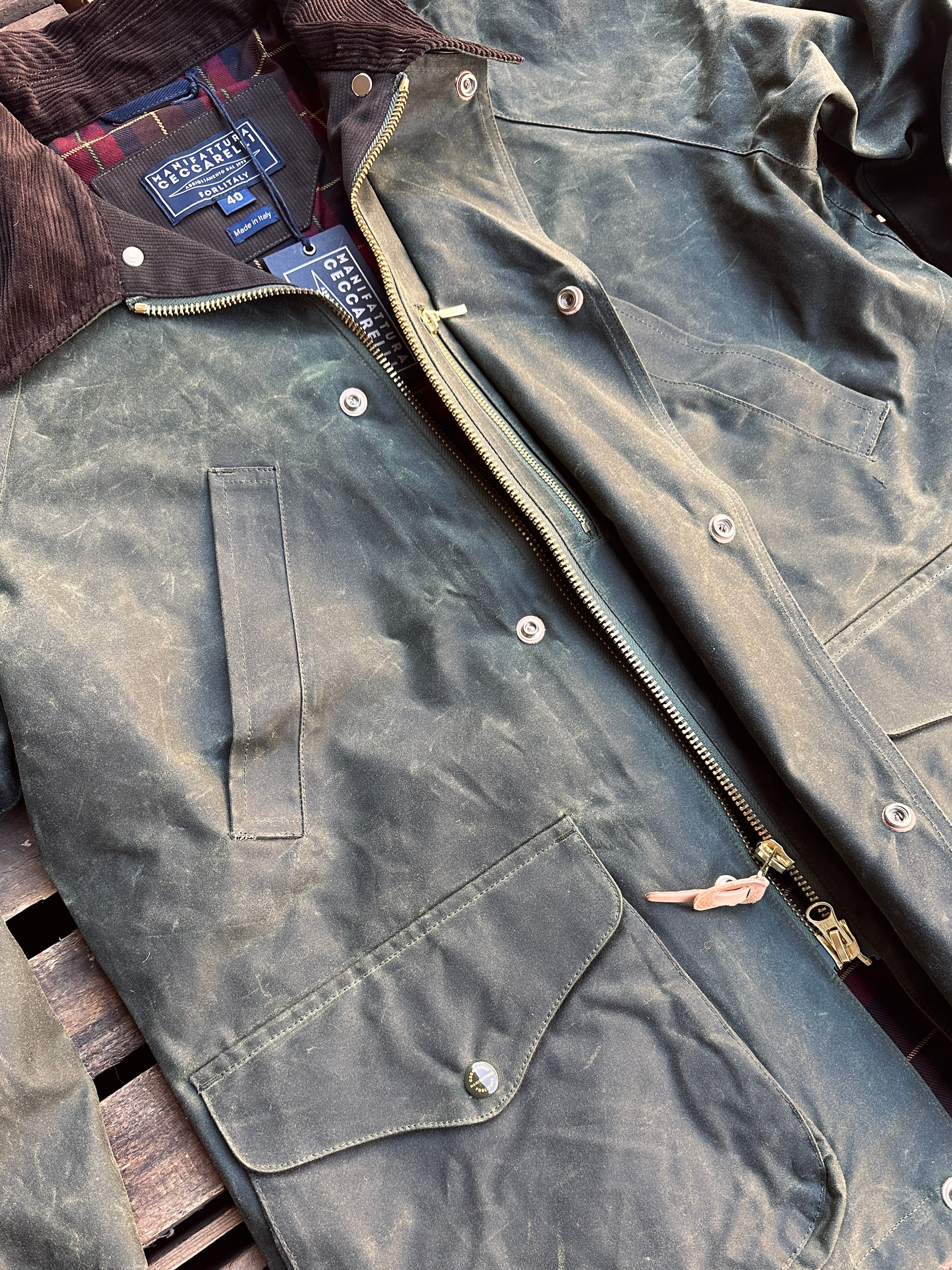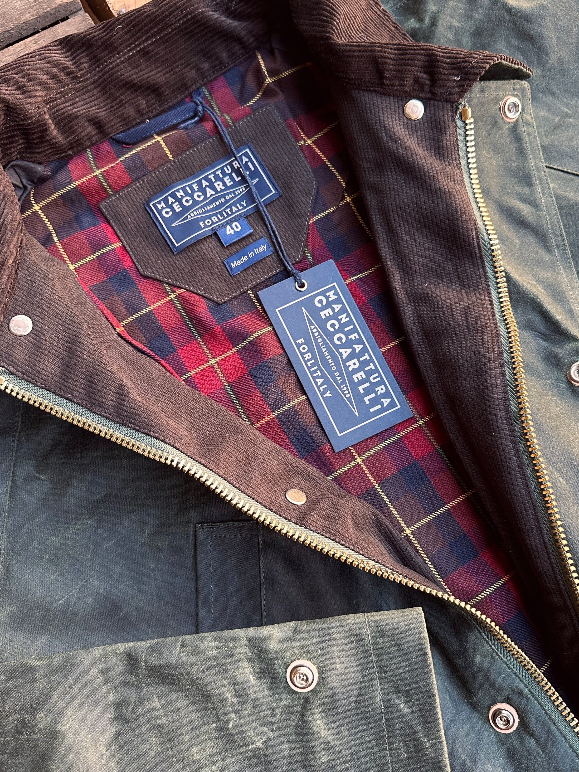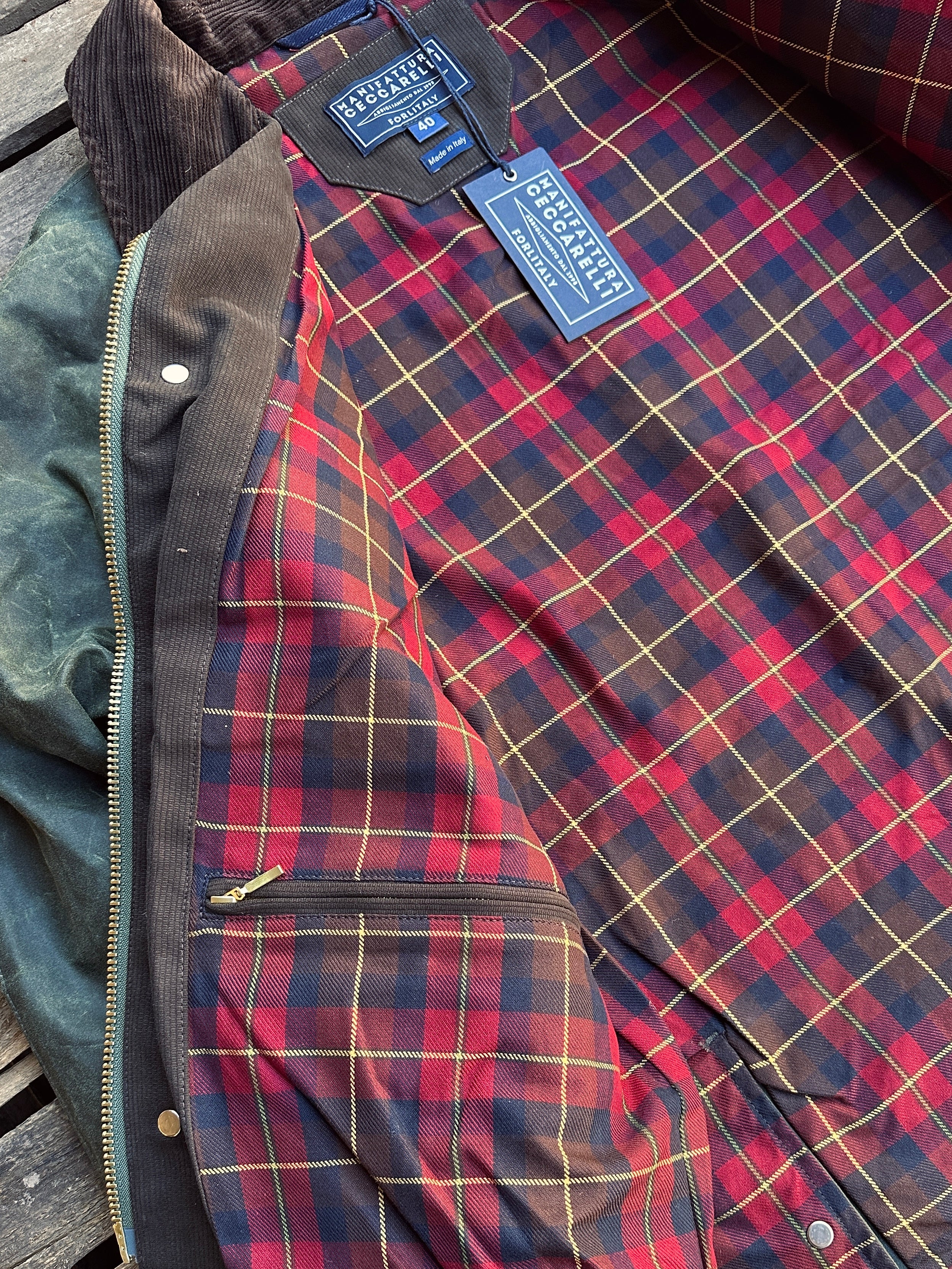 A perfect medium-weight jacket for spring and autumn, made of water repellent waxed cotton. The stitching thread is water repellent so as to increase resistance to rain penetration. The jacket is light and has an inner lining, an internal zipped security pocket and two back vents to be more comfortable when sitting. The front closure has a double-slider zip and a windproof flap with press studs. The snap buttons feature reinforcing natural leather disks.