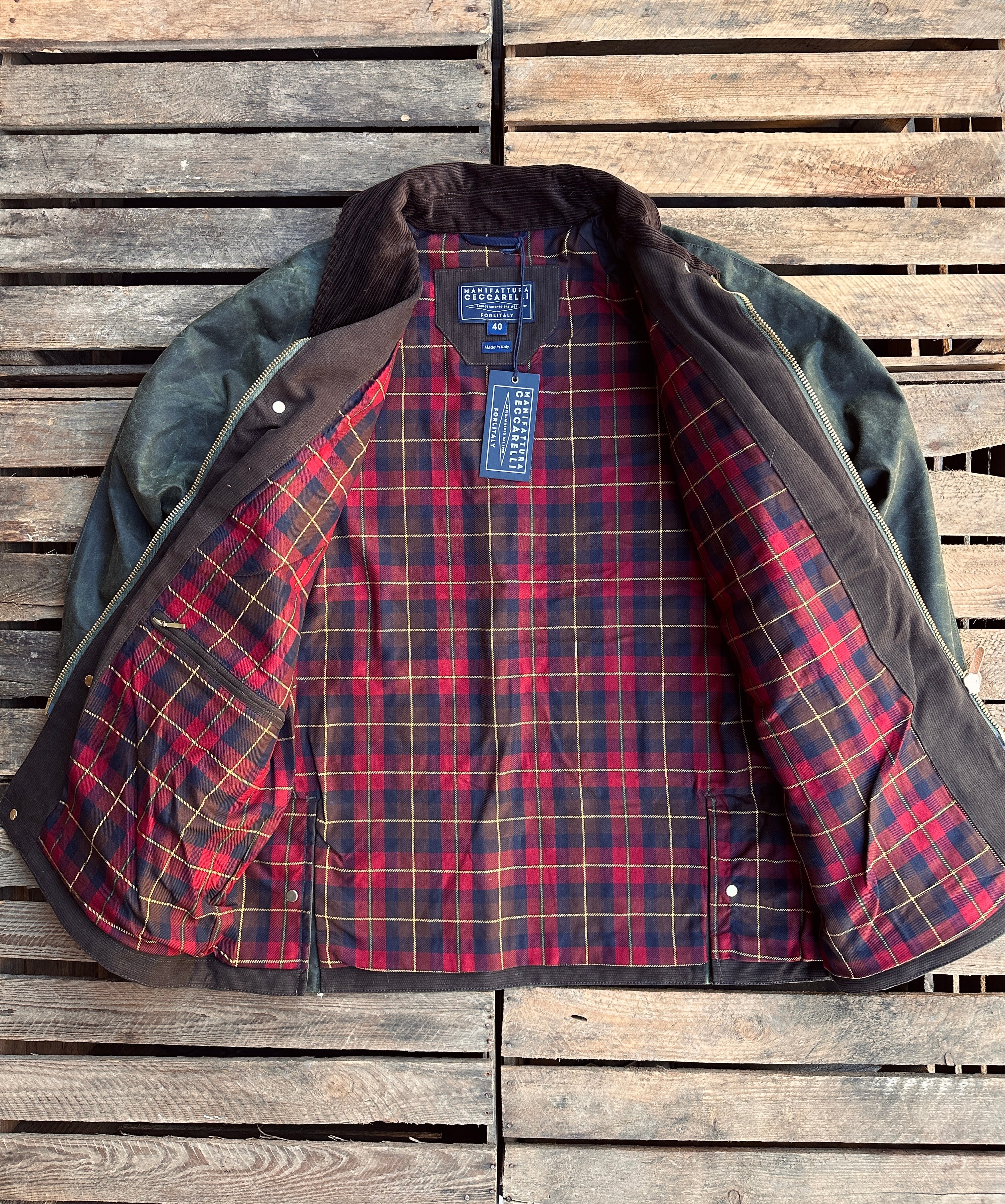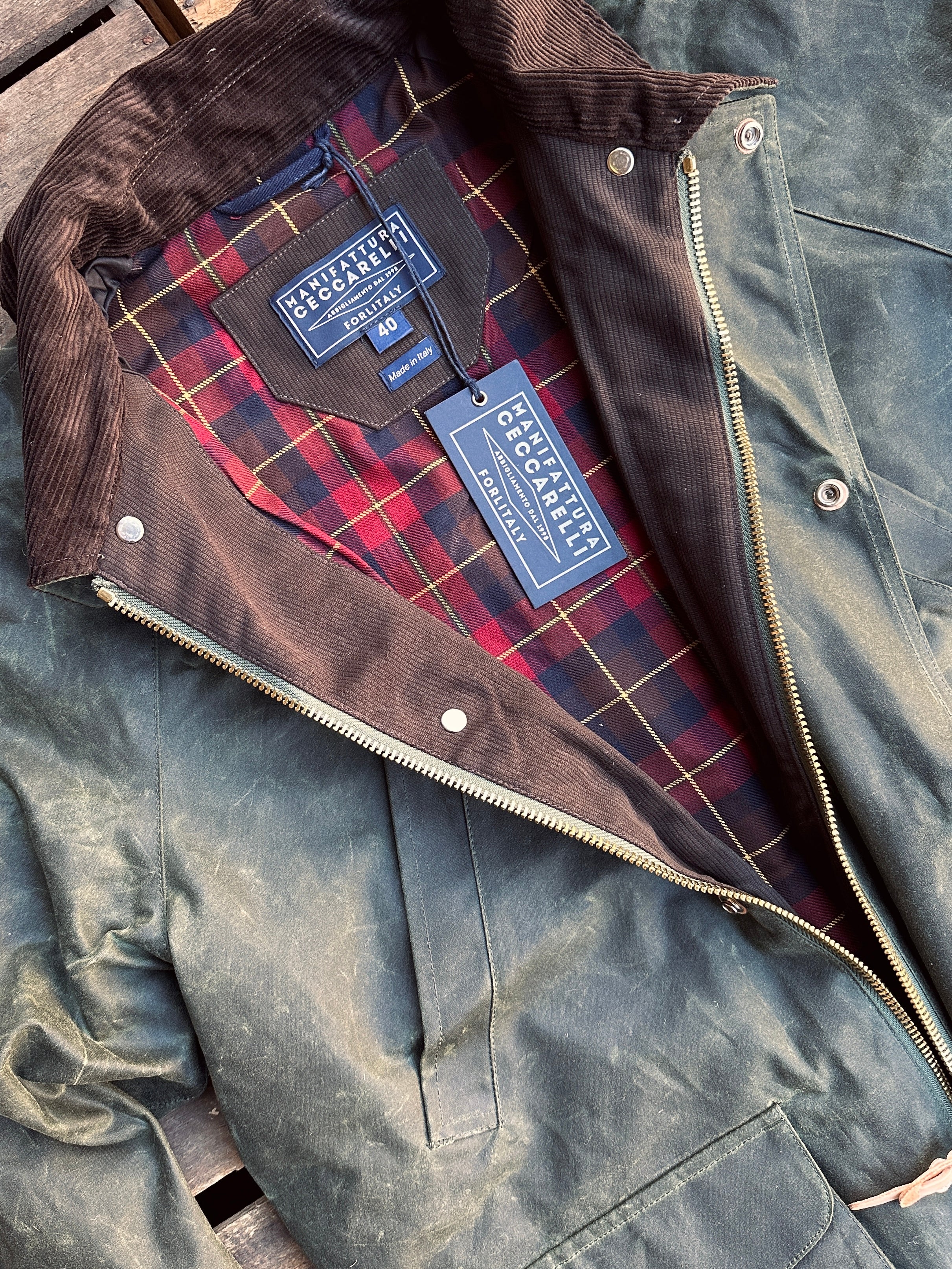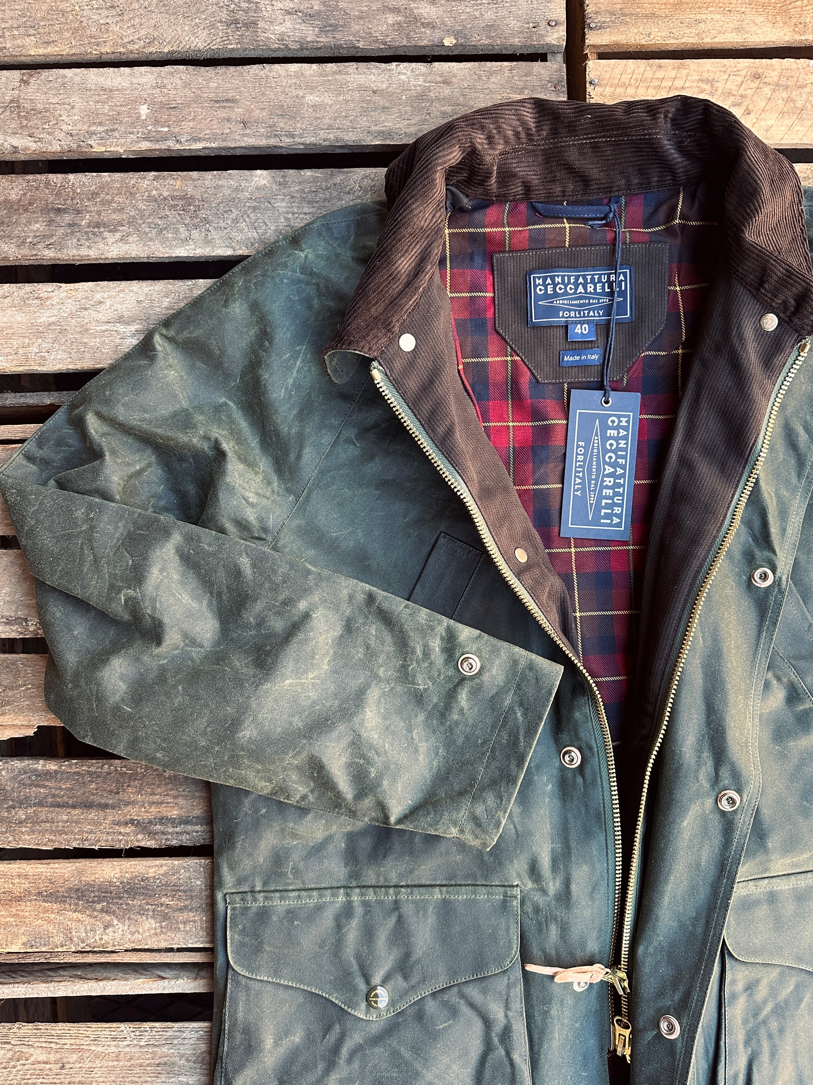 A perfect medium-weight jacket for spring and autumn, made of water repellent waxed cotton. The stitching thread is water repellent so as to increase resistance to rain penetration. The jacket is light and has an inner lining, an internal zipped security pocket and two back vents to be more comfortable when sitting. The front closure has a double-slider zip and a windproof flap with press studs. The snap buttons feature reinforcing natural leather disks.
