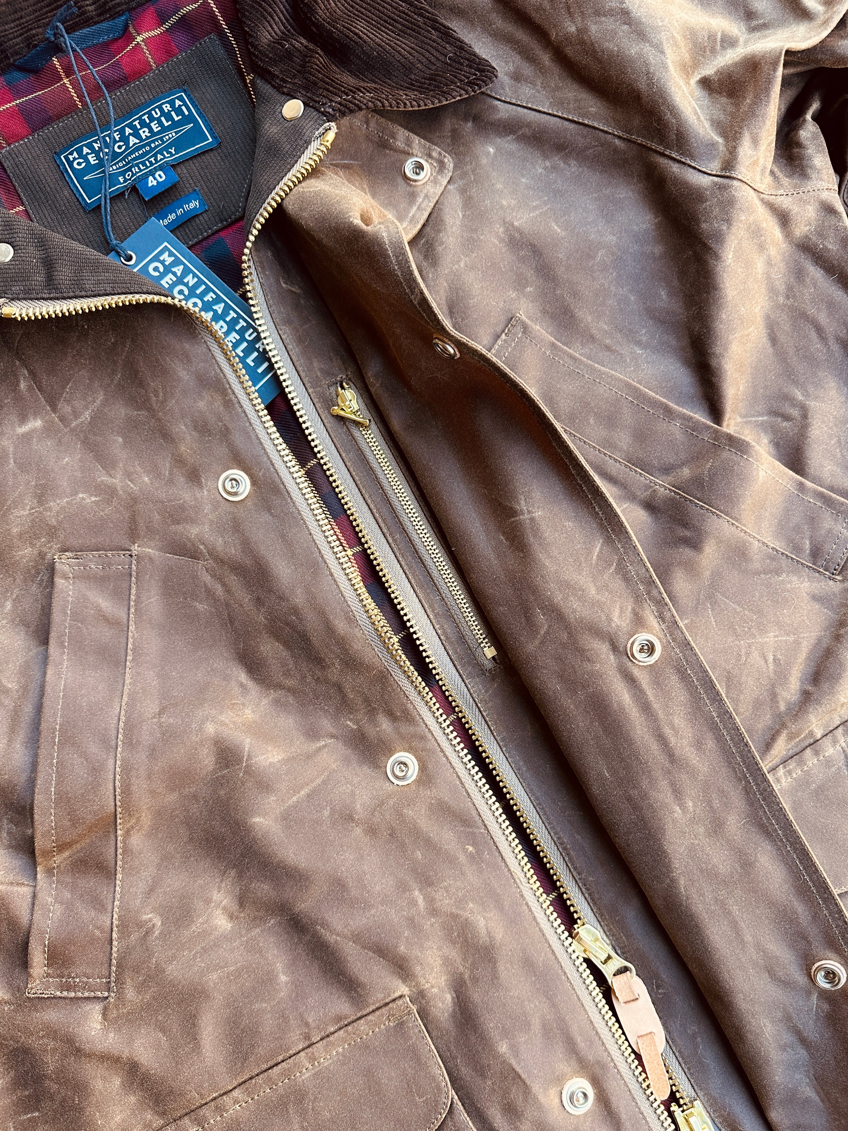 A perfect medium-weight jacket for spring and autumn, made of water repellent waxed cotton. The stitching thread is water repellent so as to increase resistance to rain penetration. The jacket is light and has an inner lining, an internal zipped security pocket and two back vents to be more comfortable when sitting. The front closure has a double-slider zip and a windproof flap with press studs. The snap buttons feature reinforcing natural leather disks.