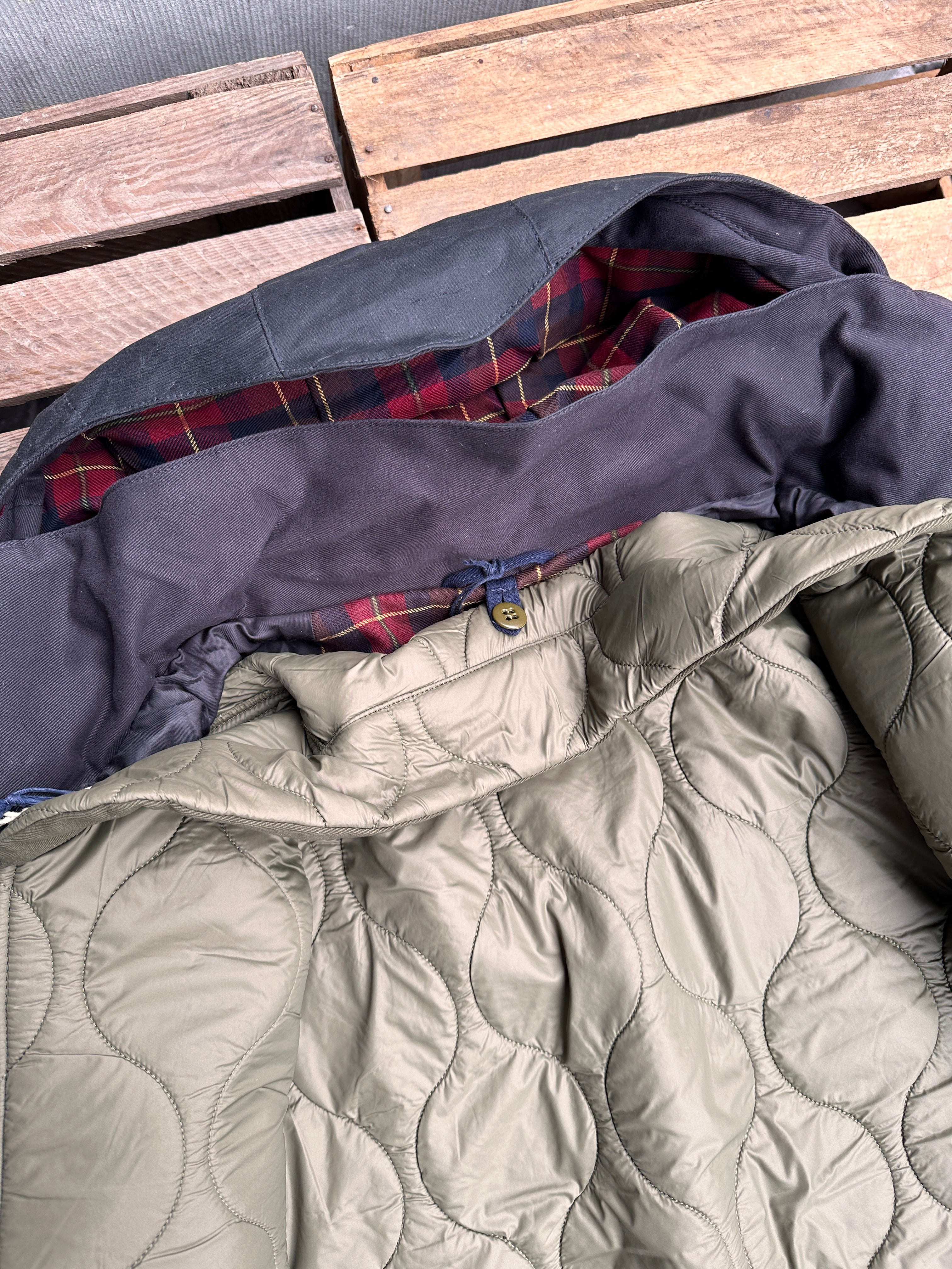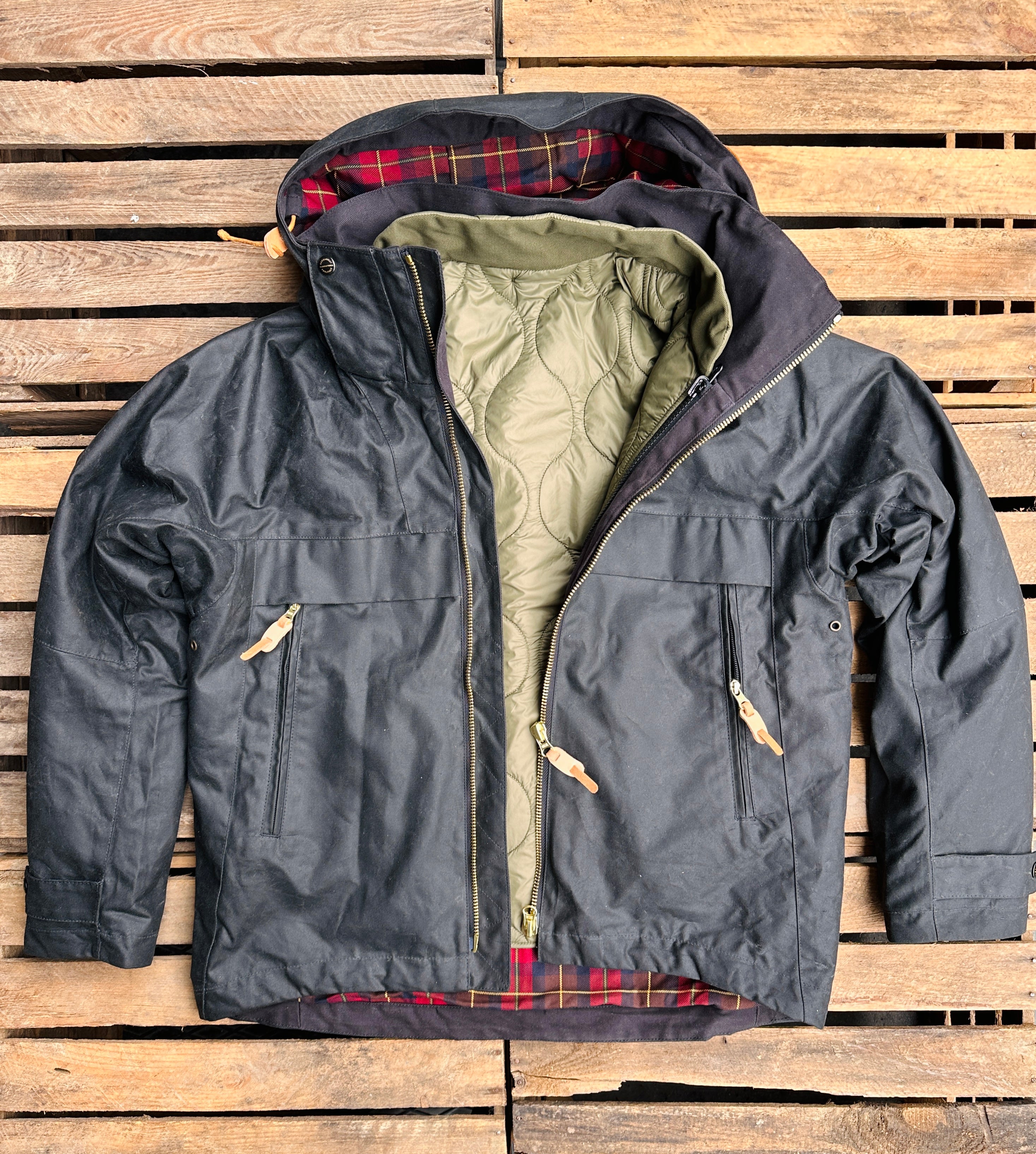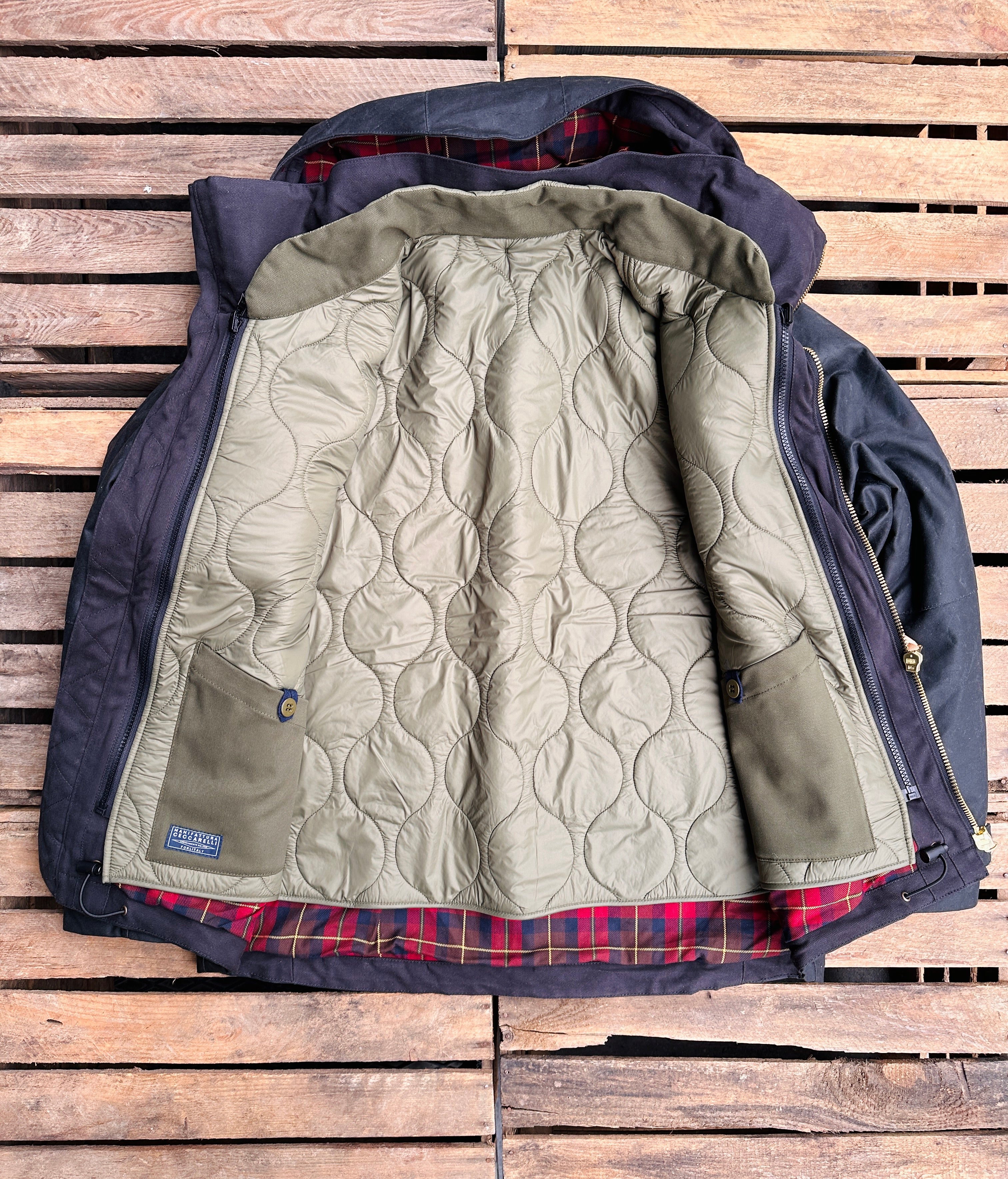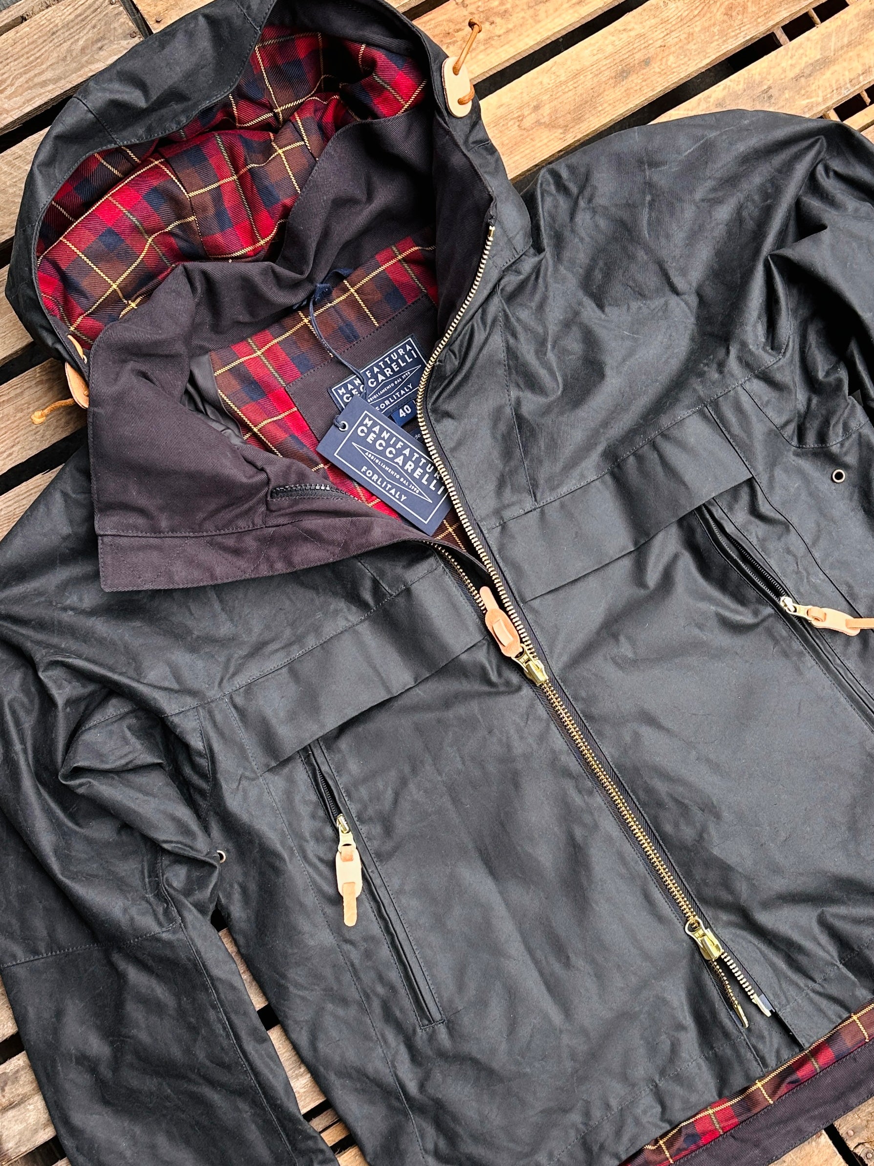 Made of paraffin and water-repellent fabric, it is our multifunctional jacket, it can be used as a mid-season jacket, as a last windproof and rainproof layer, or as a winter garment once the specially made 200 g wool wadding quilt is attached to the garment, style 7086-CB (Quilted Jacket/Liner).