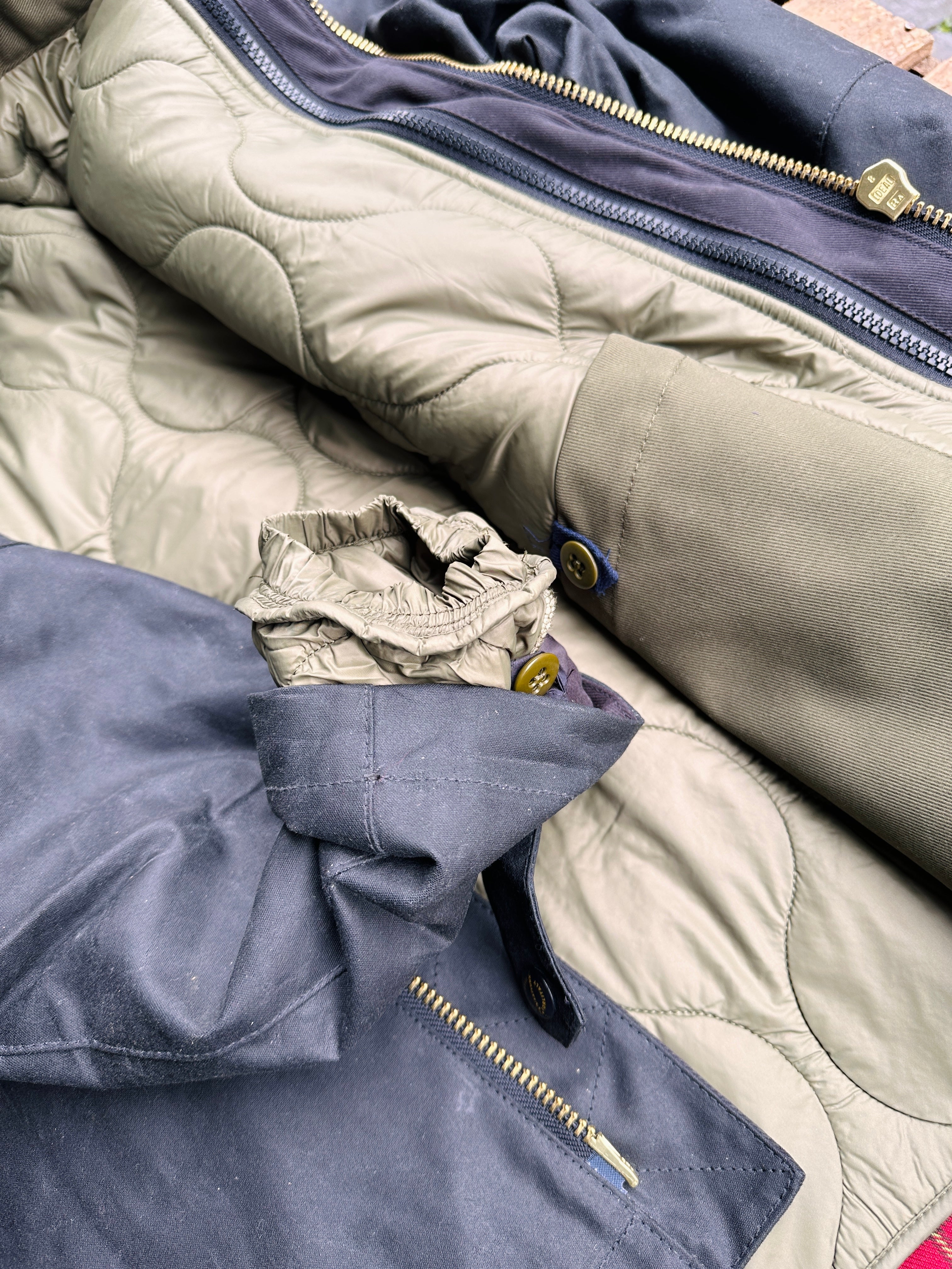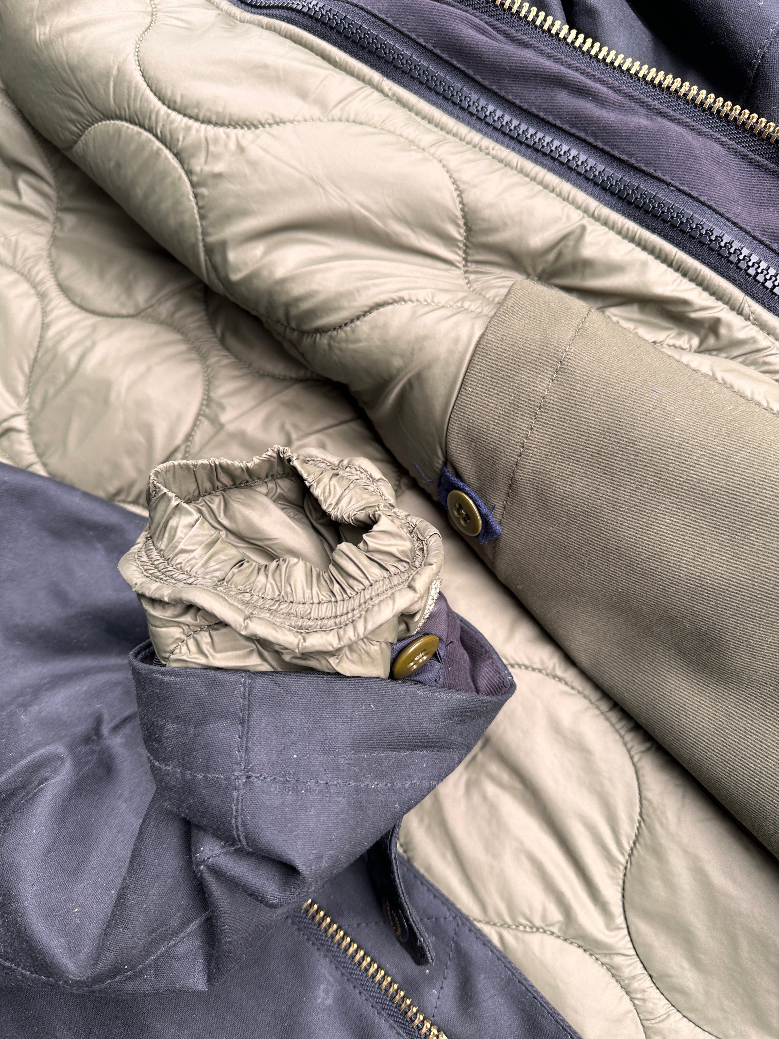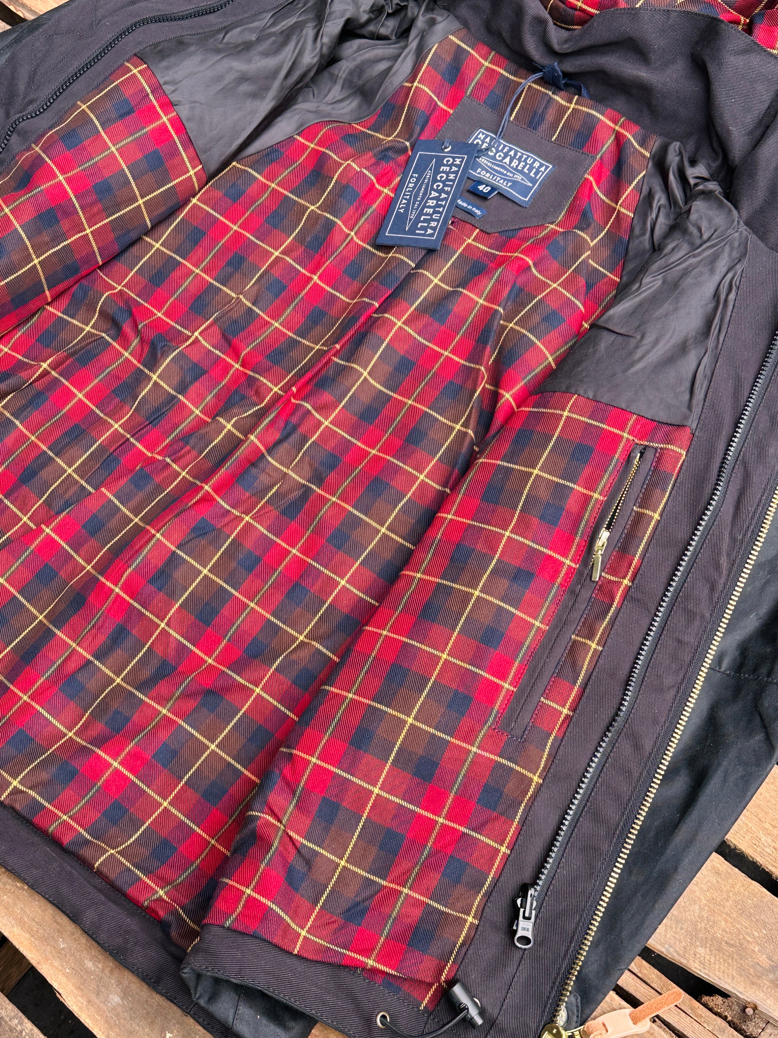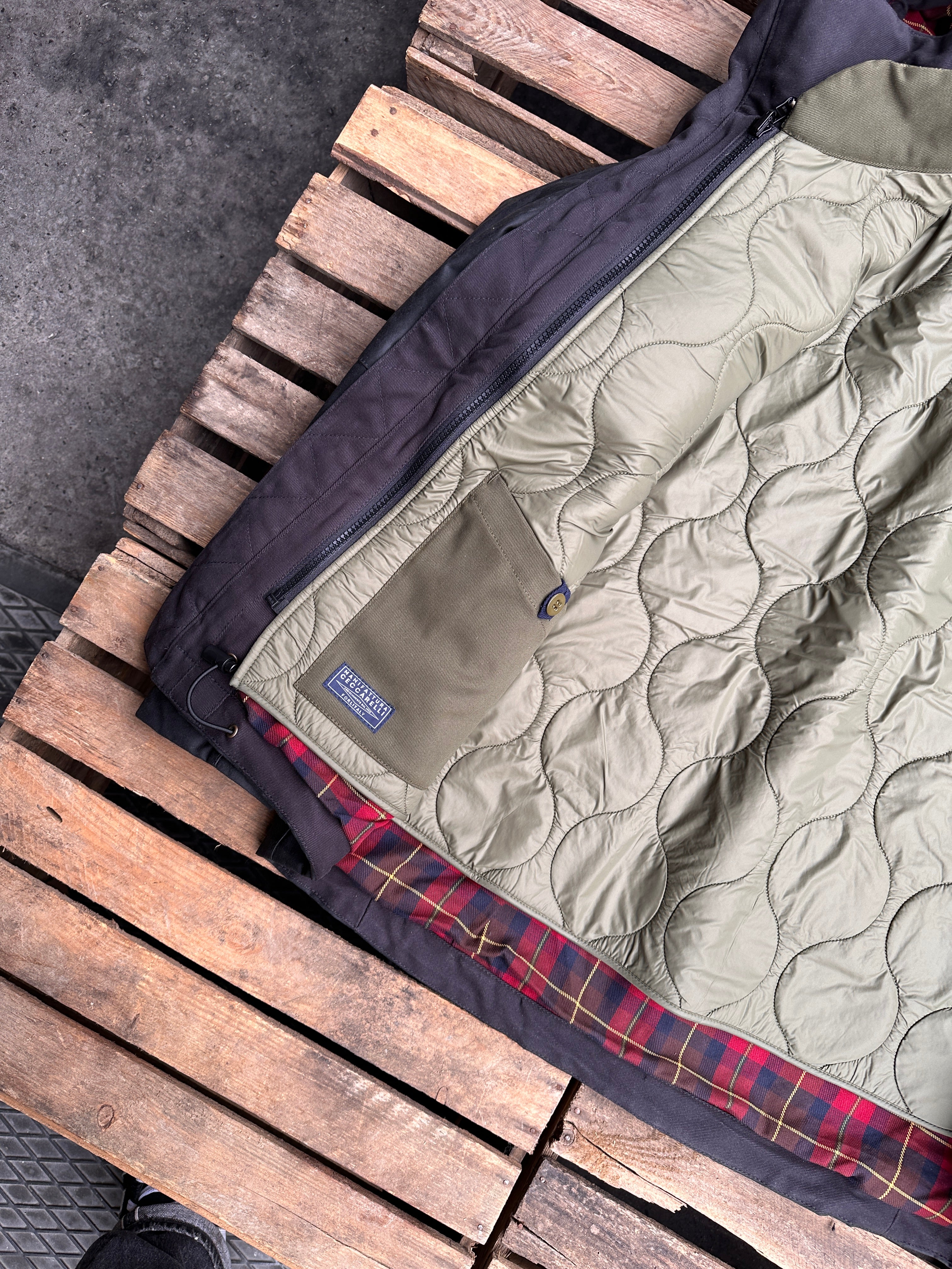 Made of paraffin and water-repellent fabric, it is our multifunctional jacket, it can be used as a mid-season jacket, as a last windproof and rainproof layer, or as a winter garment once the specially made 200 g wool wadding quilt is attached to the garment, style 7086-CB (Quilted Jacket/Liner).