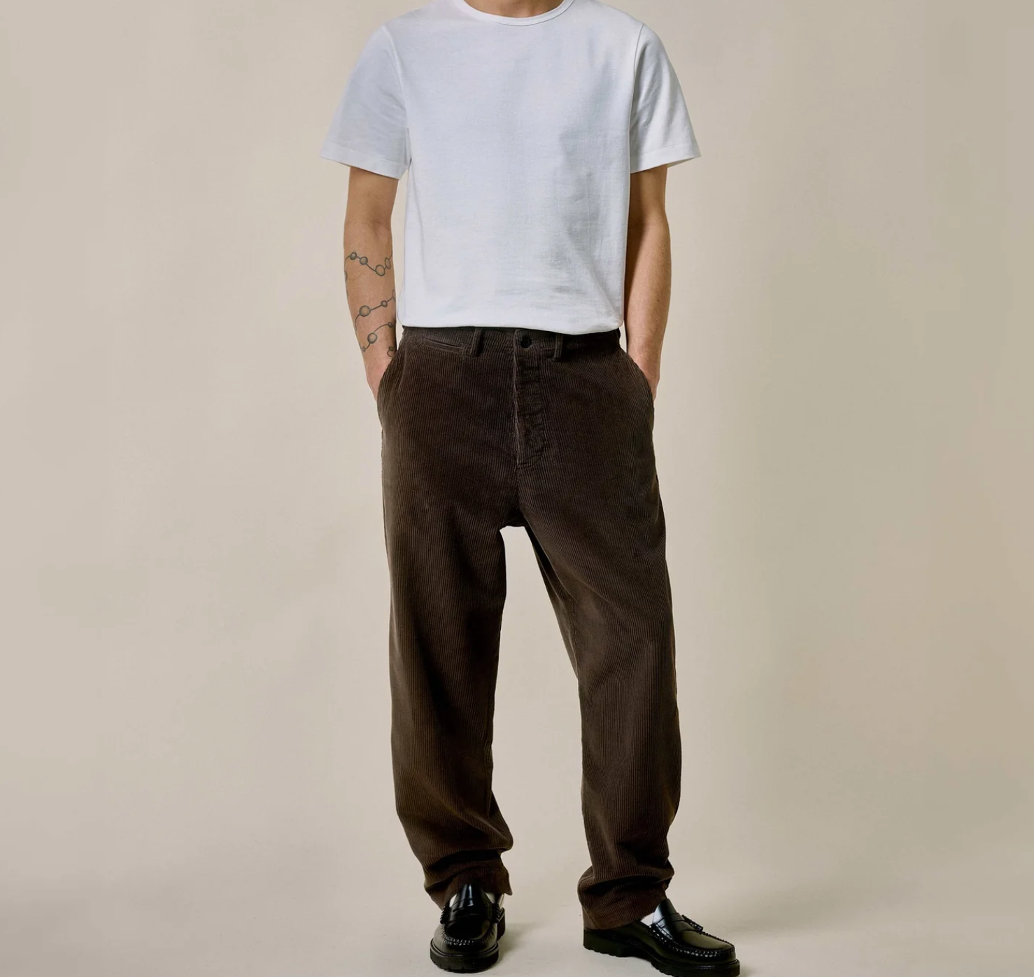 "Our very first Corduroy pants! This Chino sees our classic twill pants updated for autumn with bold corduroy. Made with 100% organic cotton, the garment has a relaxed fit elevated by pleats on the front and back, making them the perfect everyday pants to pair with your favorite T-shirt or sweatshirt."