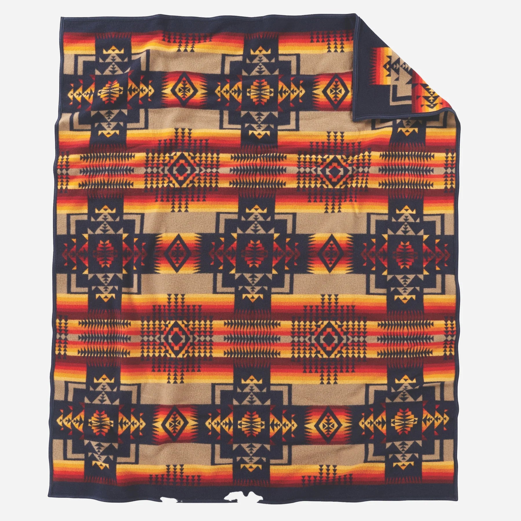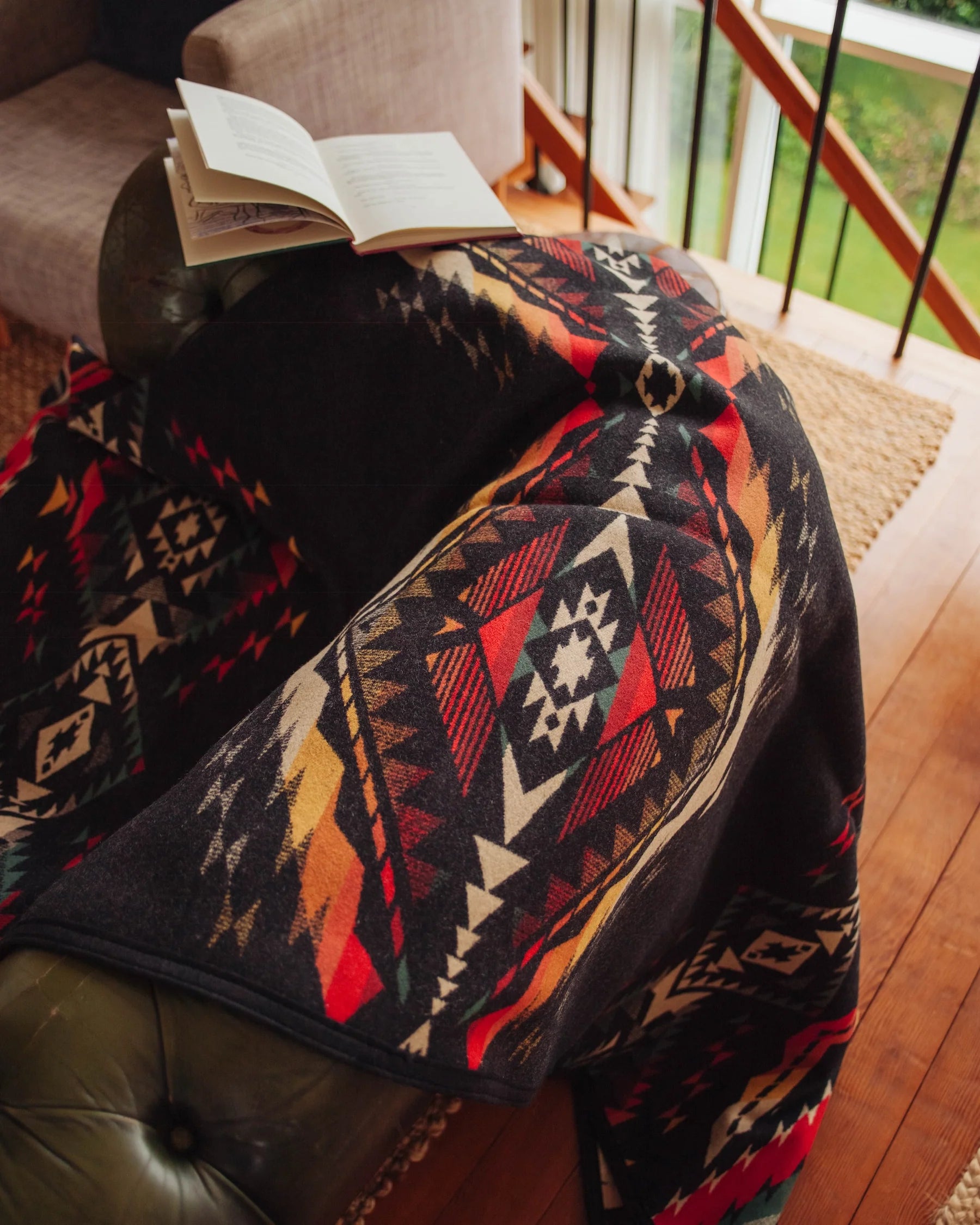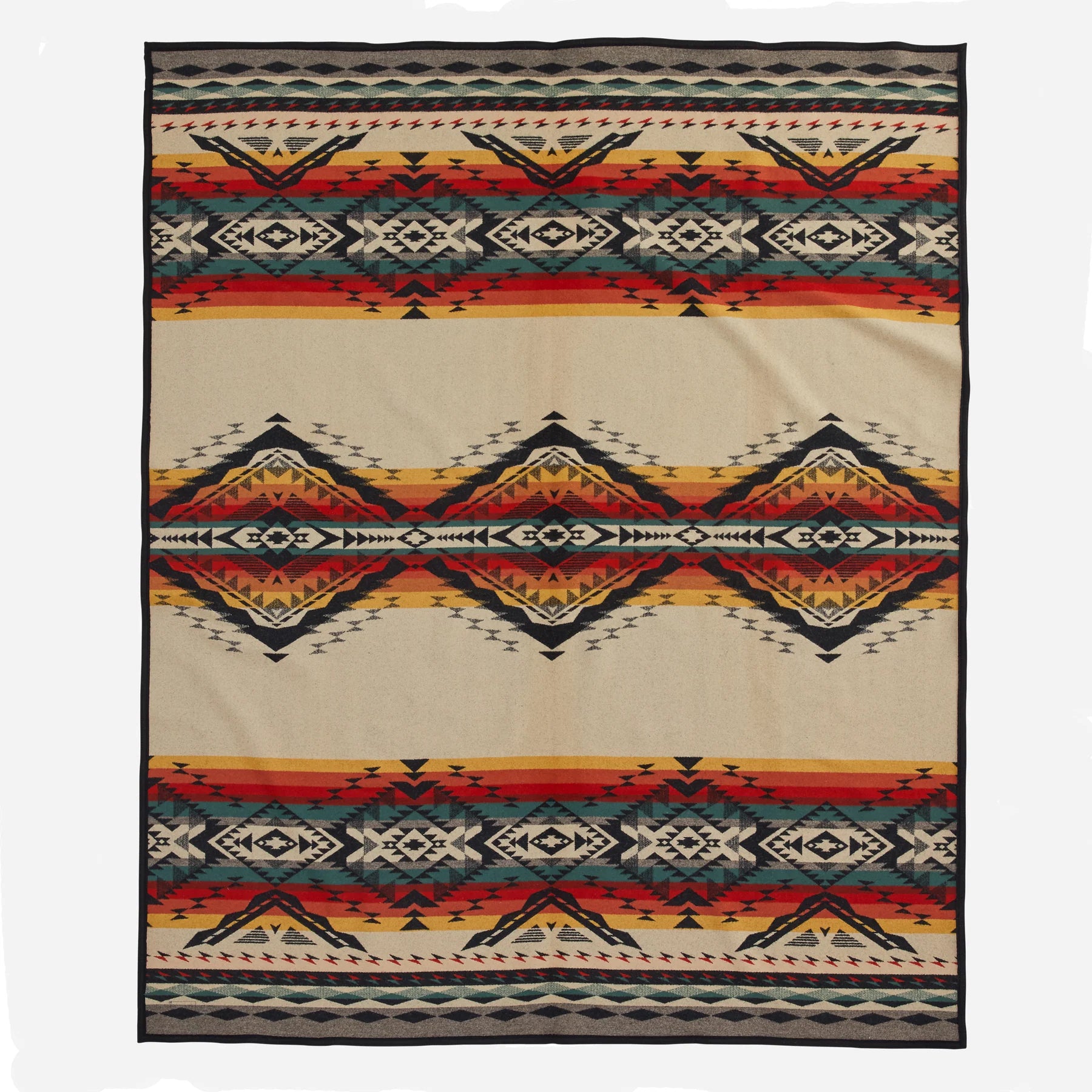 A made-in-USA wool blanket with a centered motif representing Bridge Creek, a sometimes calm, sometimes tempestuous, waterway running through Mitchell, Oregon. This tiny town once held a thriving business district; today, Mitchell welcomes travelers to the John Day Fossil Beds and the Painted Hills. In this pattern, layers of diamonds and zigzags represent colorful, complex hills of the area's dramatic geology.