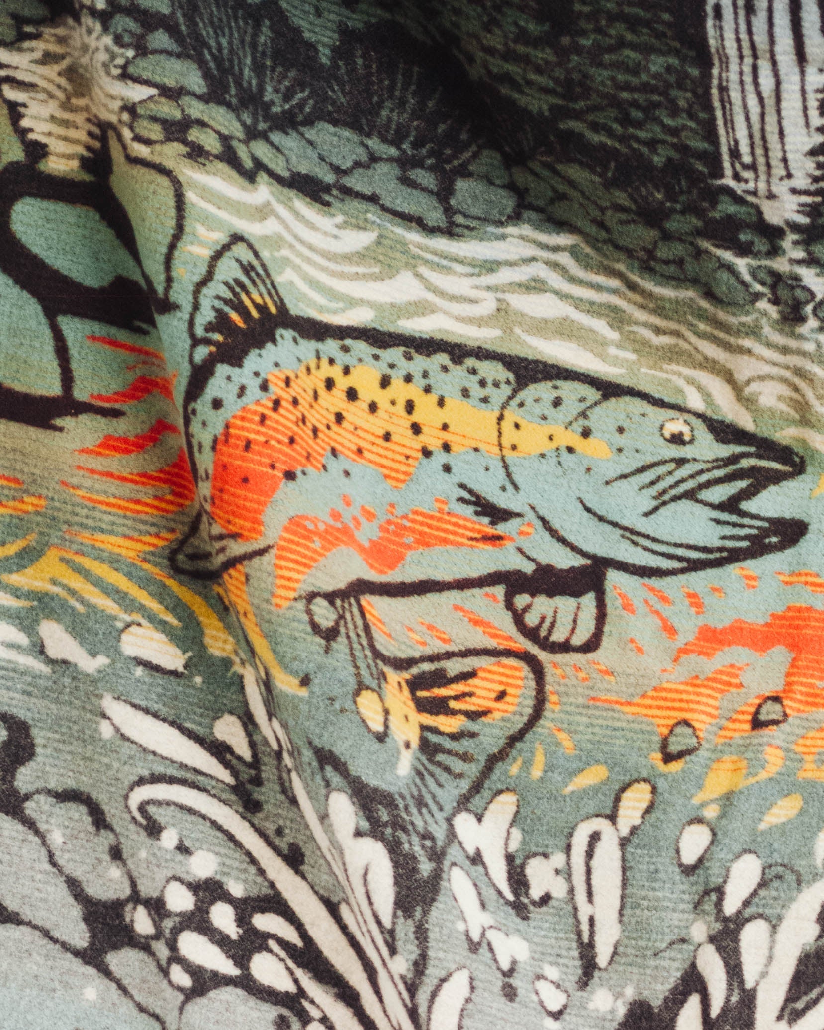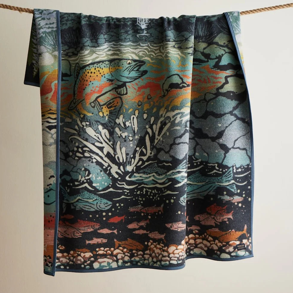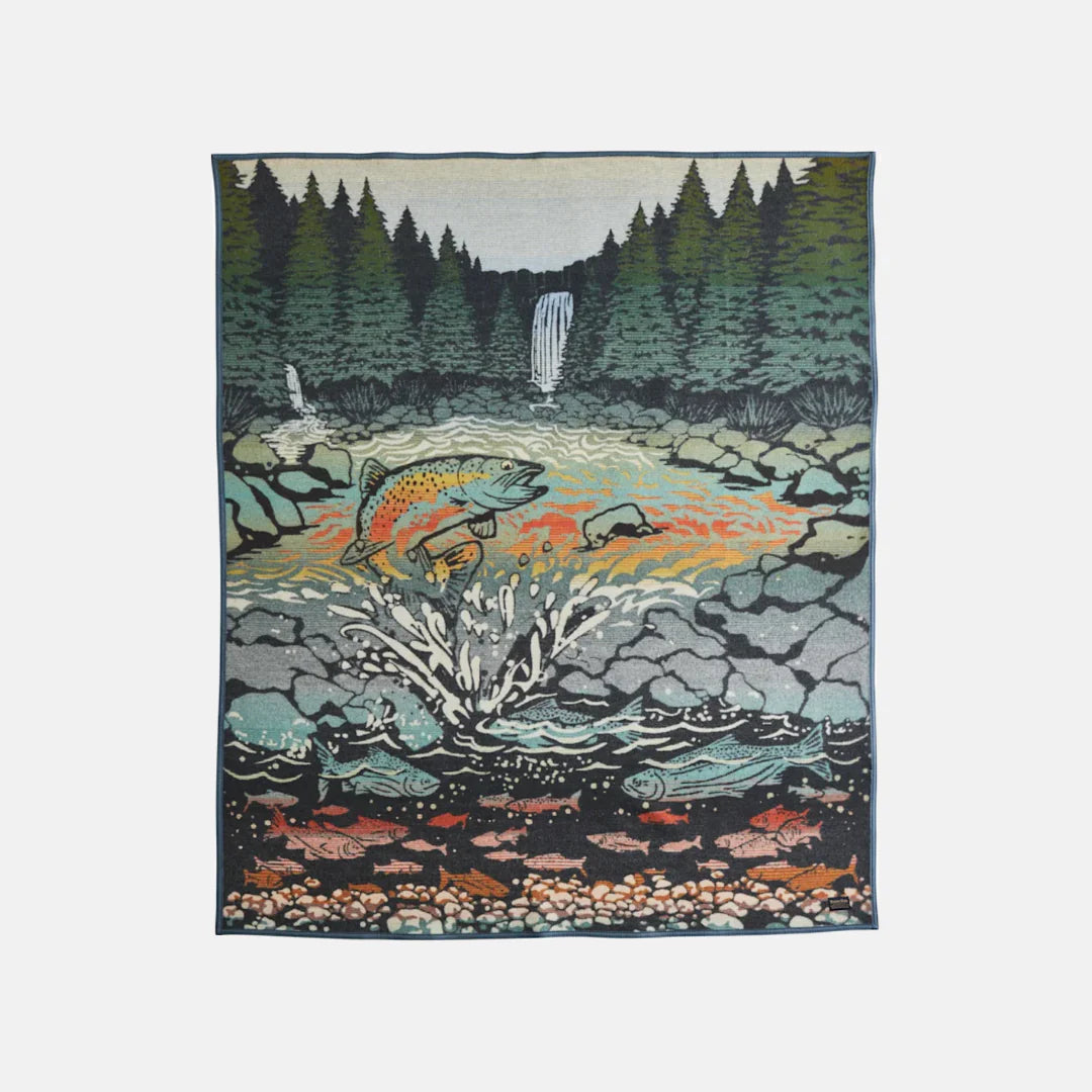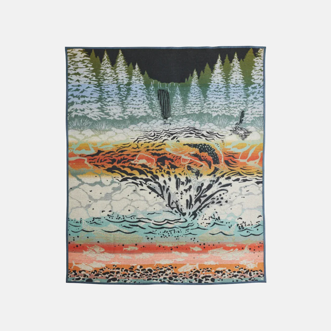 In a rich, saturated palette inspired by the Pacific Northwest, this blanket depicts a leaping Chinook salmon returning to the stream where he hatched—an arduous journey completed every year by these resilient creatures. Below him, the lifecycle of a salmon unfolds, from eggs to fry to smolt to adult.