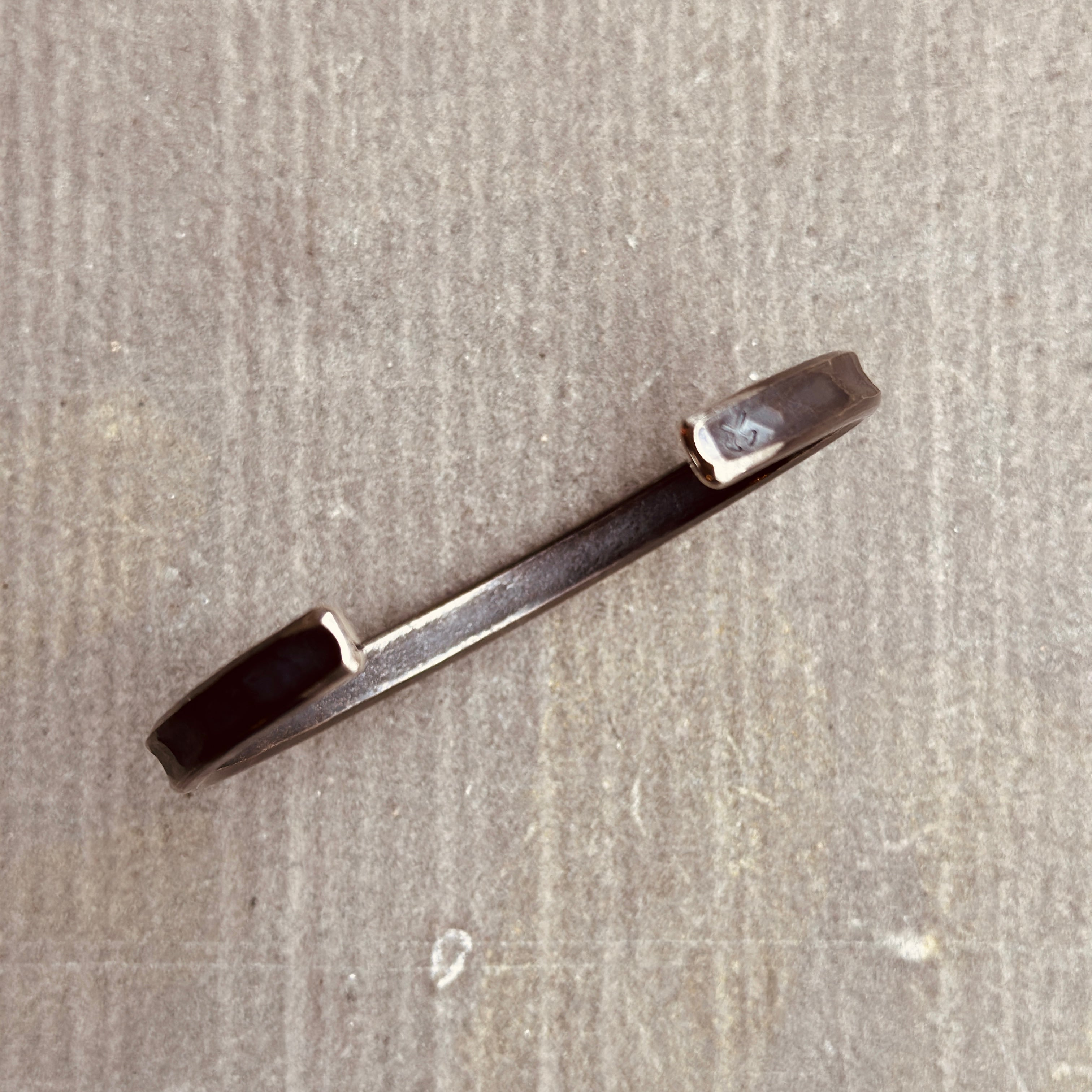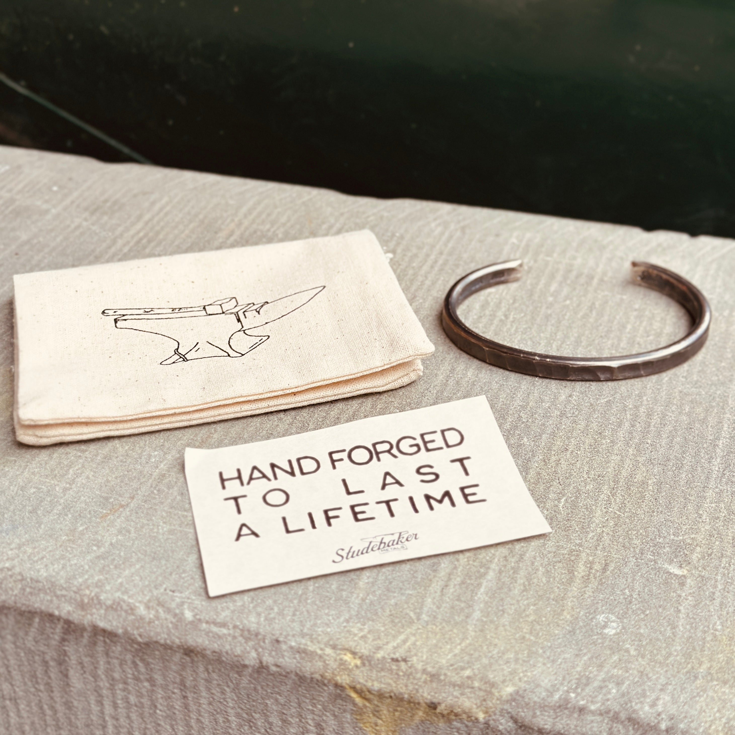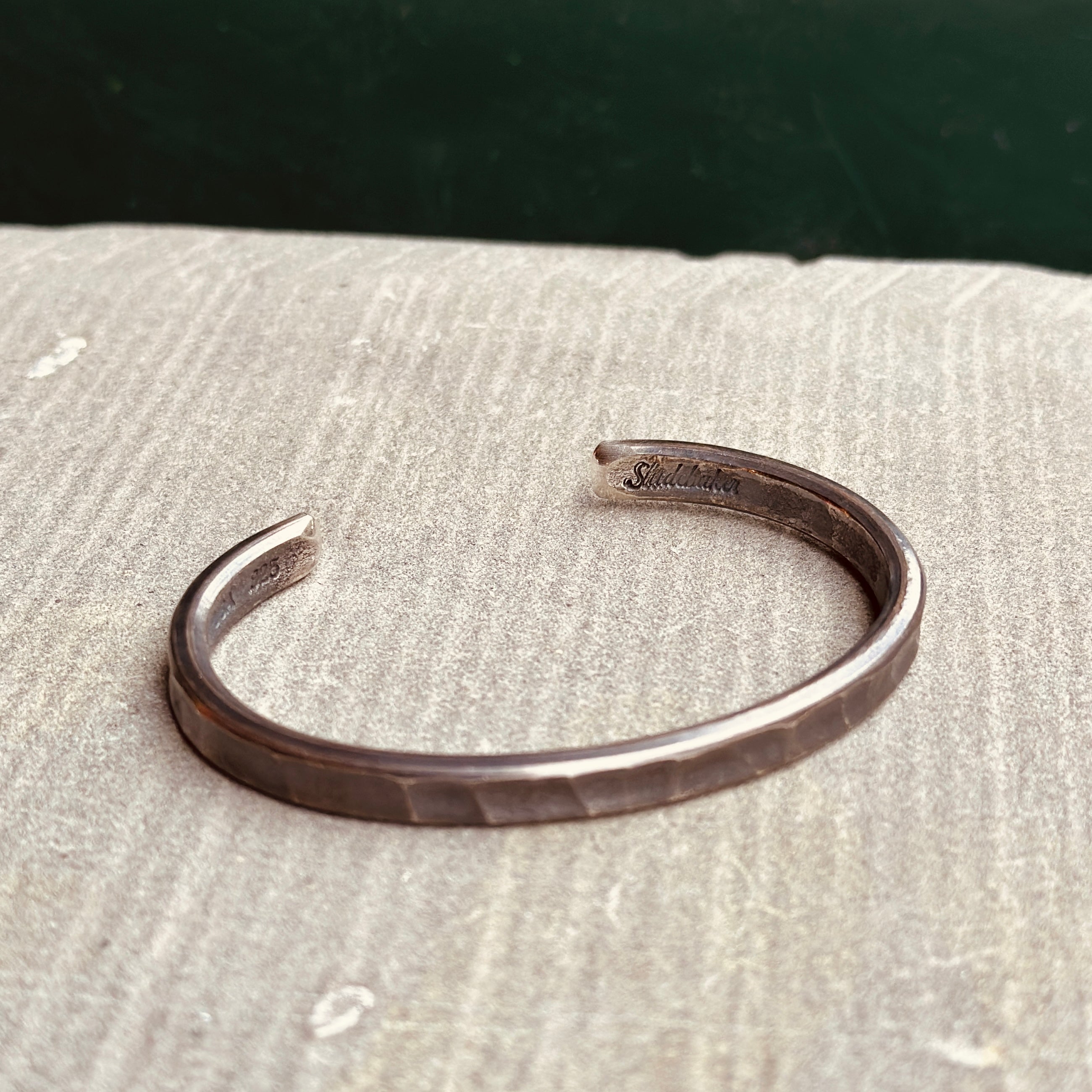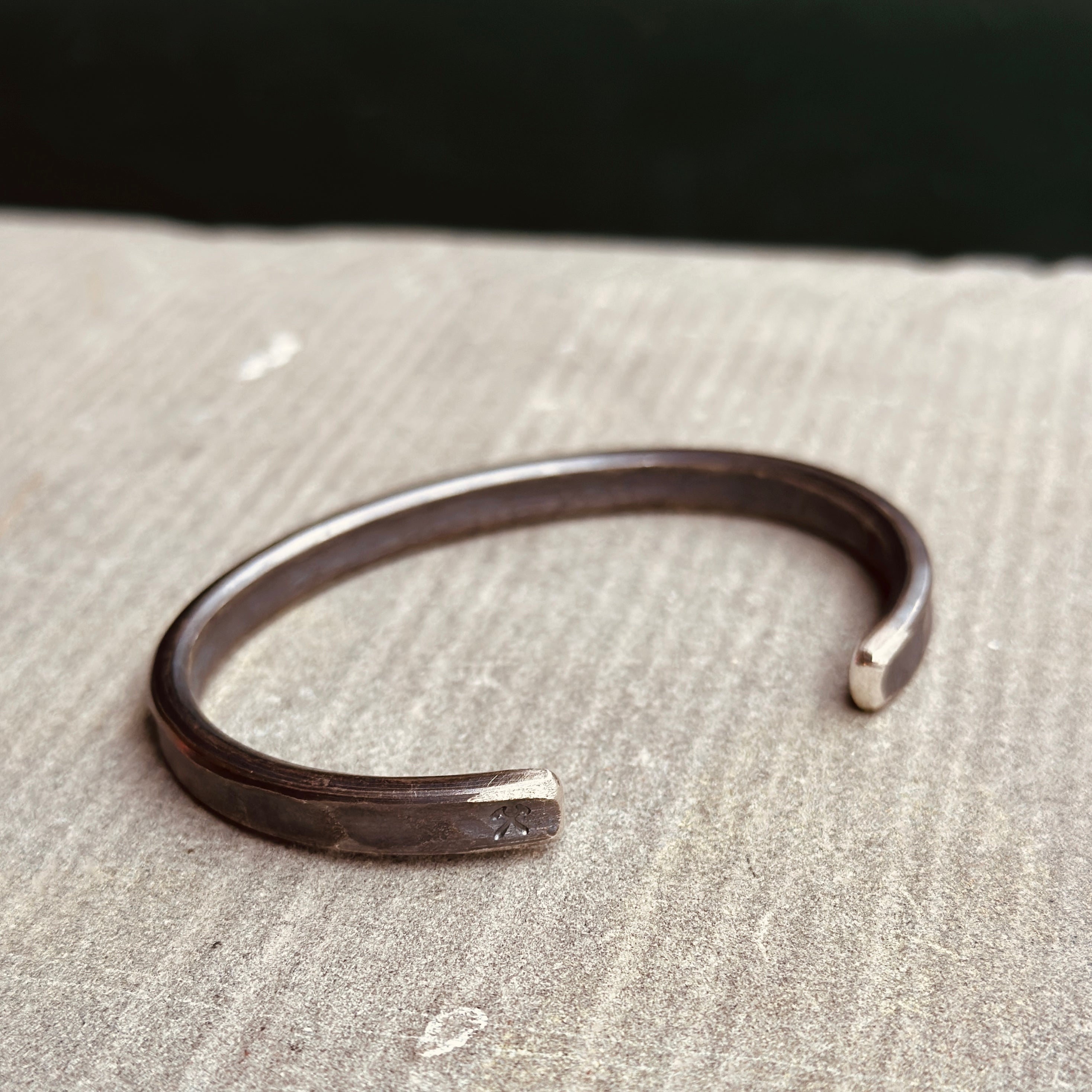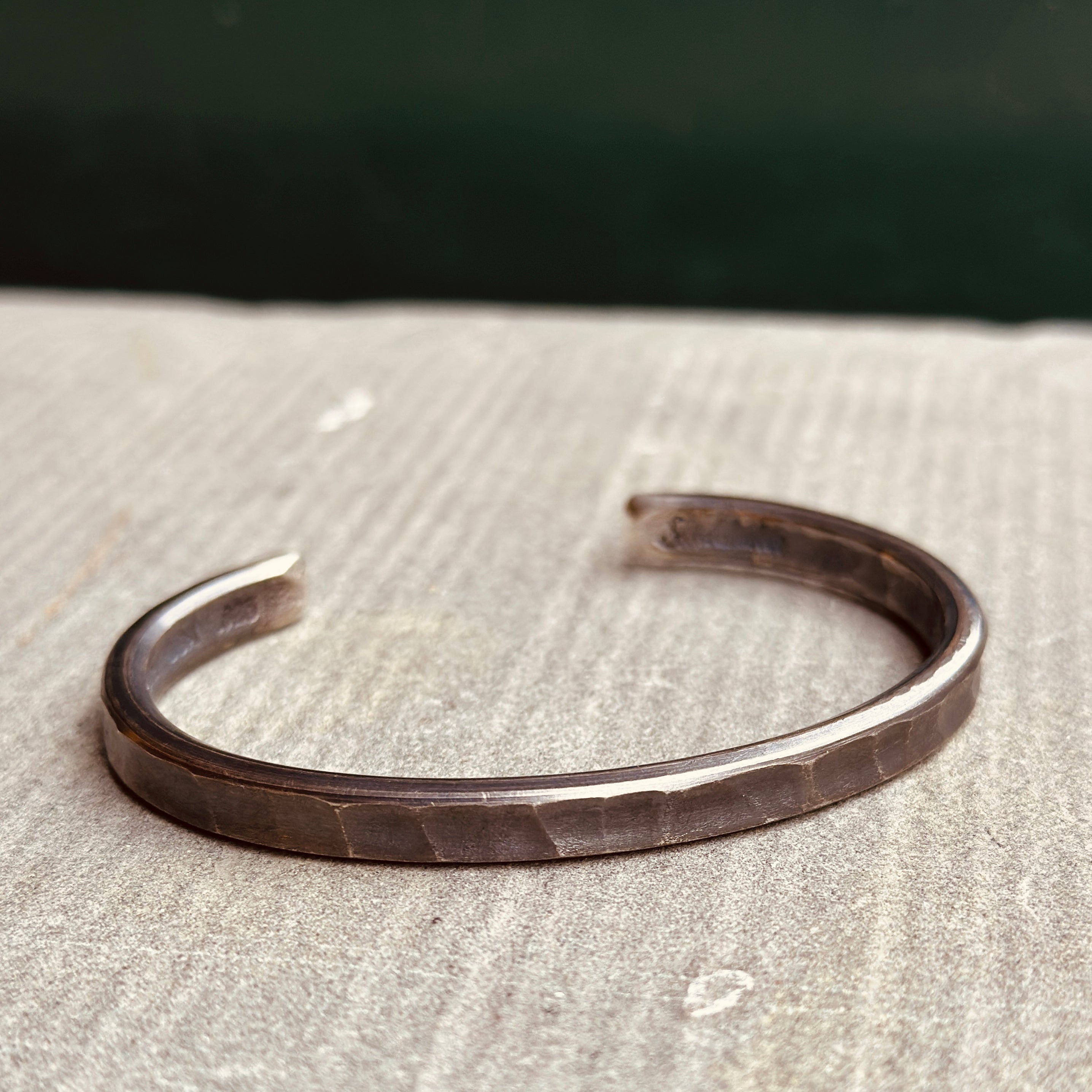- Hand-forged, heavyweight cuff with hammered surface.