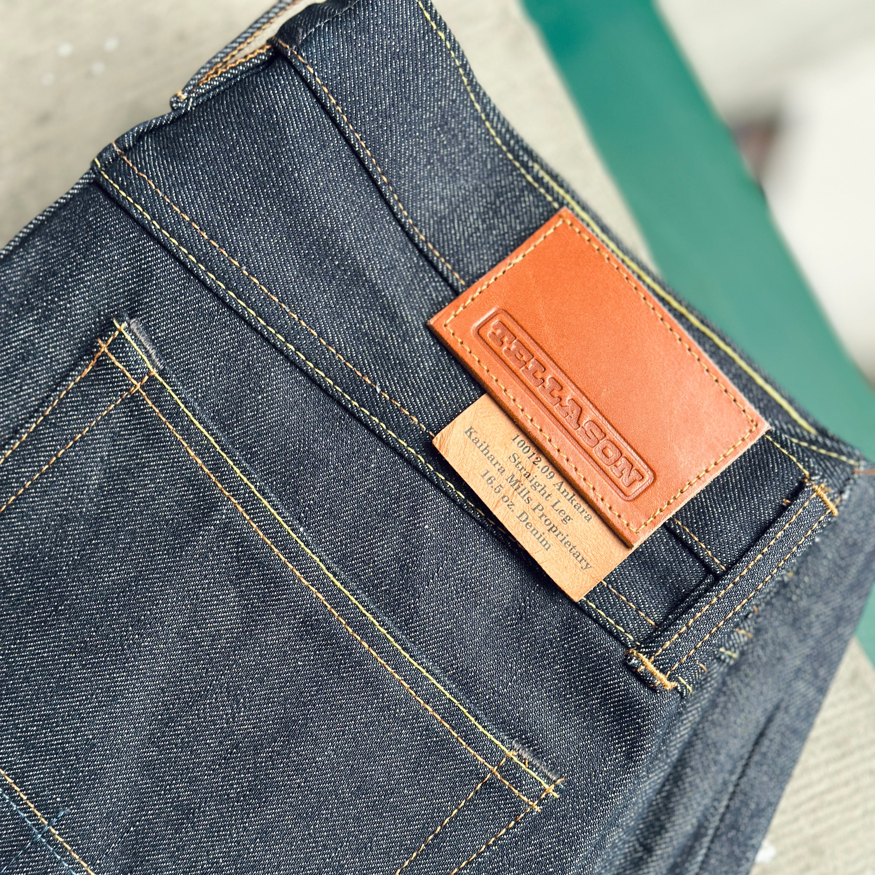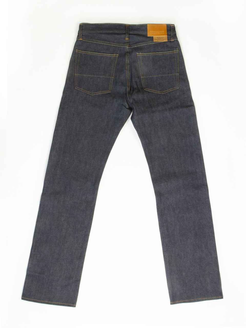 Tellason true straight leg fit. Made with the Tellason proprietary Kaihara Japanese orange line raw selvage denim (sanforized). Button fly. Extra heavy pocket bags. Bottom of back pockets lined for durability. Leather patch by Tanner Goods, Portland, OR. Graduated inseams from 34.25" to 35.75". Made in San Francisco, Calif. USA