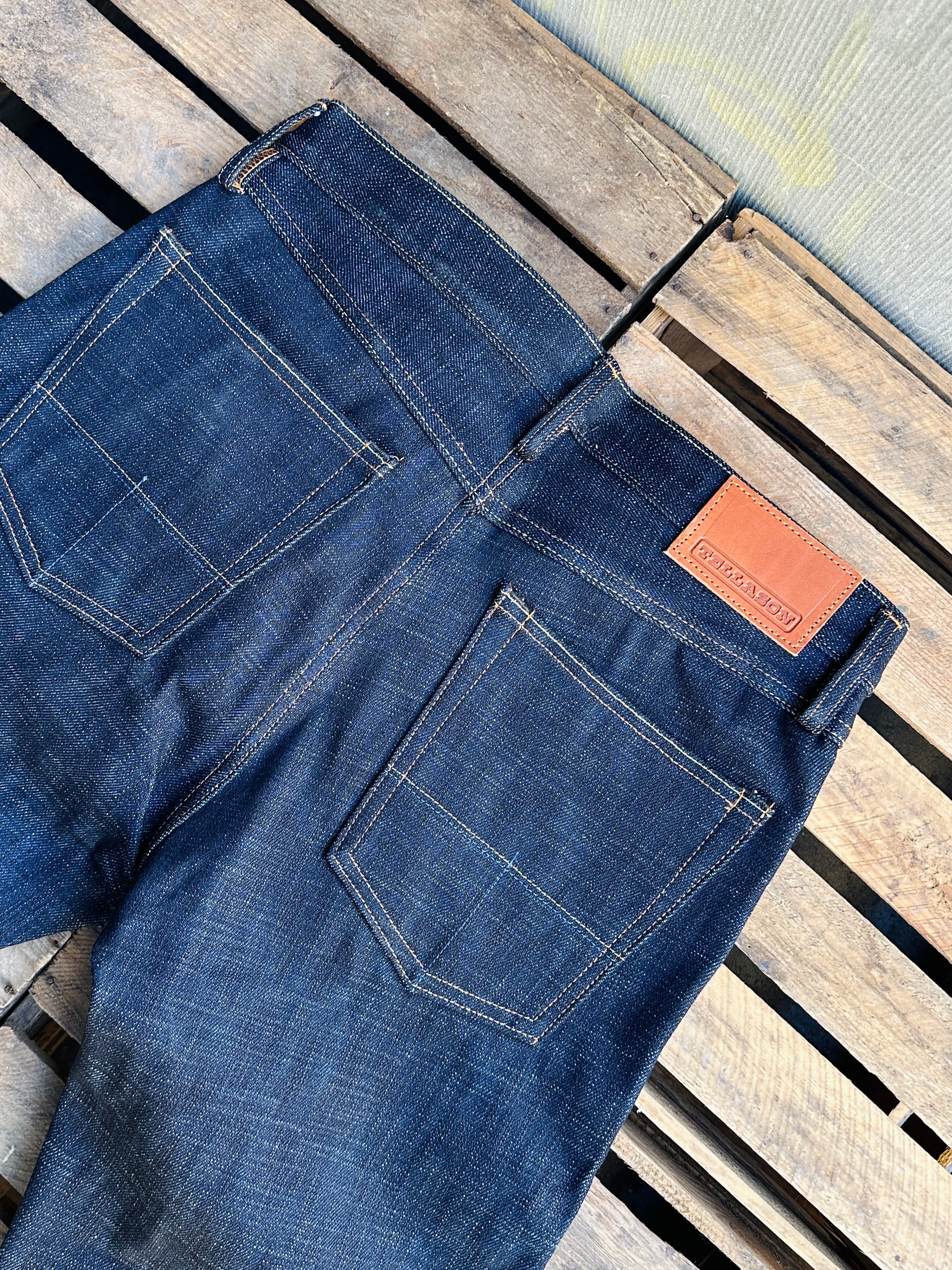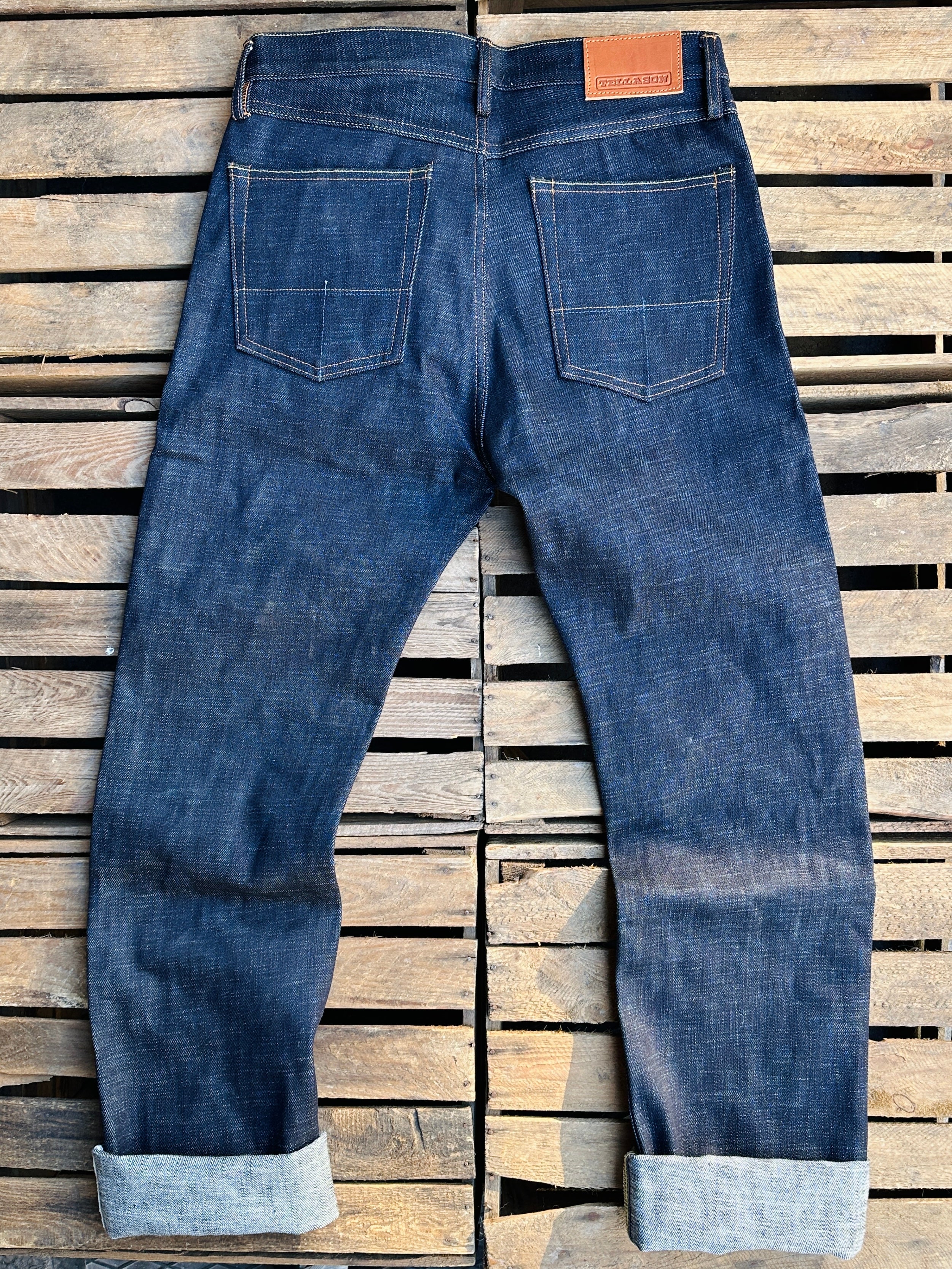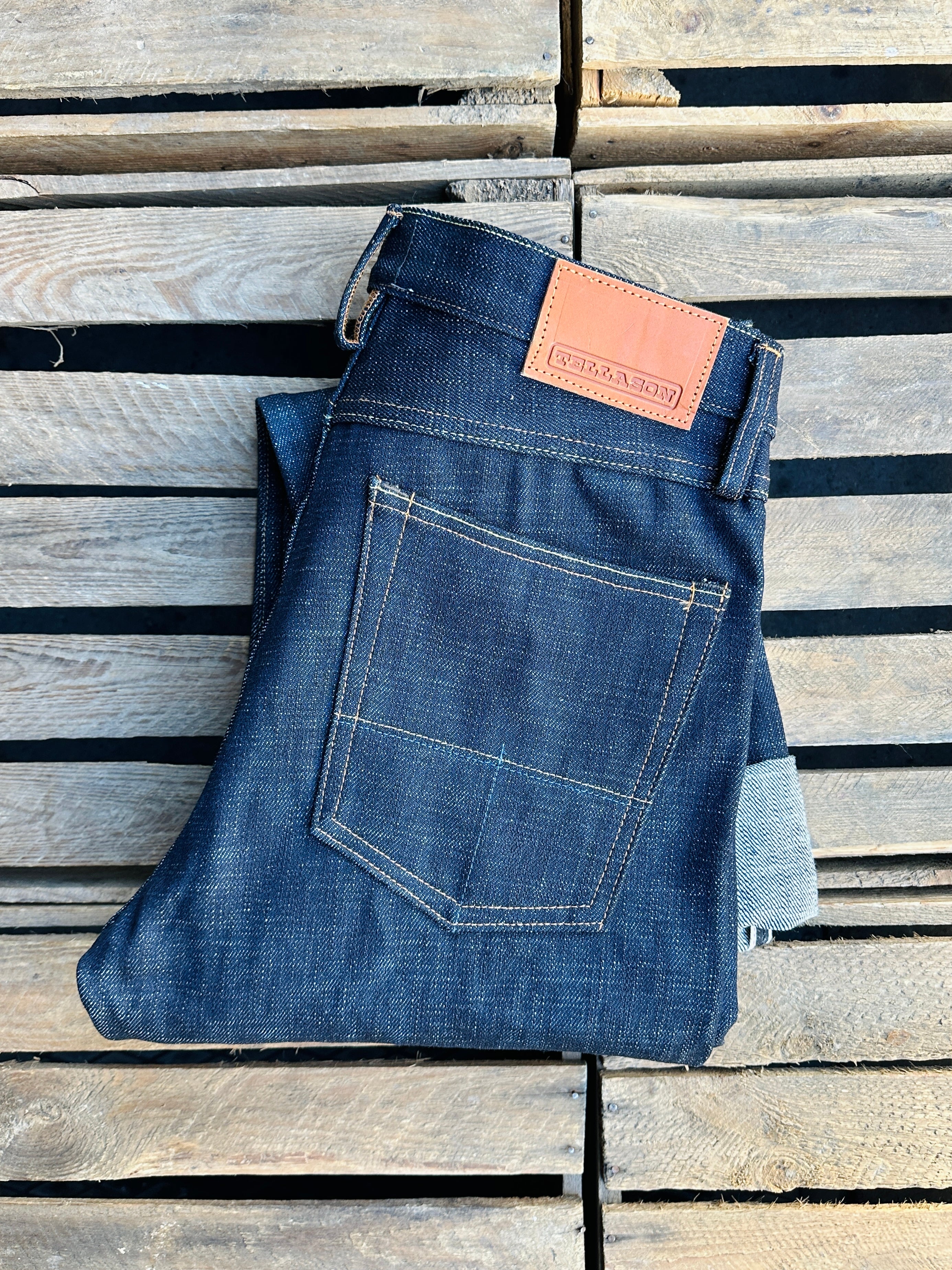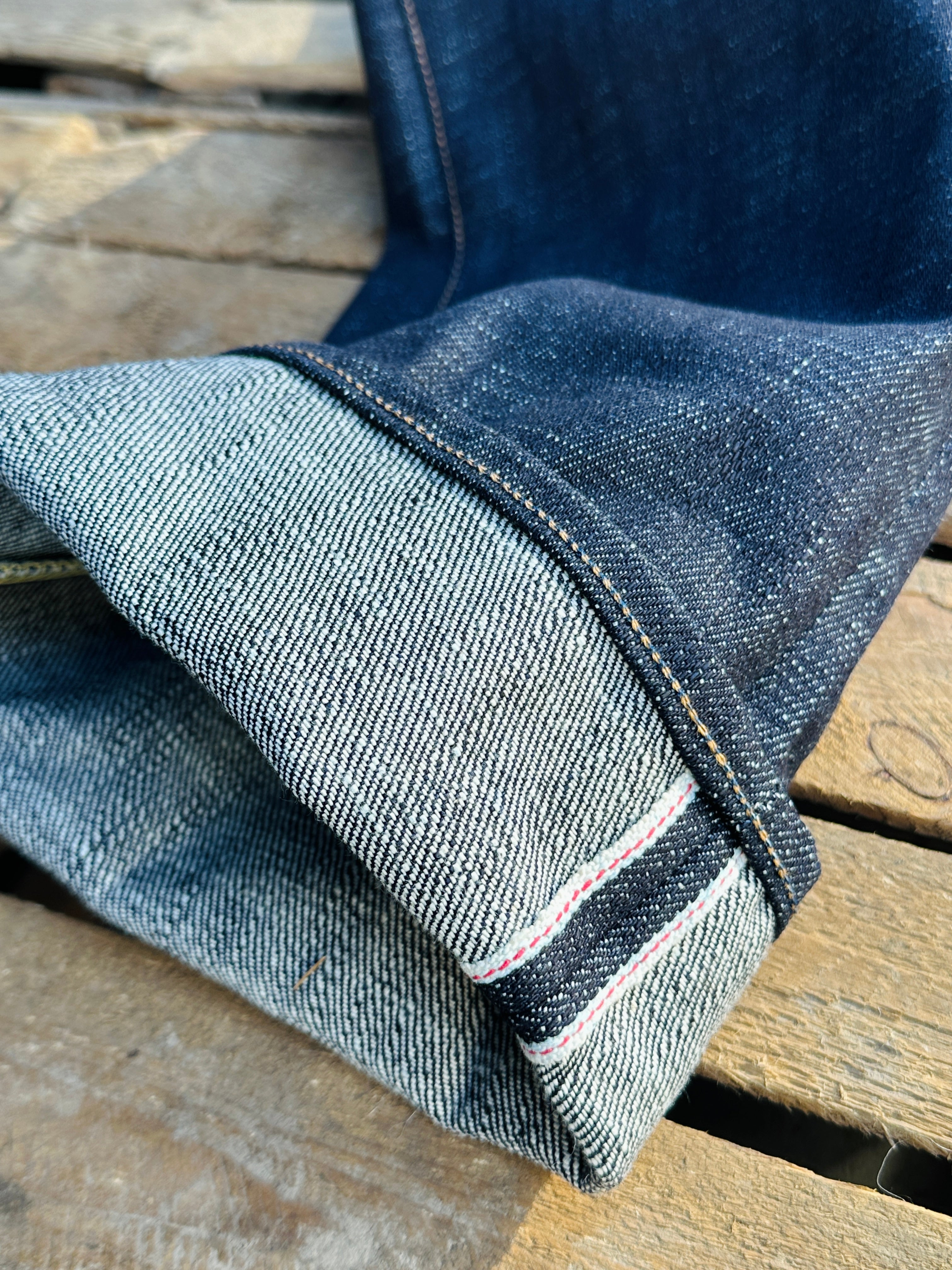 Rugged, heavyweight selvedge denim cut in a classic straight leg — substantial fabric and purposeful construction built to age with use.